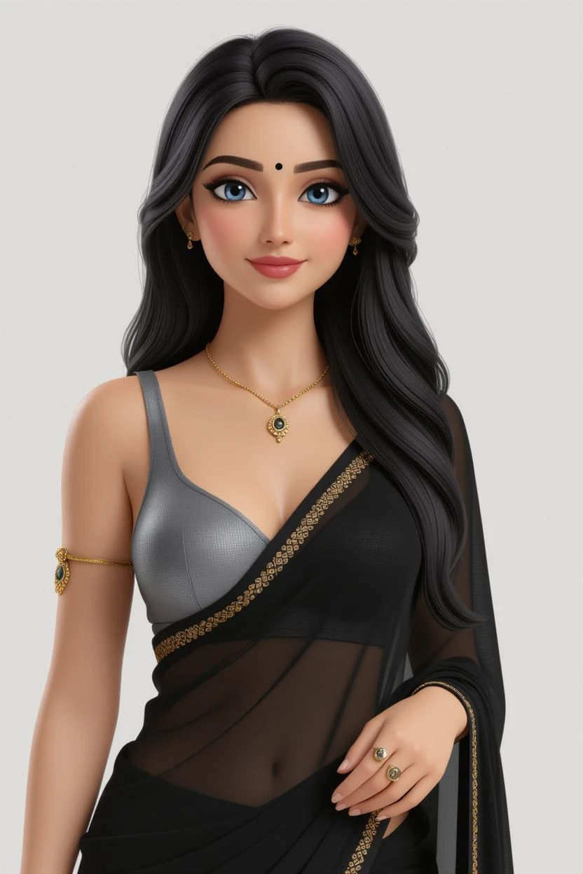ot1, black saree, black indian saree, black translucent saree, traditional saree, grey sleeveless blouse, sleeveless grey bra, 1girl, solo, blue eyes, black hair, jewelry, breasts, long hair, earrings, necklace, bra, cleavage, underwear, looking at viewer, smile, medium breasts, white background, armlet, dark skin, dark-skinned female, simple background, lips