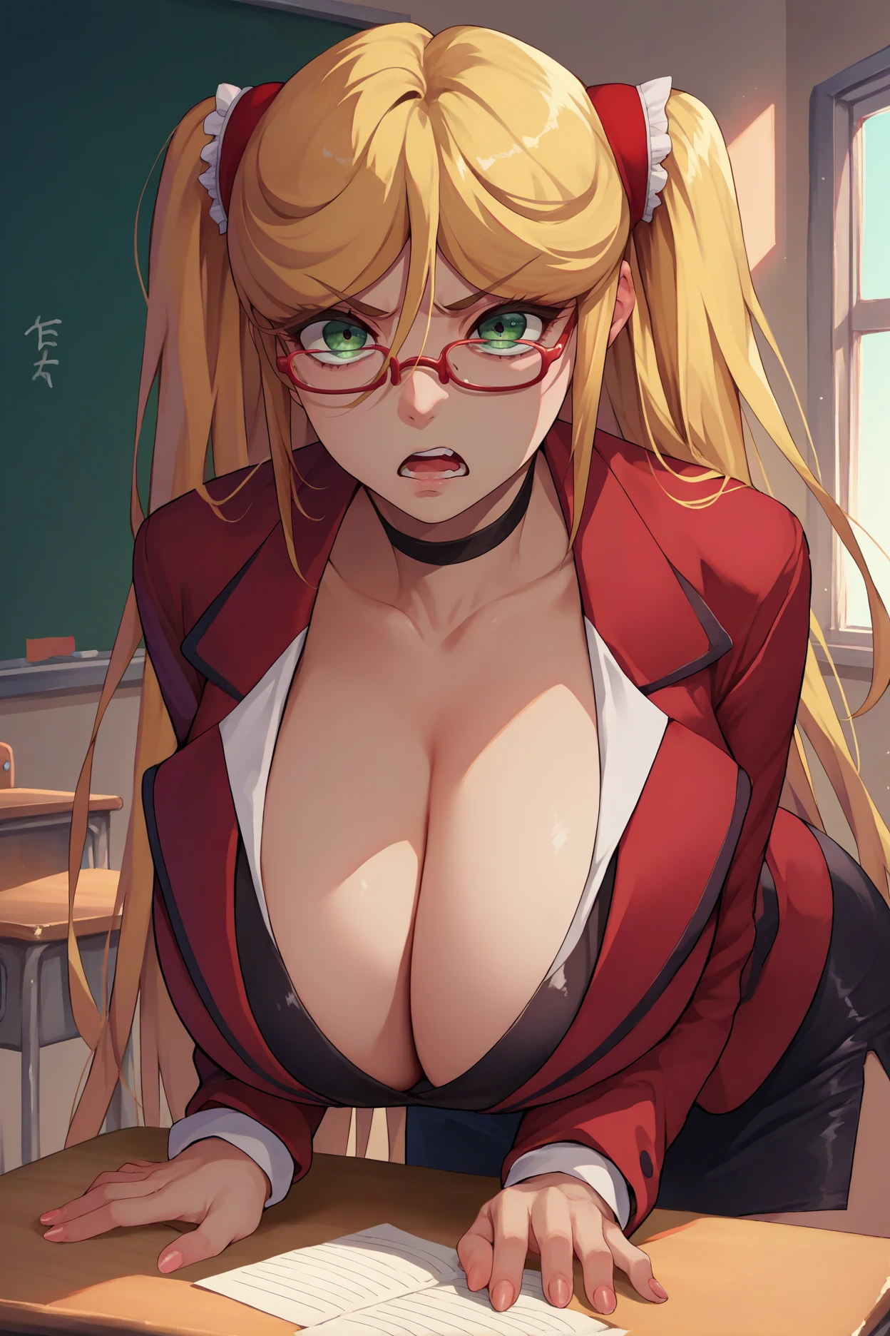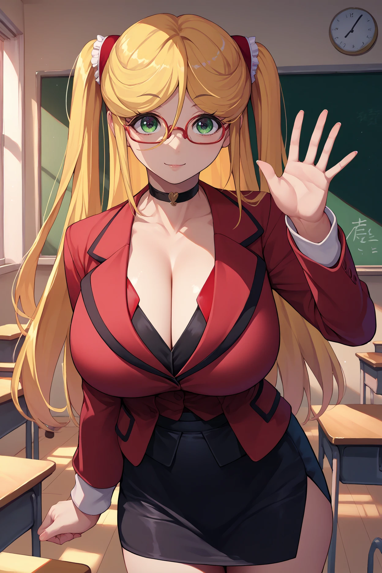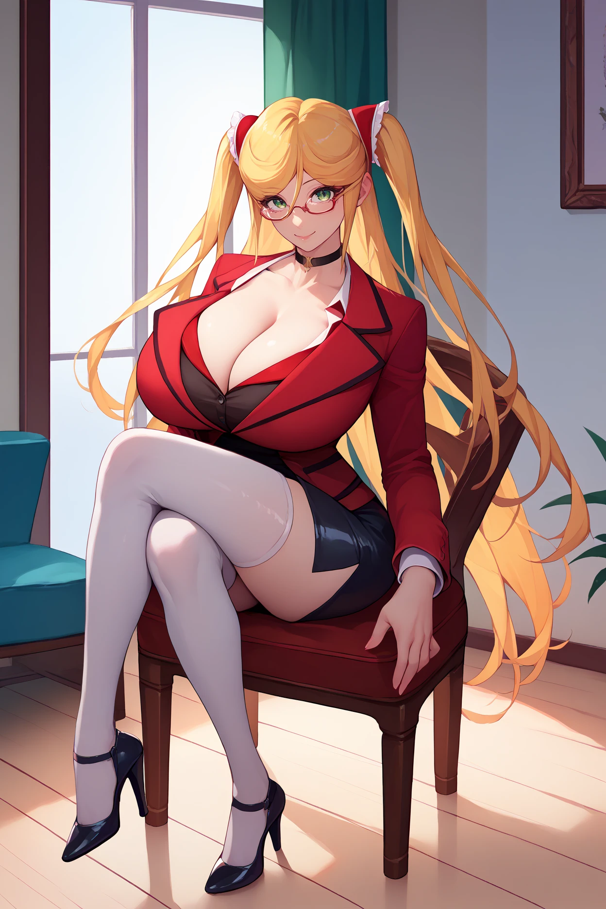 Add "altKosaka, blonde hair, two side up, long hair, glasses, choker, red blazer, cleavage, black skirt, white thighhighs, high heels" for her casual outfit.