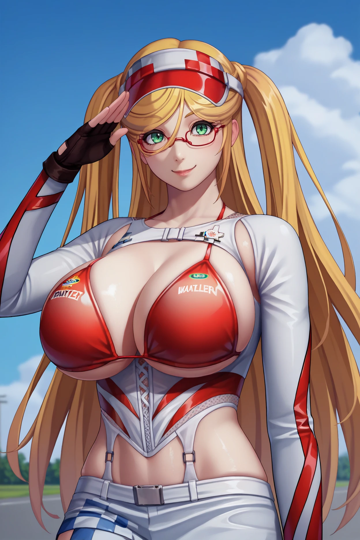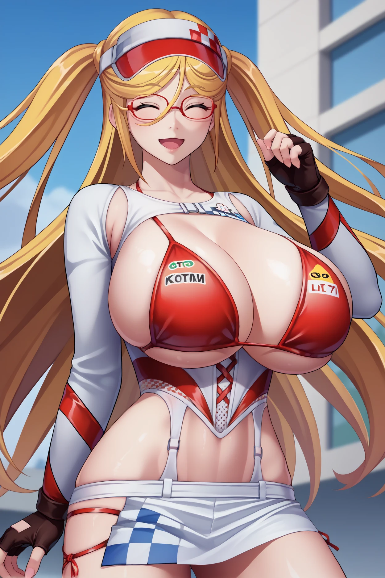 Add "rqKosaka, blonde hair, long hair, two side up, glasses, visor cap, white sleeves, race queen, red bikini top, white miniskirt, fingerless gloves, red thighhighs" for her race queen outfit.