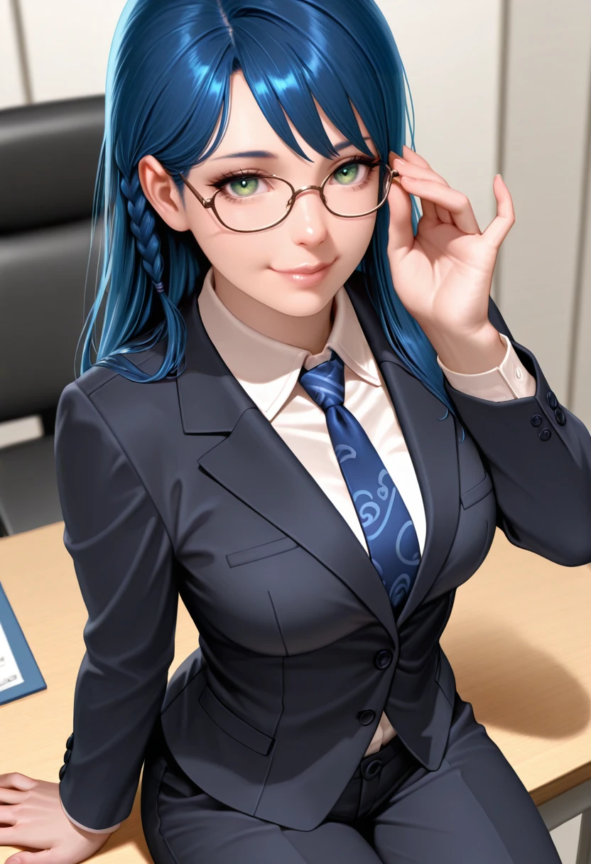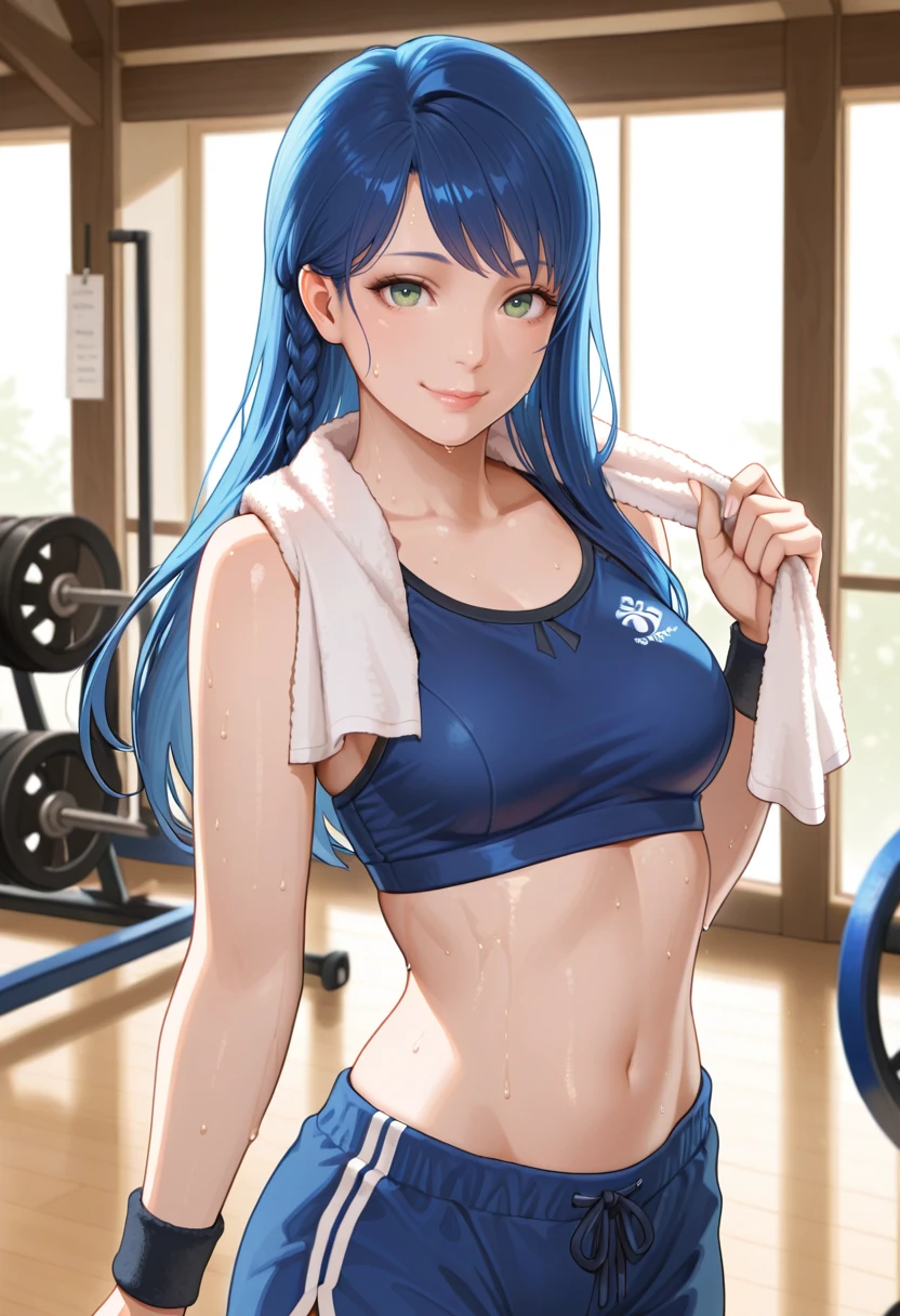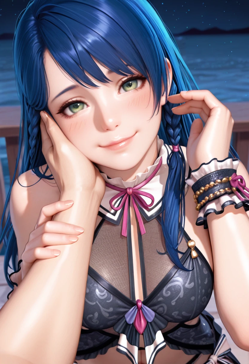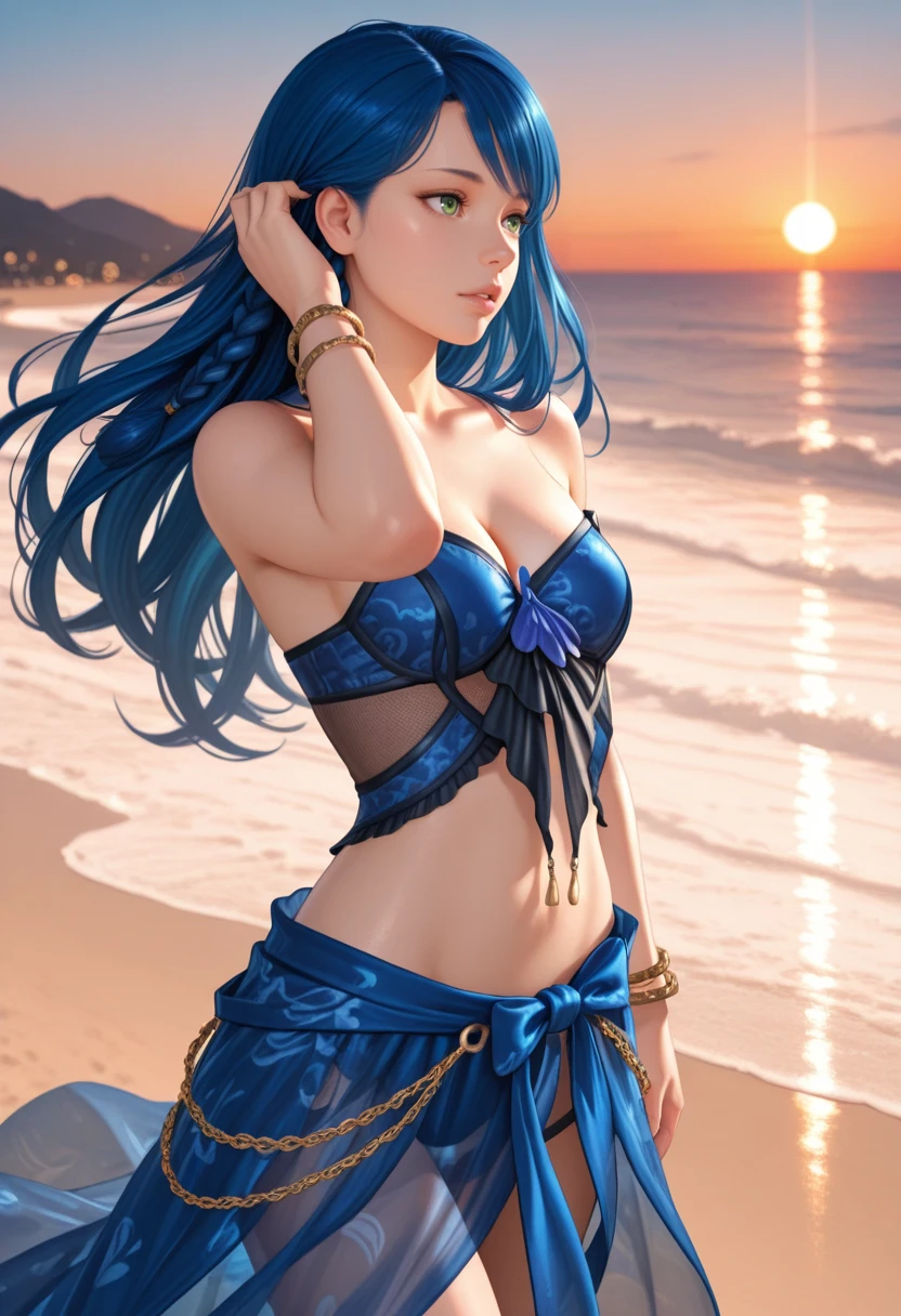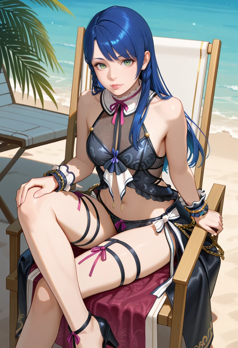 "L0BXVV,blue hair, long hair, braid, green eyes, lips, swimsuit, collar, pink ribbon, negiglee, navel, panties, multiple ribbons, coattails, gold chain, cross-laced legwear, frilled bracelet"