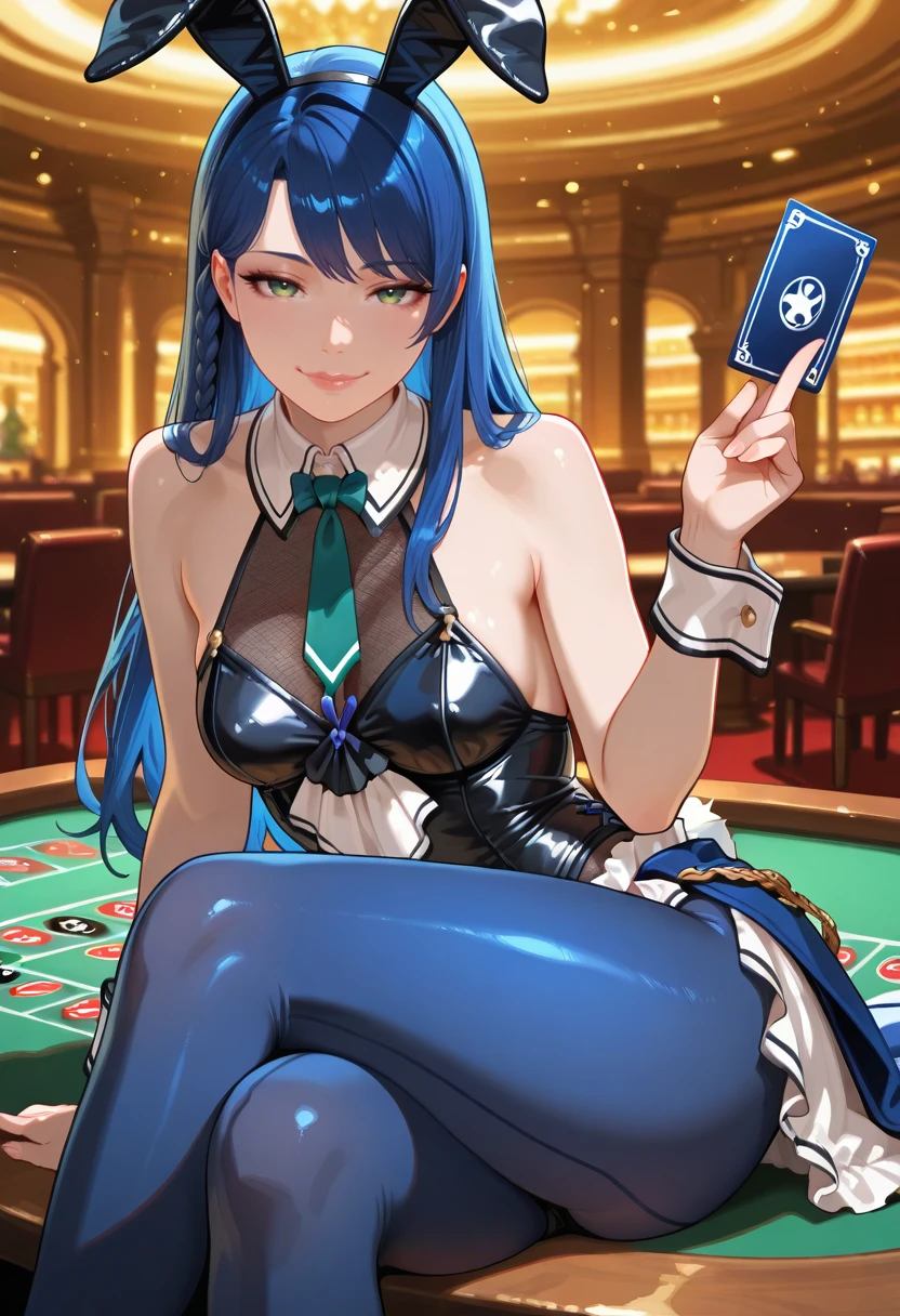 L0BXVV,blue hair, long hair, braid, green eyes, lips, swimsuit, collar, pink ribbon, negiglee, navel, panties, multiple ribbons, coattails, gold chain, cross-laced legwear, frilled bracelet,