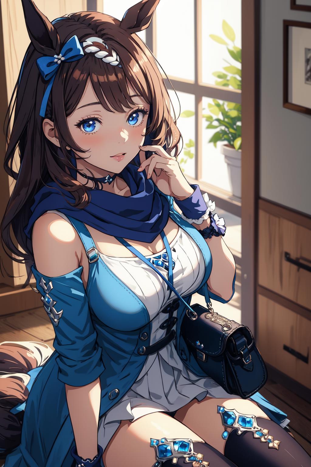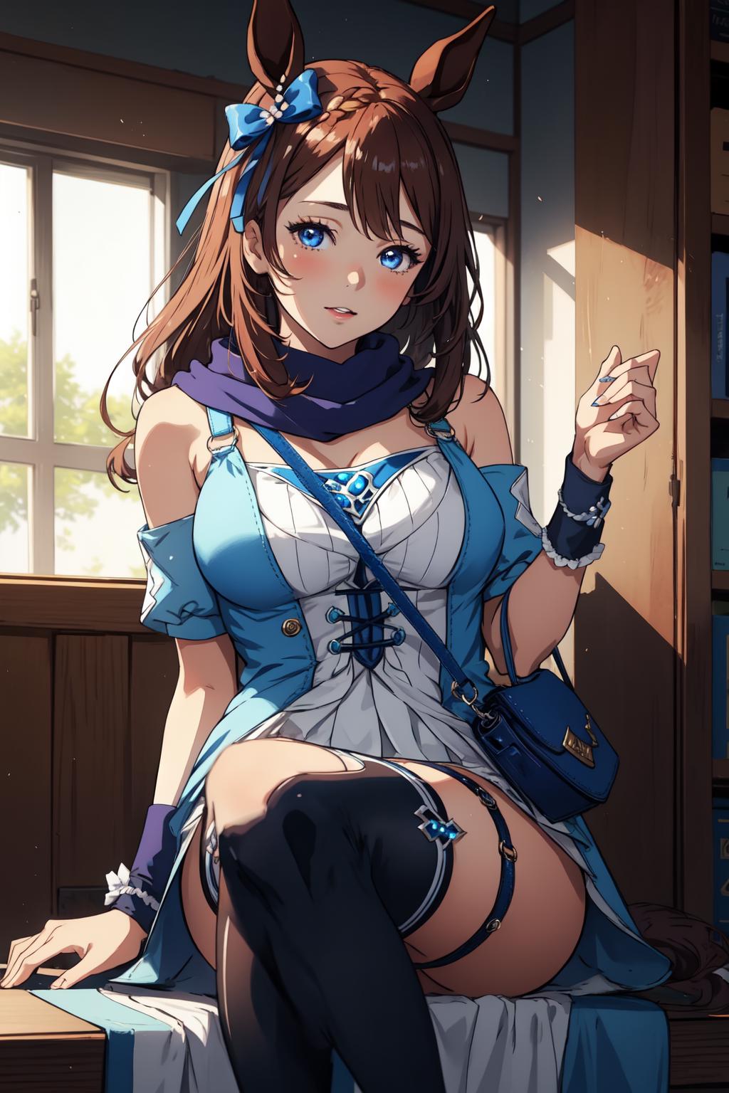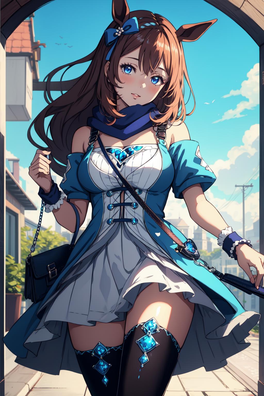 sup3rcr33k, blue dress, horse girl, horse tail, blue hair bow, blue scarf, blue wrist cuffs, blue thighhighs, shoulder bag