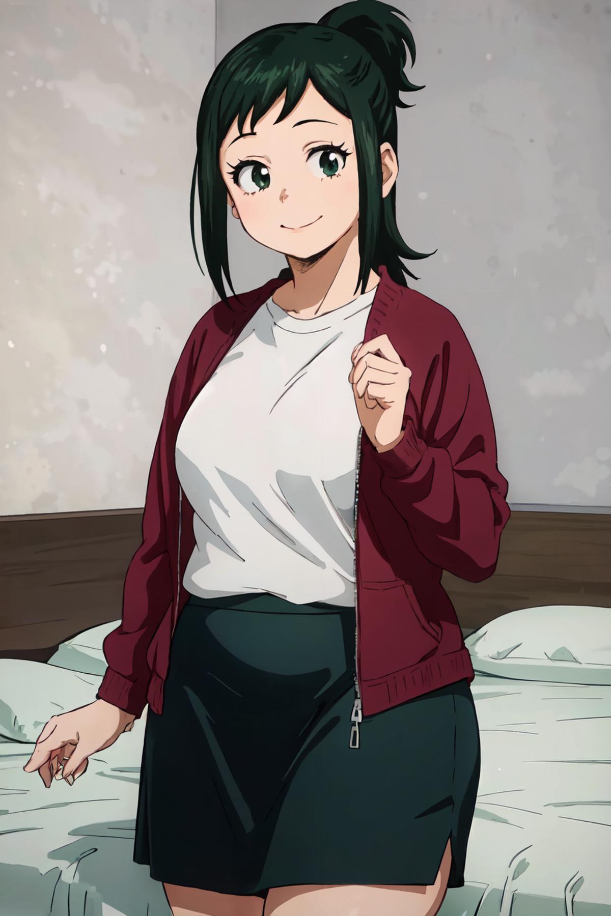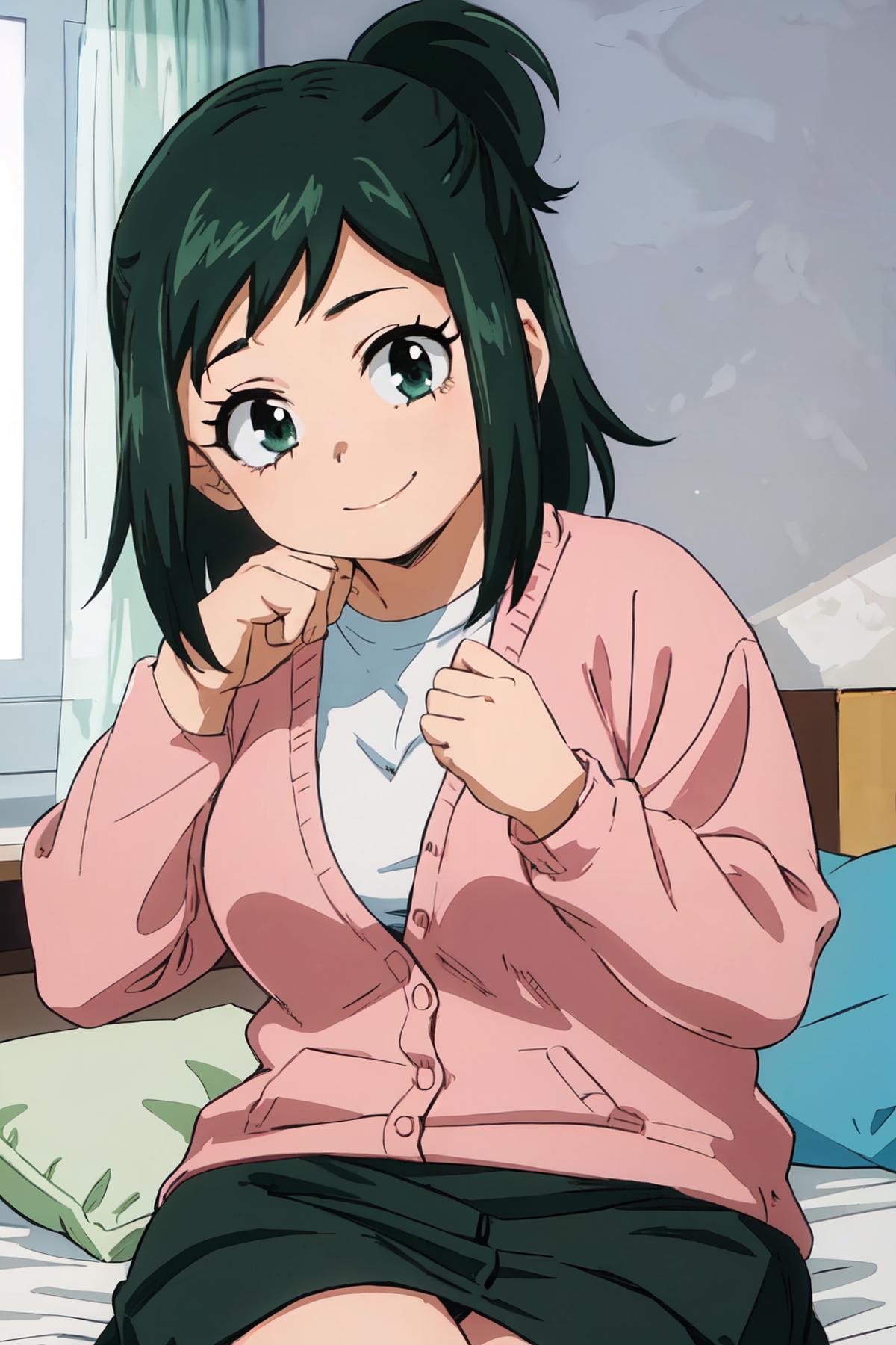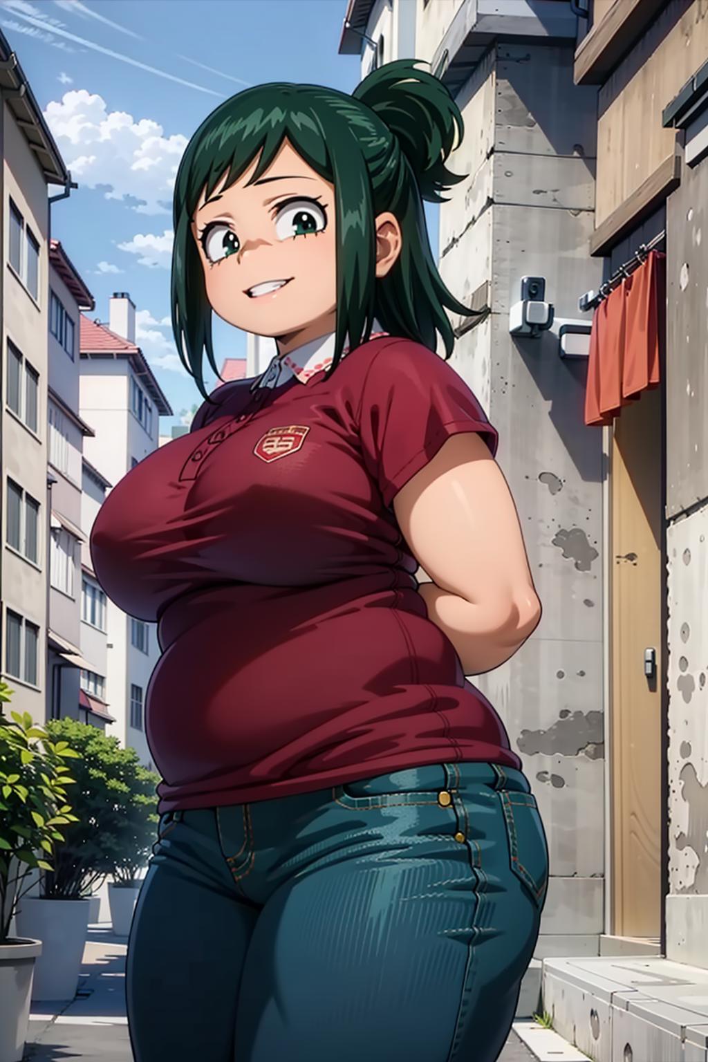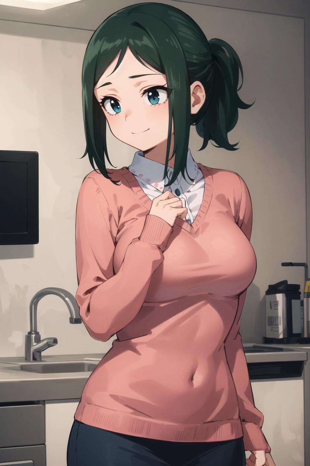 Trigger word: midoriya inko, green hair, short hair, short ponytail, green eyes, large breasts, curvy, plump
