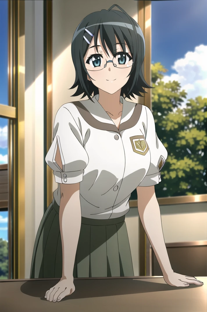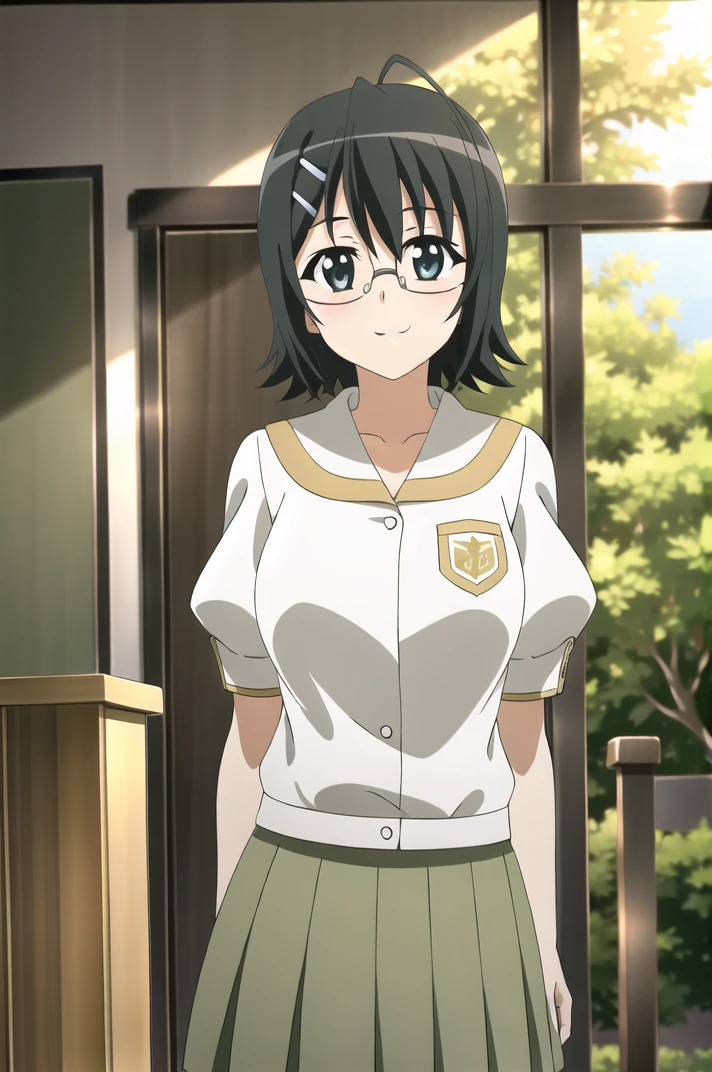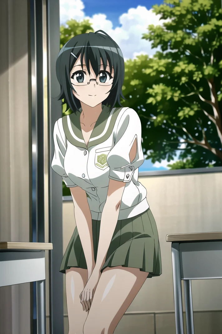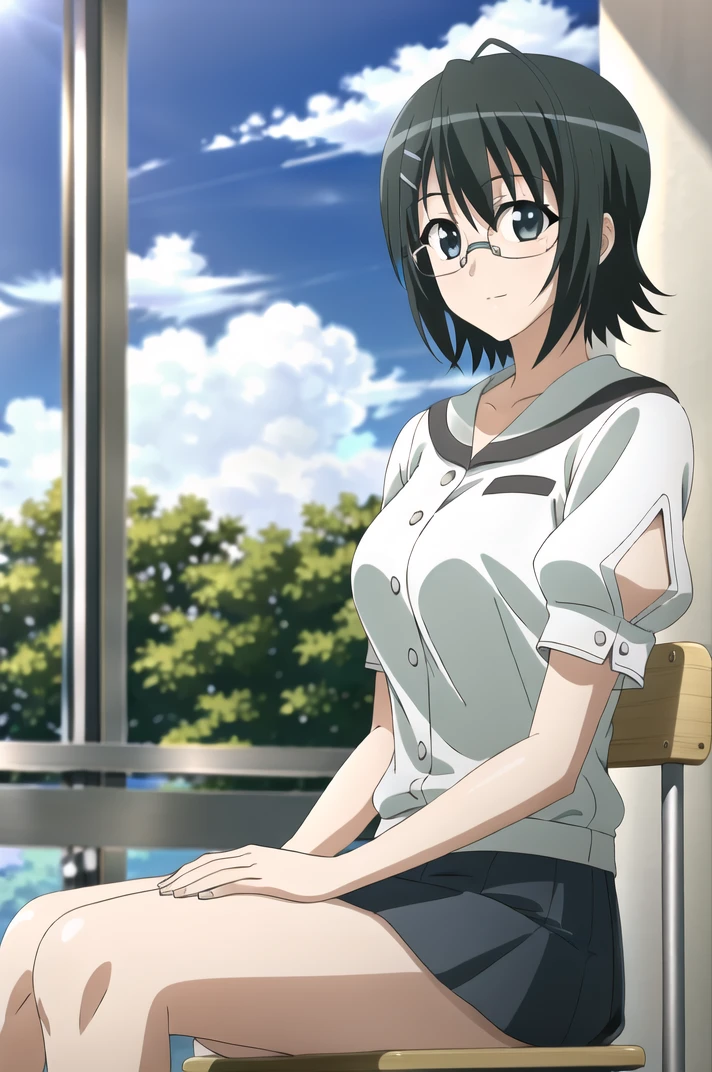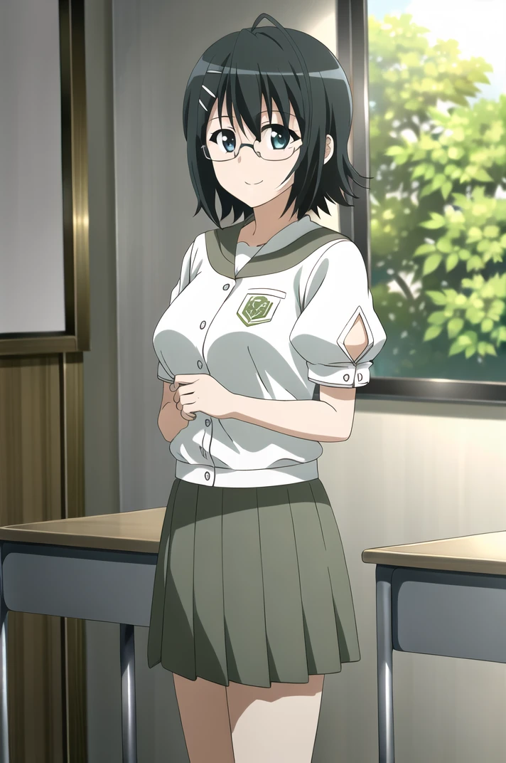 <lora:YosugaNoSora_NaoYorihimi-v4-06:0.7>, ChopioNaoYorihime, black hair, short hair, shiny hair, ahoge, glasses, green eyes, hairclip, (looking at viewer:1.3), large breasts,