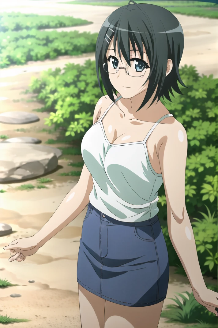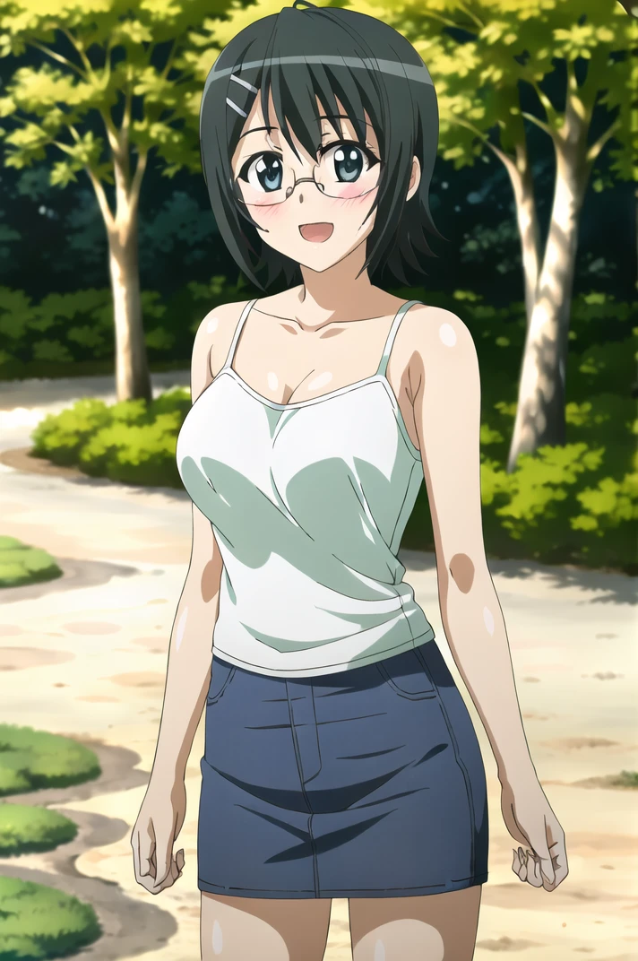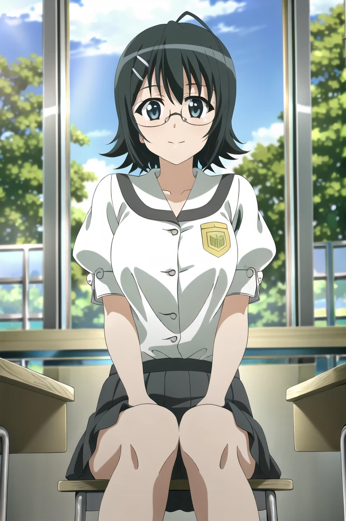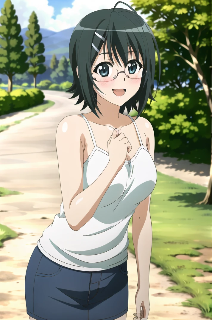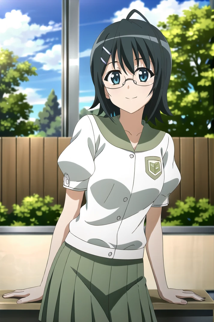 <lora:YosugaNoSora_NaoYorihimi-v4-06:0.7>, ChopioNaoYorihime, black hair, short hair, shiny hair, ahoge, glasses, green eyes, hairclip, (looking at viewer:1.3), large breasts,