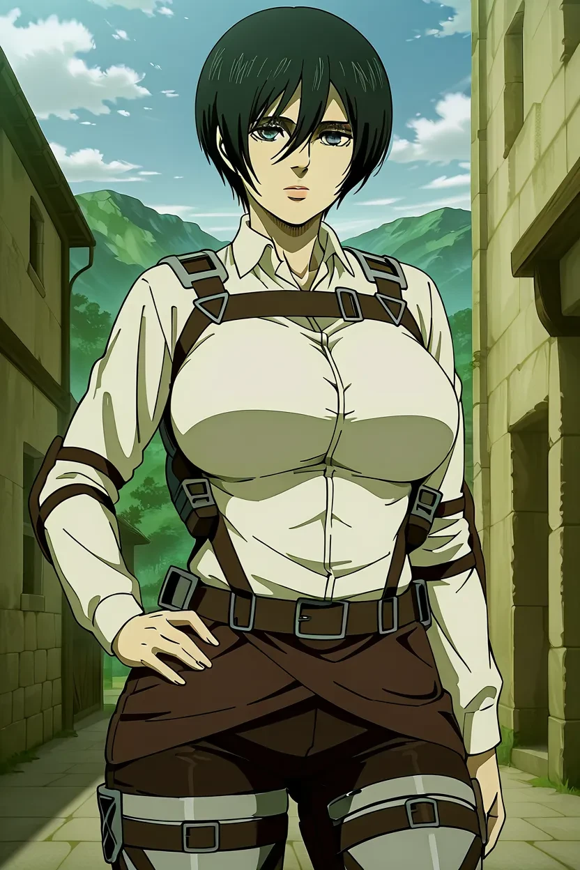 1girl, Mikasa Ackerman Adult (Attack on Titan), grey_eyes, black_hair, short_hair, lips, glossy_lips, massive_, curvy, extremely , wide_, thick_thighs, , fully_, , , attack_on_titan_art_style, No-Flaws, superb quality