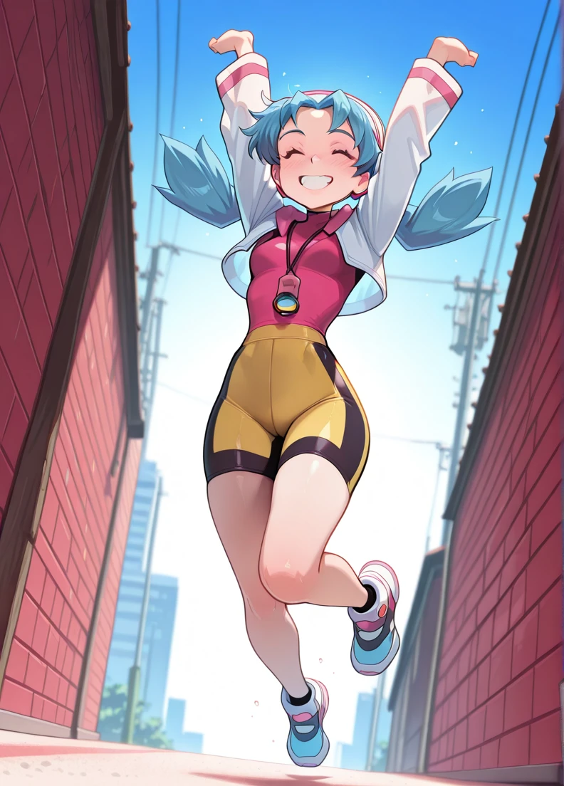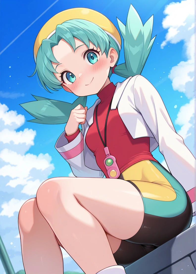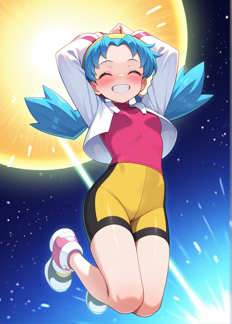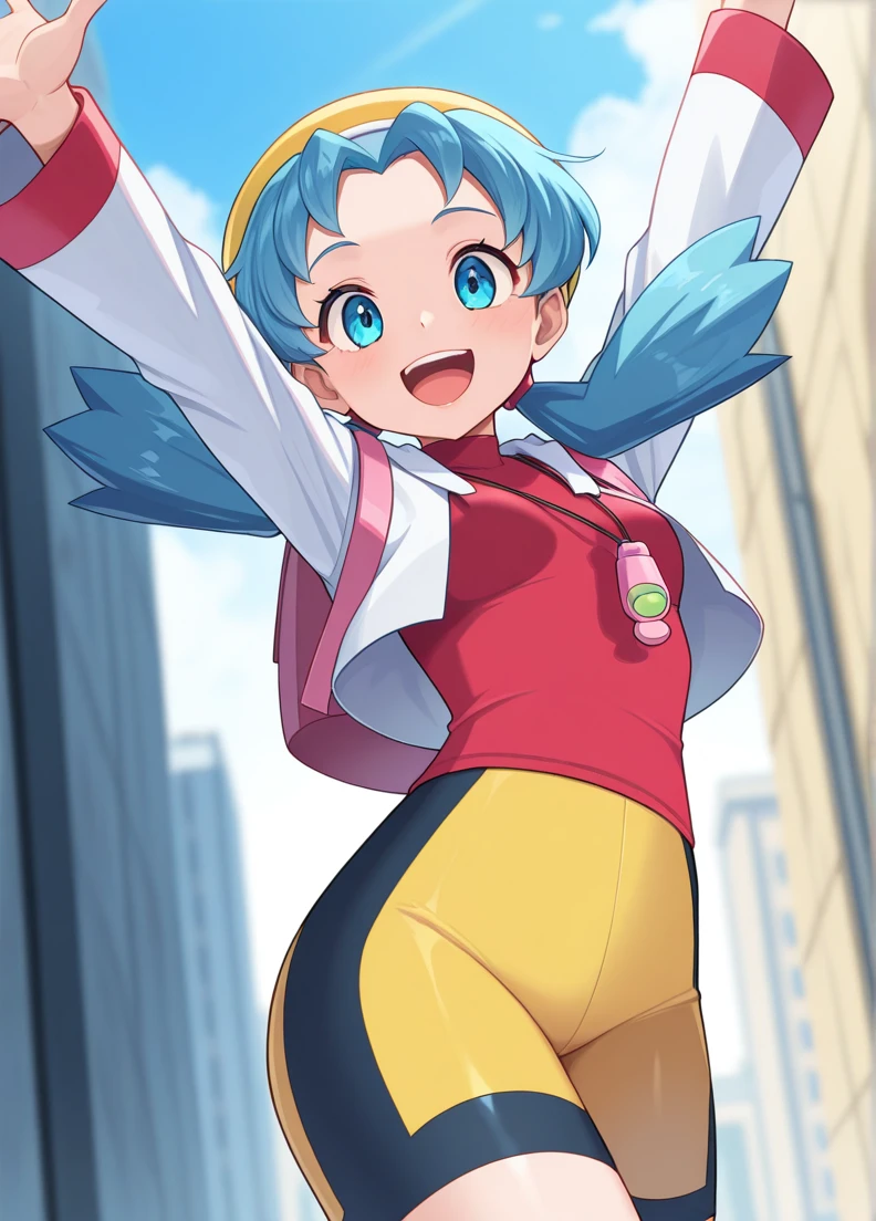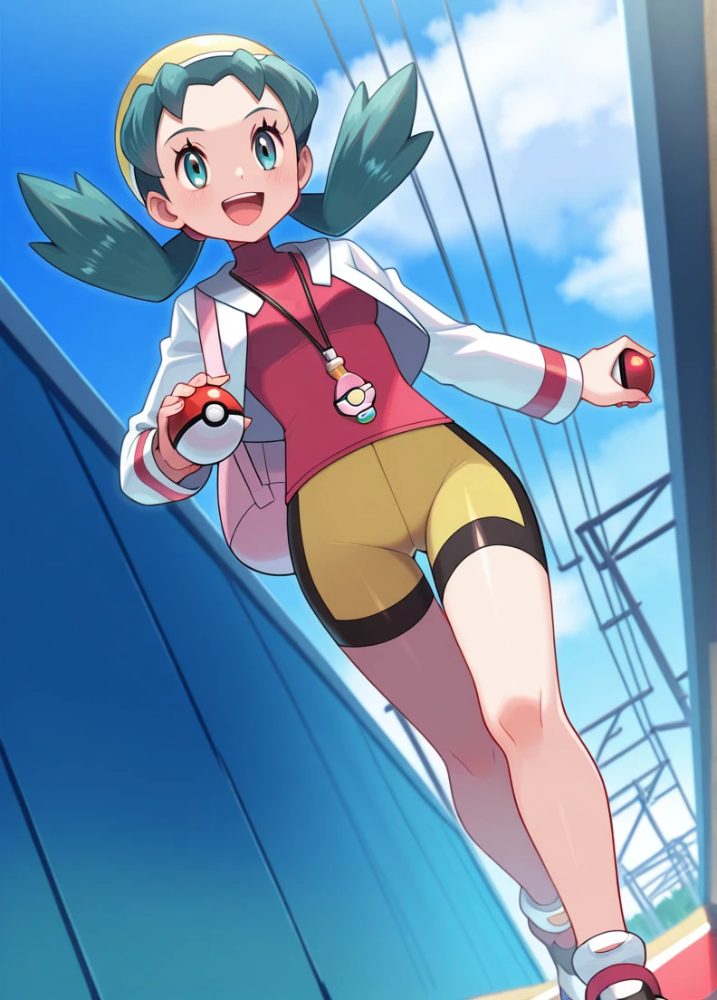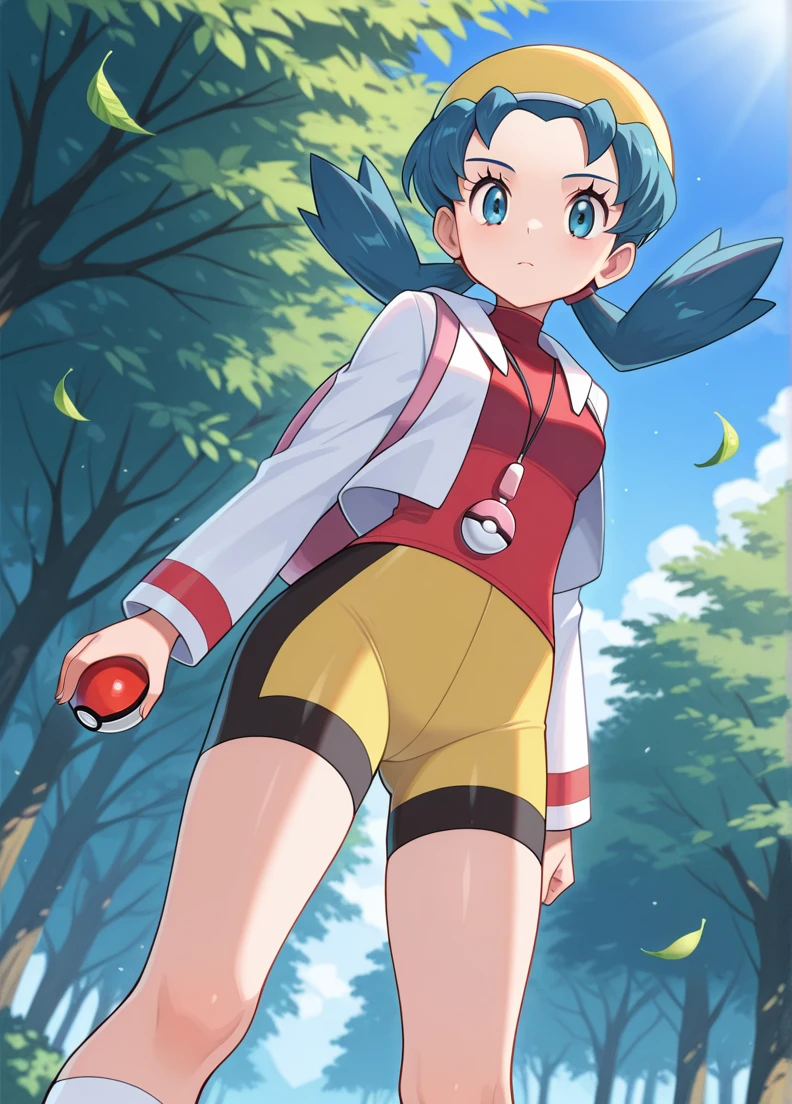 red shirt, bike shorts, white jacket, hat, yellow headwear, long sleeves, shoes, cropped jacket,