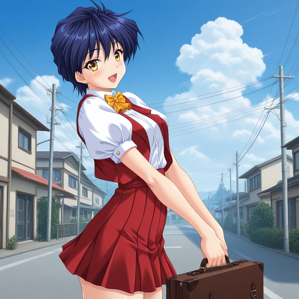 aktak, short hair, blue hair, red vest, skirt, bowtie, yellow eyes, white shirt, short sleeves, puffy sleeves,
