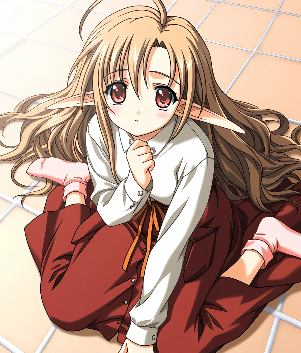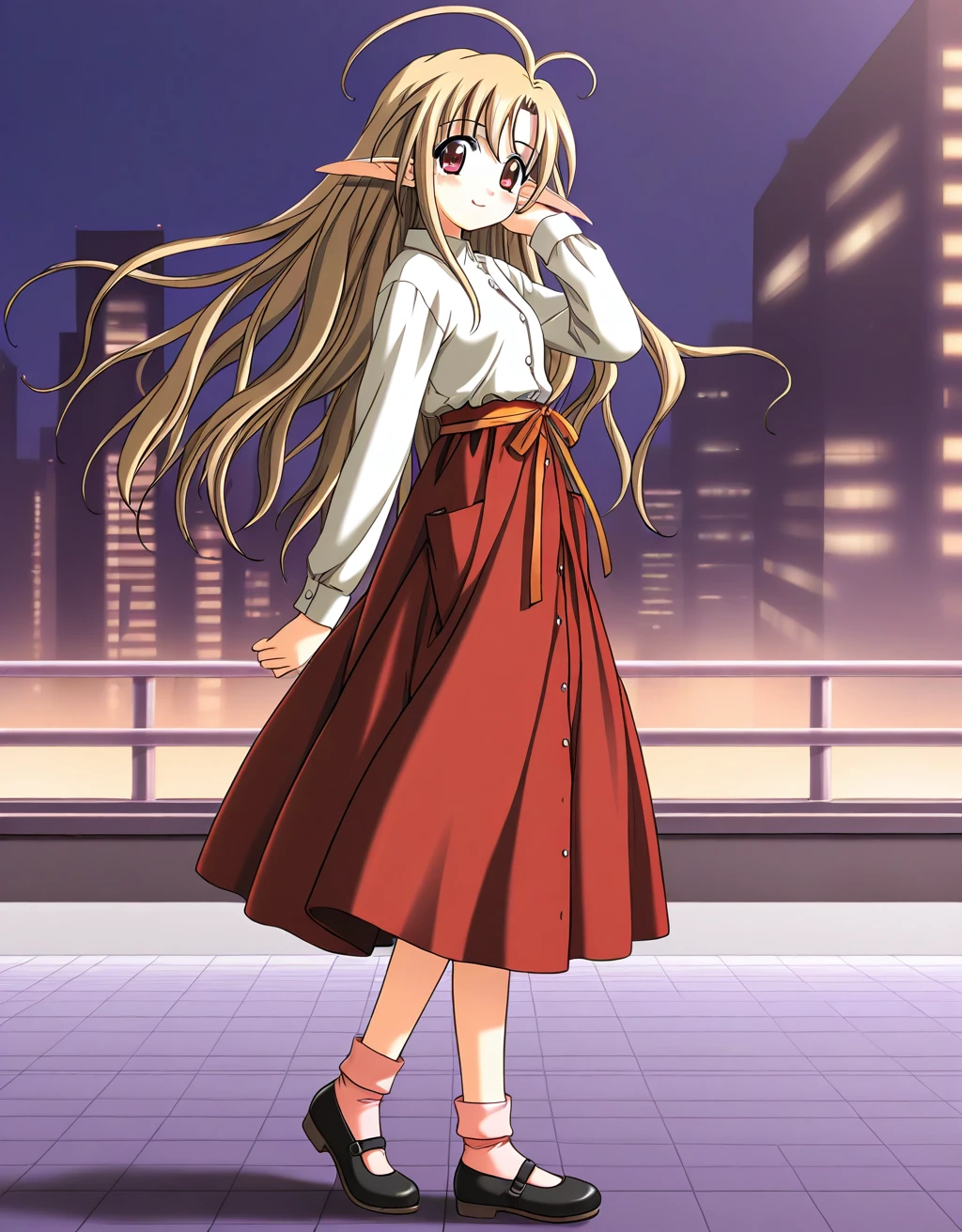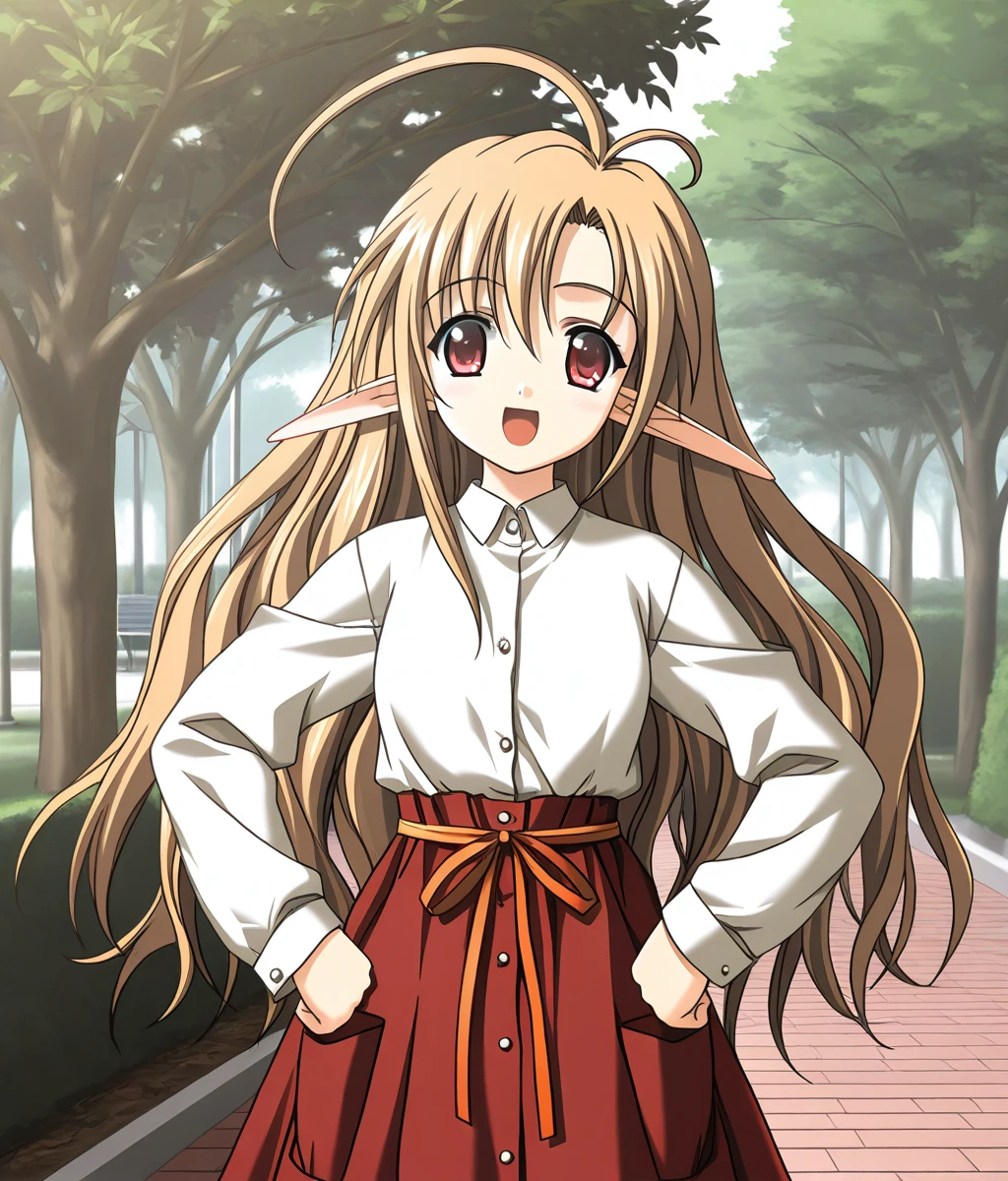 shirt, long sleeves, dress shirt, orange ribbon, long skirt, red skirt, waist pockets,