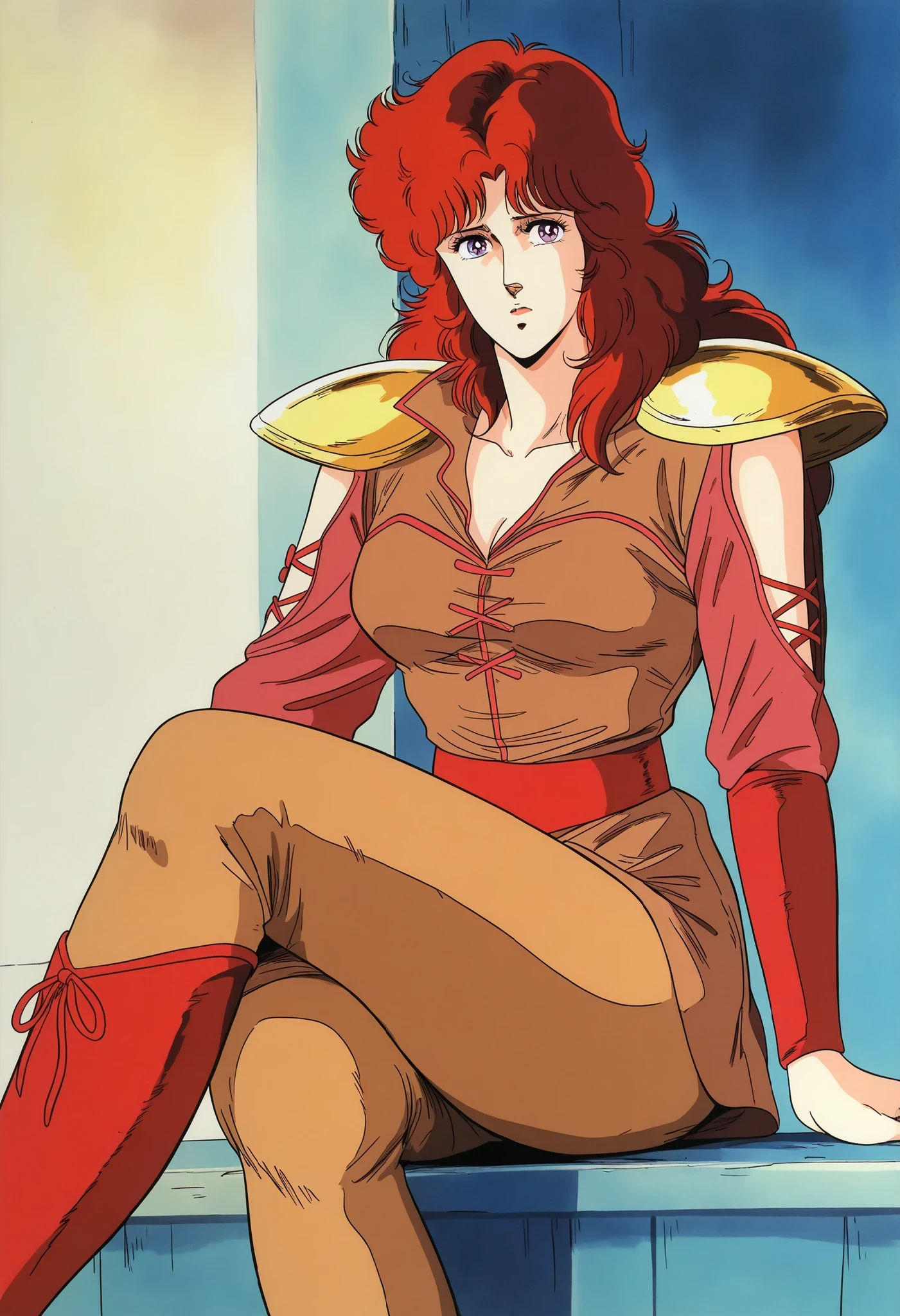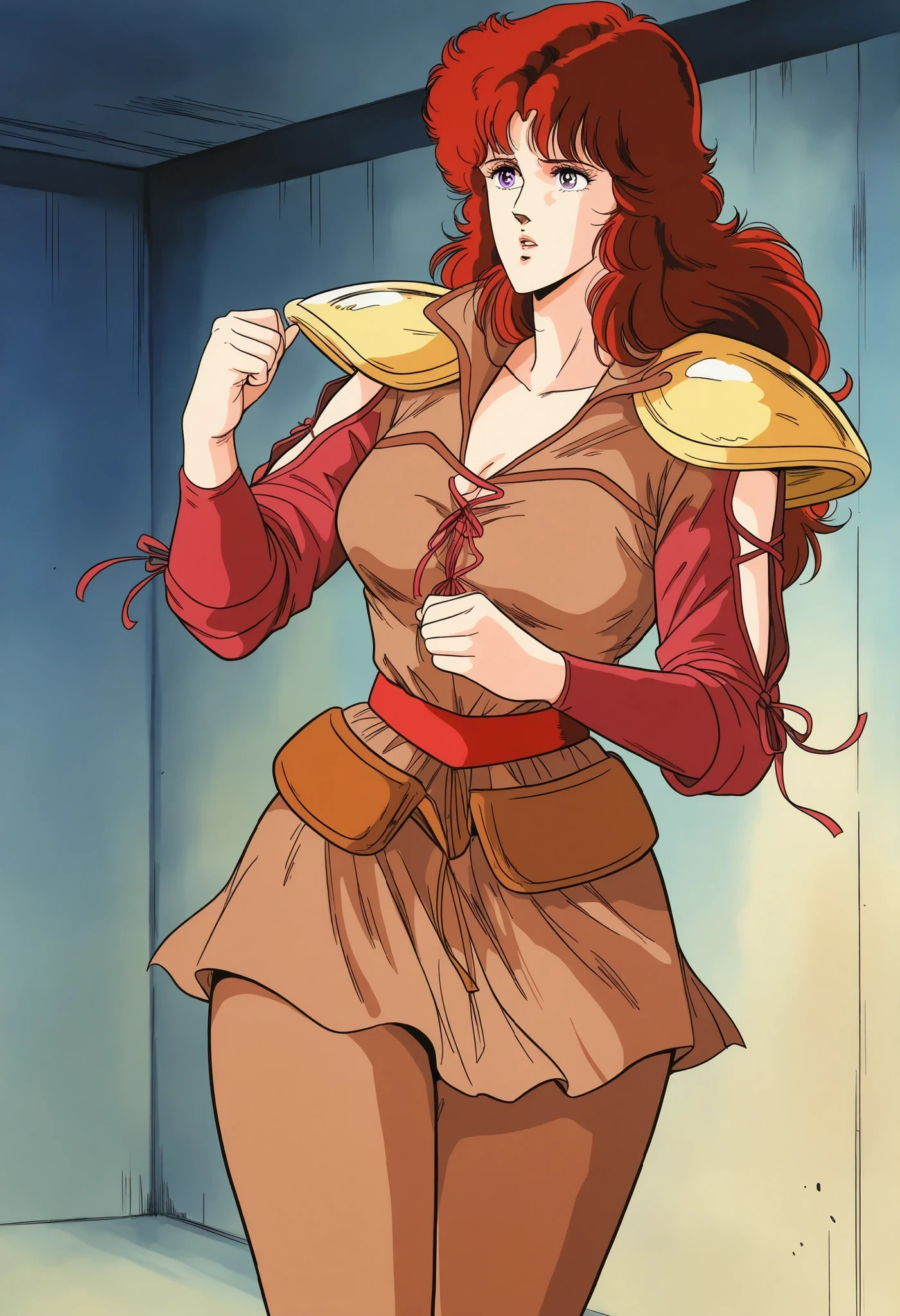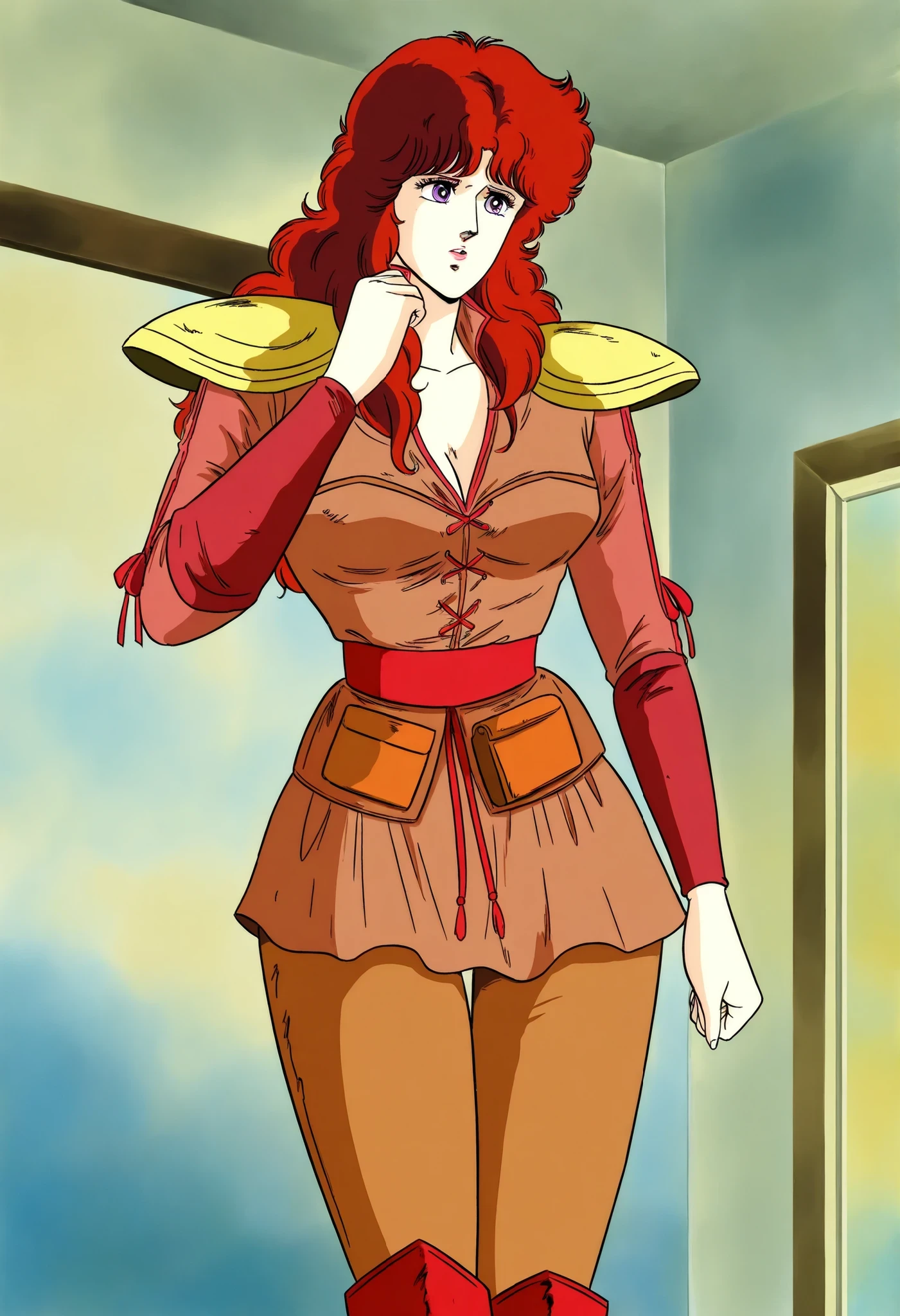1woman,Mamiya, solo,red hair,long hair, shinny purple eyes,wears a fitted brown tunic with red laces, golden shoulder pads,red sleeves, a wide red belt, tight brown pants, wide hips,and red boots.The look blends a warrior style with a feminine touch,retro 80's style , standing moderately ,tall woman