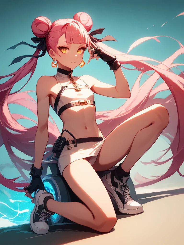 Prompt: score_9, score_8_up, score_8, best quality, high quality, 1girl, solo, teen, orange-gold eyes, pink hair, double buns hairstyle, twintails, blunt bangs, (hip-length hair tendrils), unique cut style, unique hairstyle, pale skin, slim body, two hair ribbons, bow dangle earrings, fingerless gloves, full body, <lora:TaoYuifa Lora sdxl:0.8>