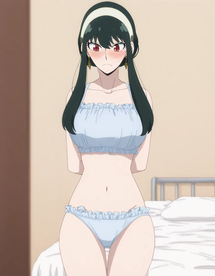 yor briar, black hair, red eyes, earrings, white hairband, hairband, long hair, sidelocks, large breasts,