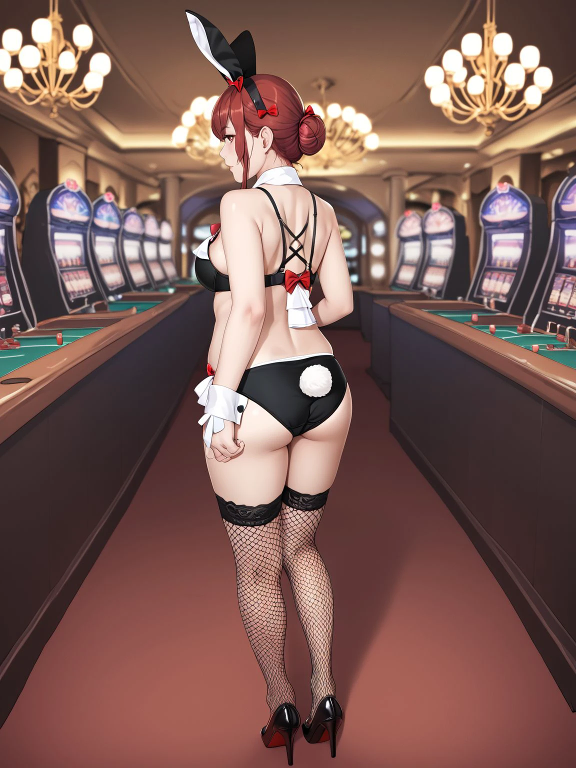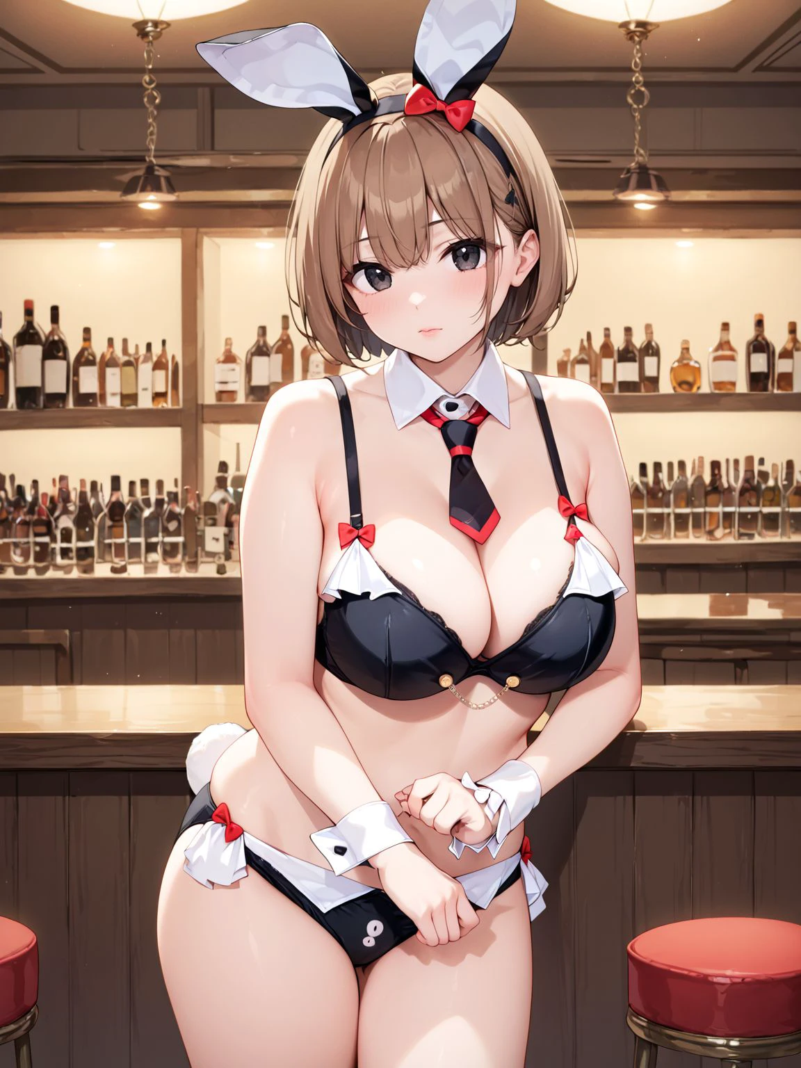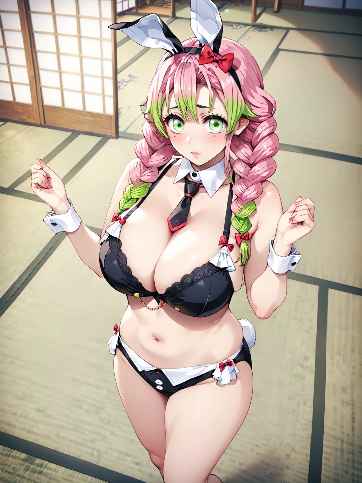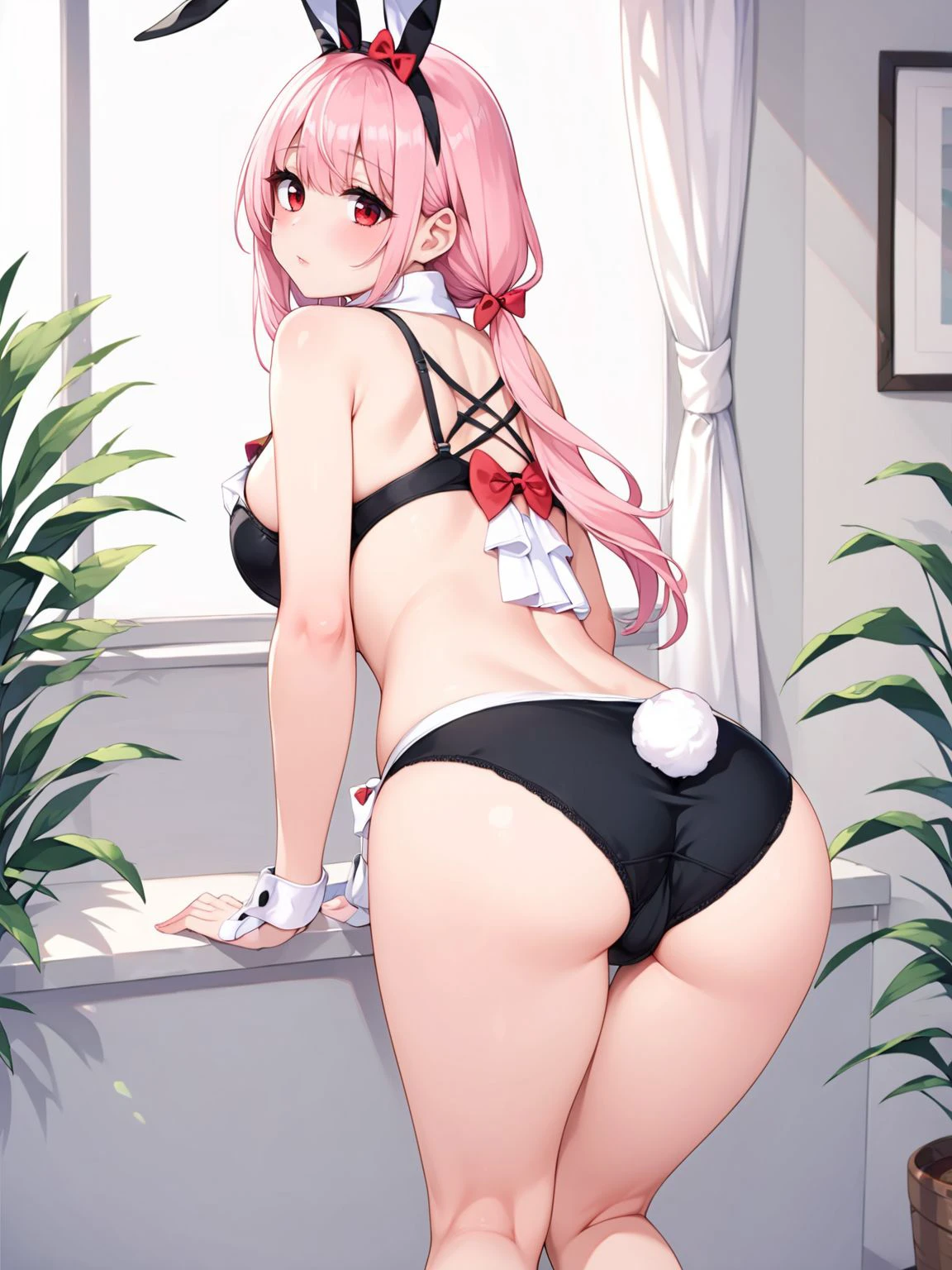 bare shoulders,wrist cuffs,necktie,short necktie,detached collar,fake animal ears,underwear,bow,hair bow,red bow,bowtie,bra,black bra,panties,black panties,fake tail,rabbit tail
