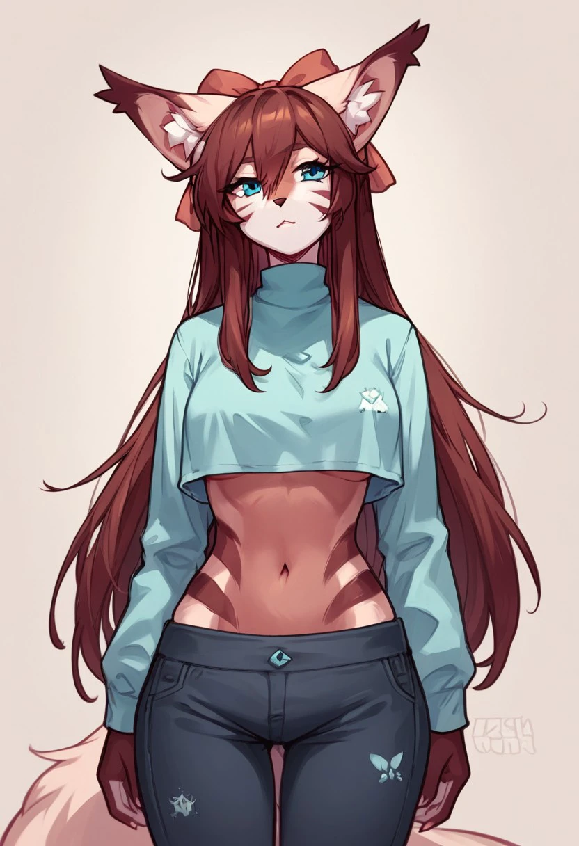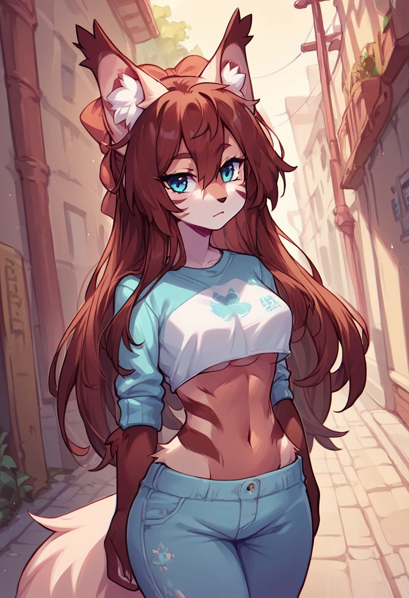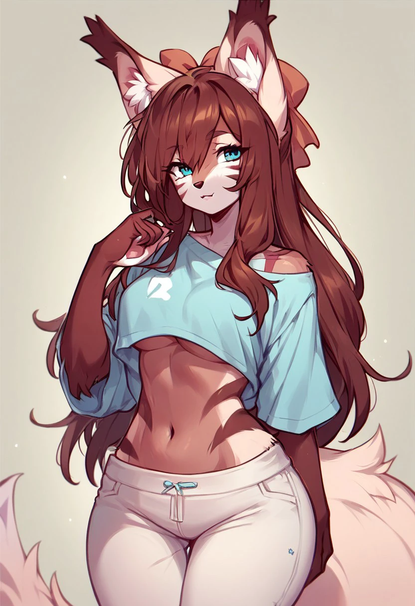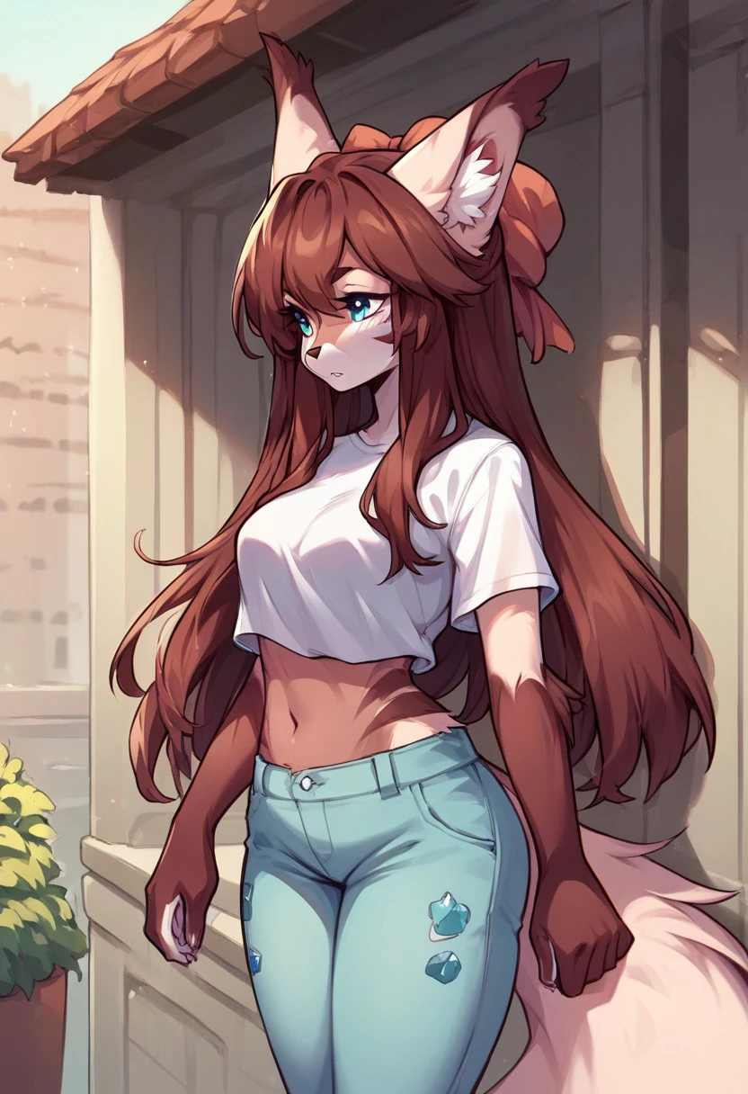 ChizuVtuber, furry, furry female, body fur, brown fur, fox ears, fox tail, facial mark, brown hair, blue eyes, long hair