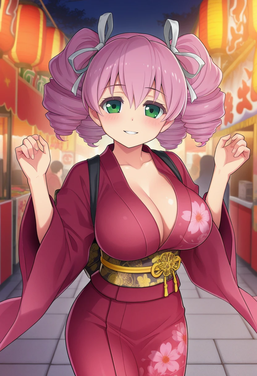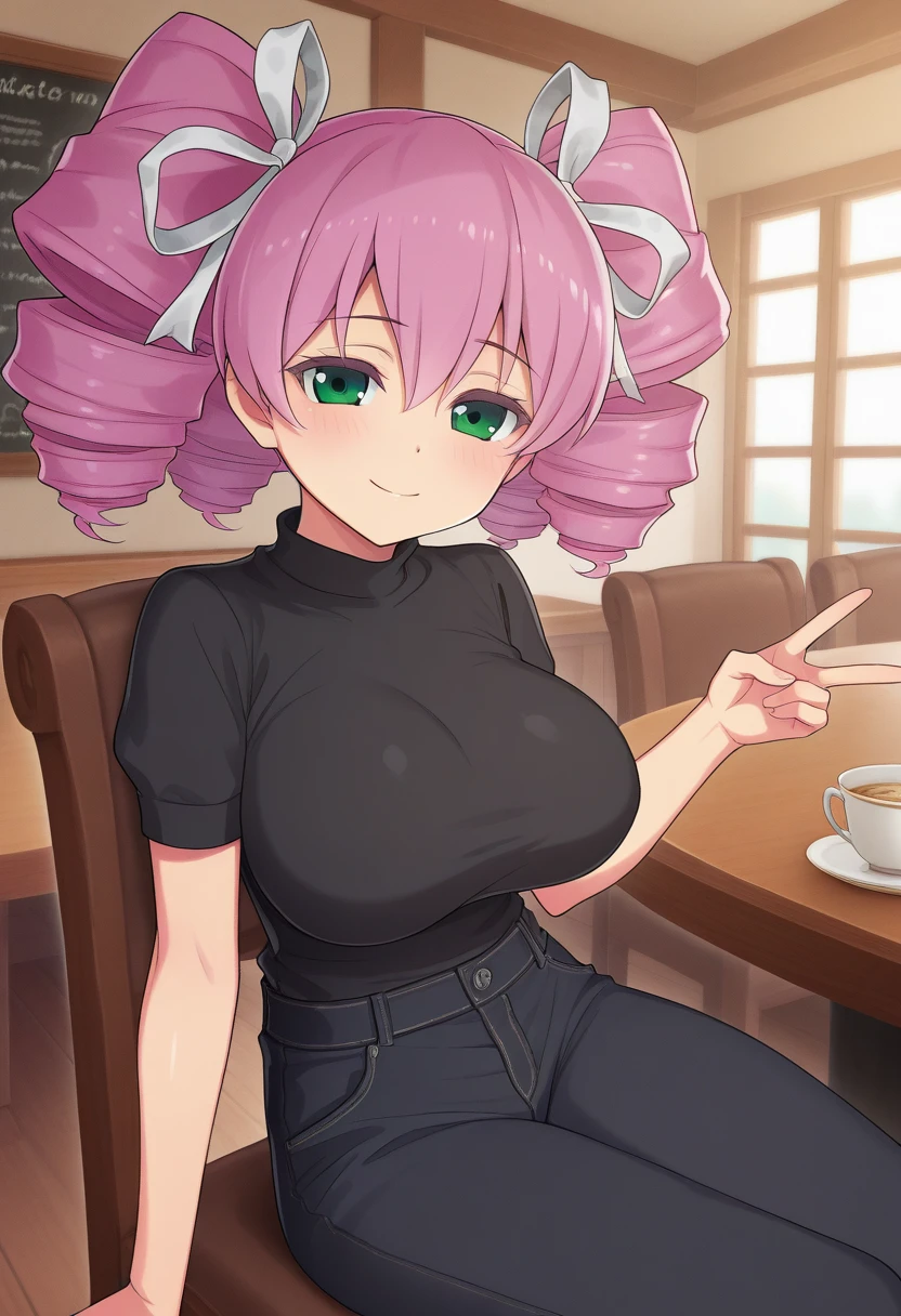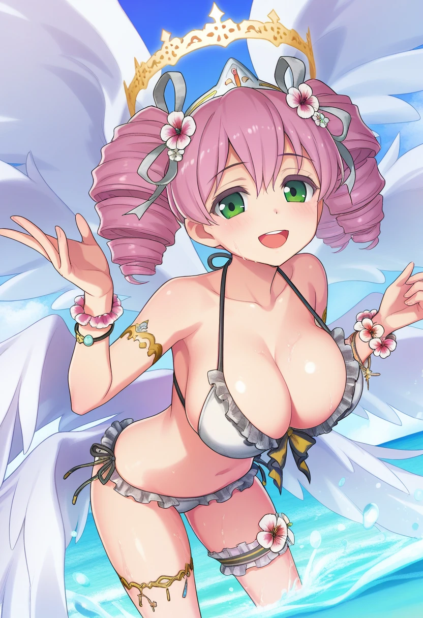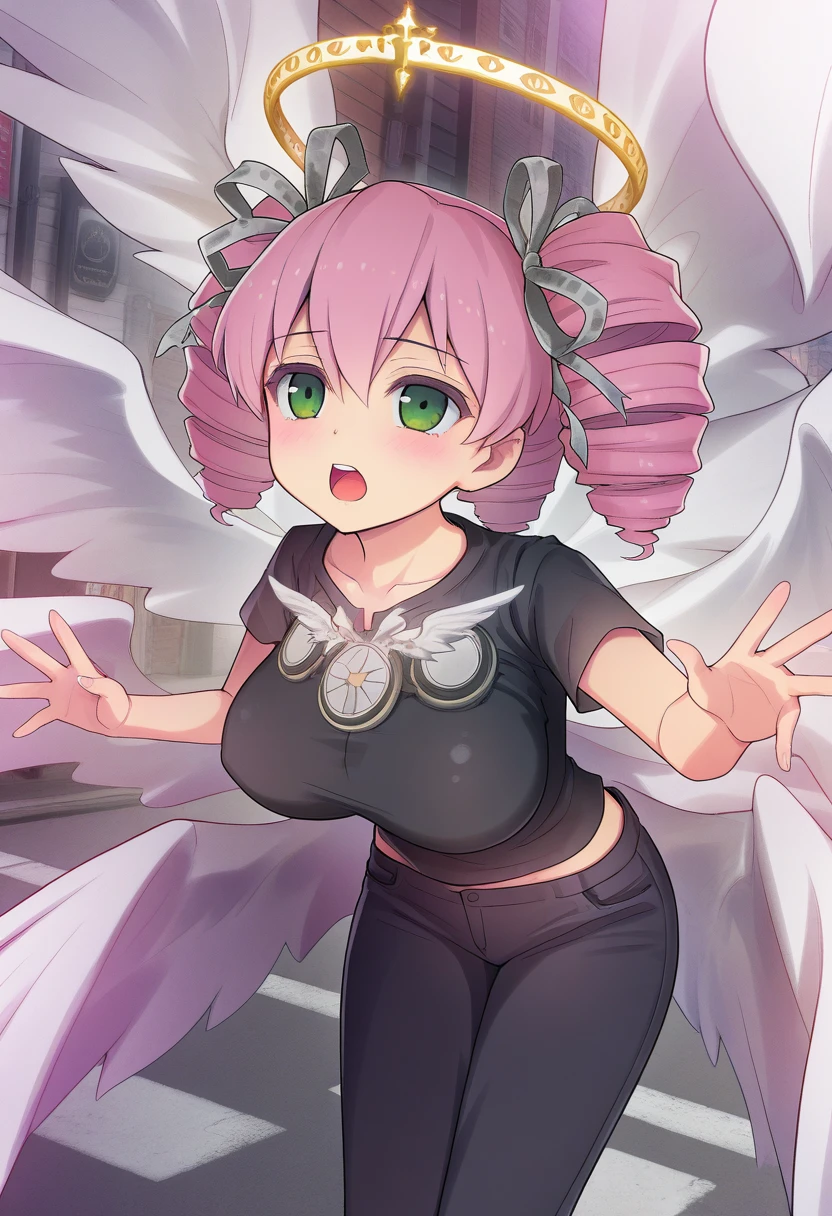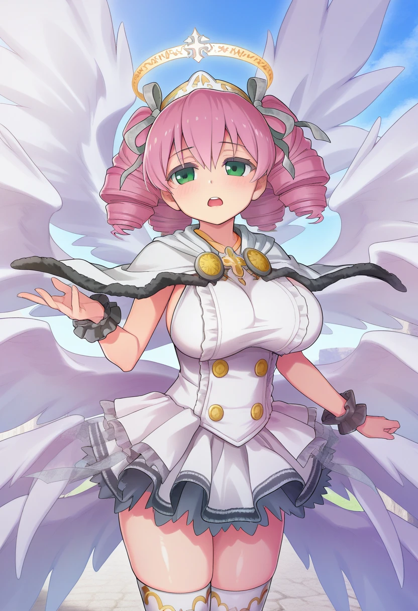 metatronDP, pink hair, short hair, twin drills, green eyes, large breasts, angel wings, multiple wings
