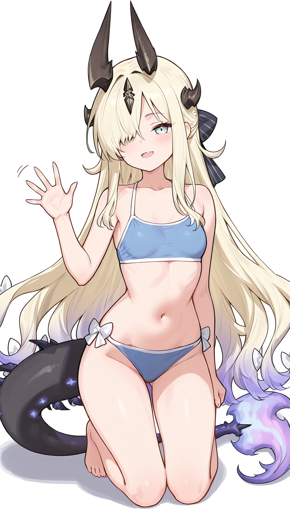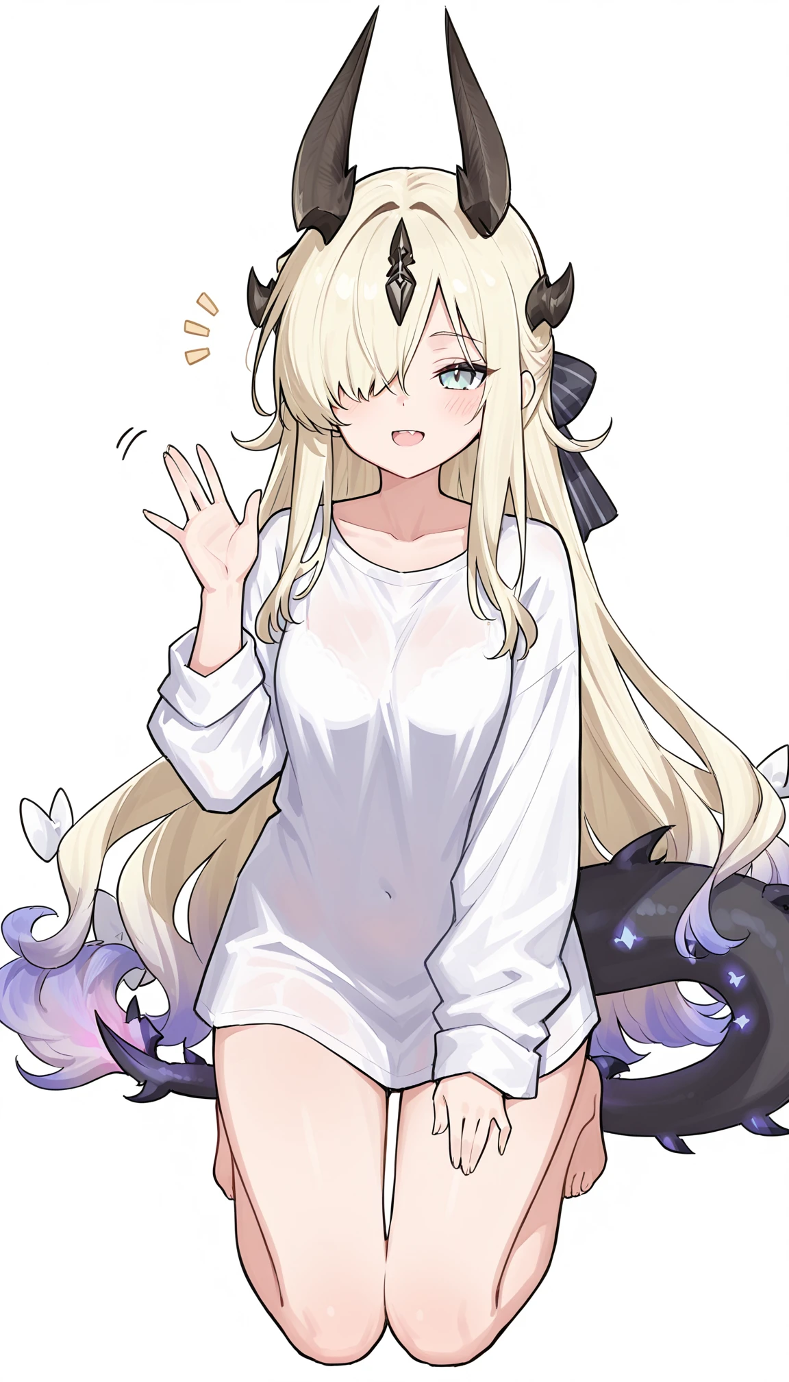 1girl,Eblana,dragon girl,solo,white dress,black bow,hair bow,white bow,white pantyhose,shoes, white footwear, long sleeves,bare shoulders