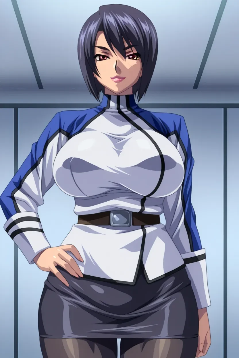 1girl, Naomi Evans (Kangoku Senkan), short hair, bangs, black_hair, red eyes, glossy lips, thick lips, 4k, HD, High-Resolution, Flawless, Excellent Quality, digital touch up, uncensored