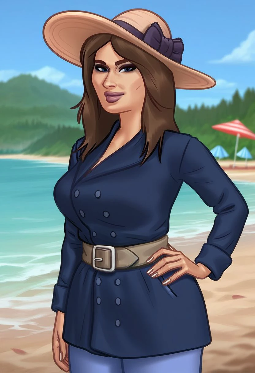 blue pants, brown belt, blue coat, long coat, buttons, long sleeves, no bra, cleavage