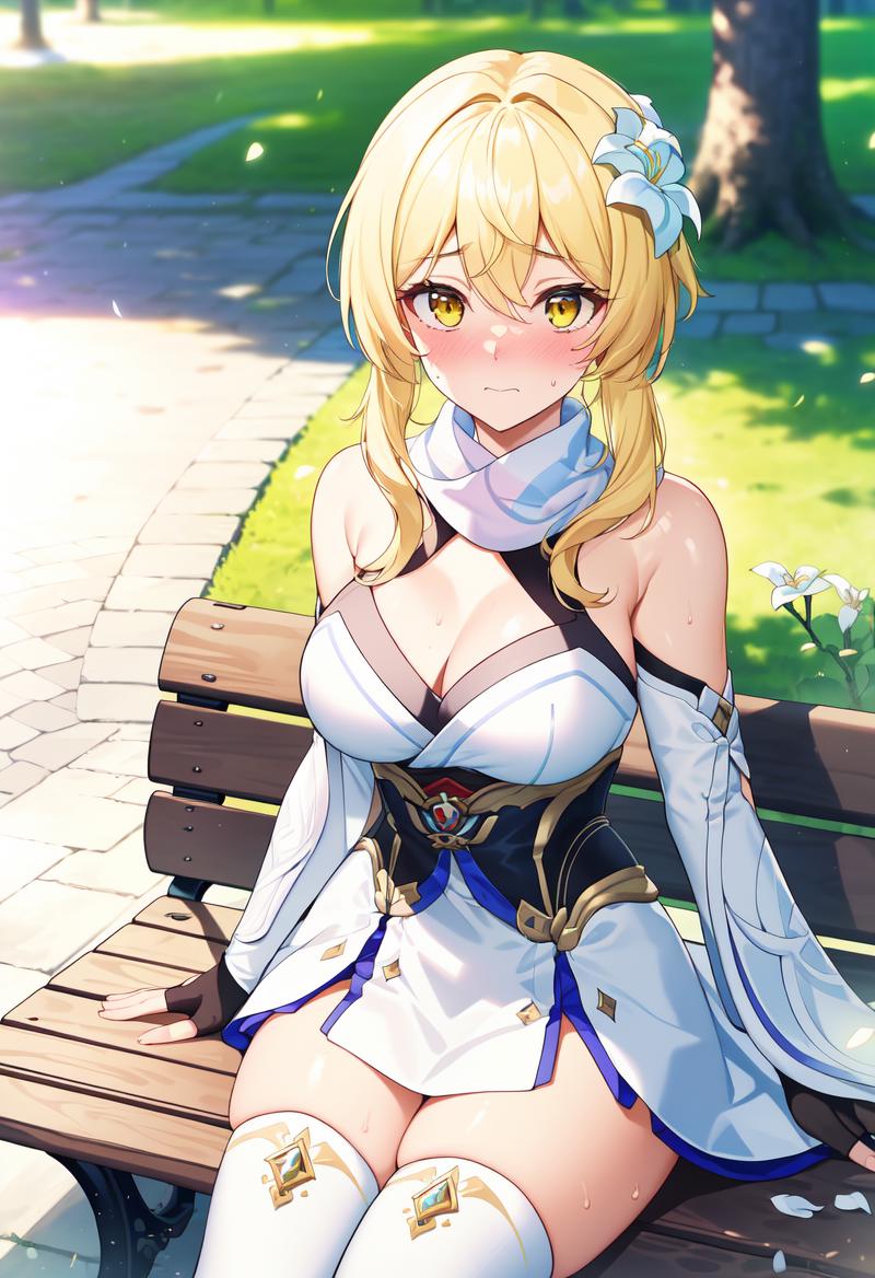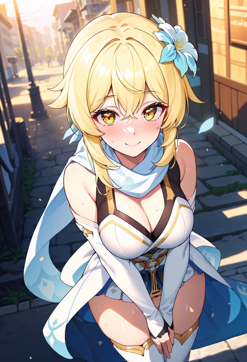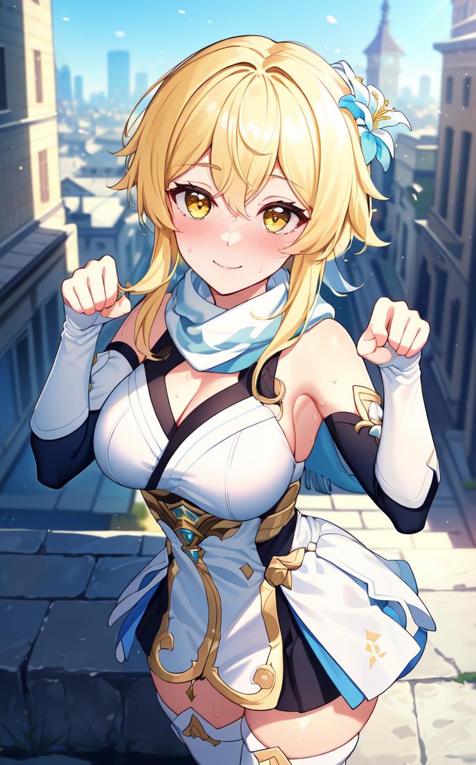 Recommended prompts: lumine_genshin, 1girl, solo, blonde hair, hair between eyes, short hair, short hair with long locks, hair ornament, hair flower, flower, white flower, yellow eyes, medium breasts, thighs, cleavage, blush, collarbone, borrowed, embarrassed, smile, sweat, white dress, genshin impact, white thigh boots, white forearms, white footwear, scarf, white scarf, detached sleeves, partially fingerless gloves, black gloves, fingerless gloves