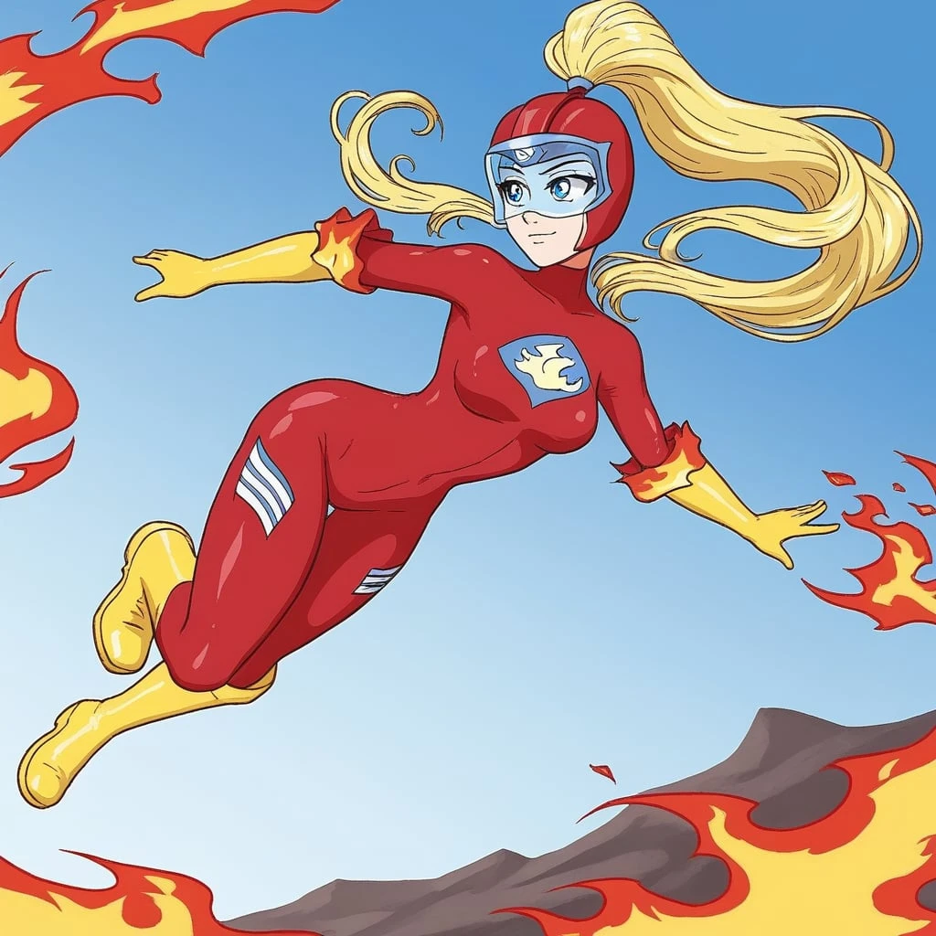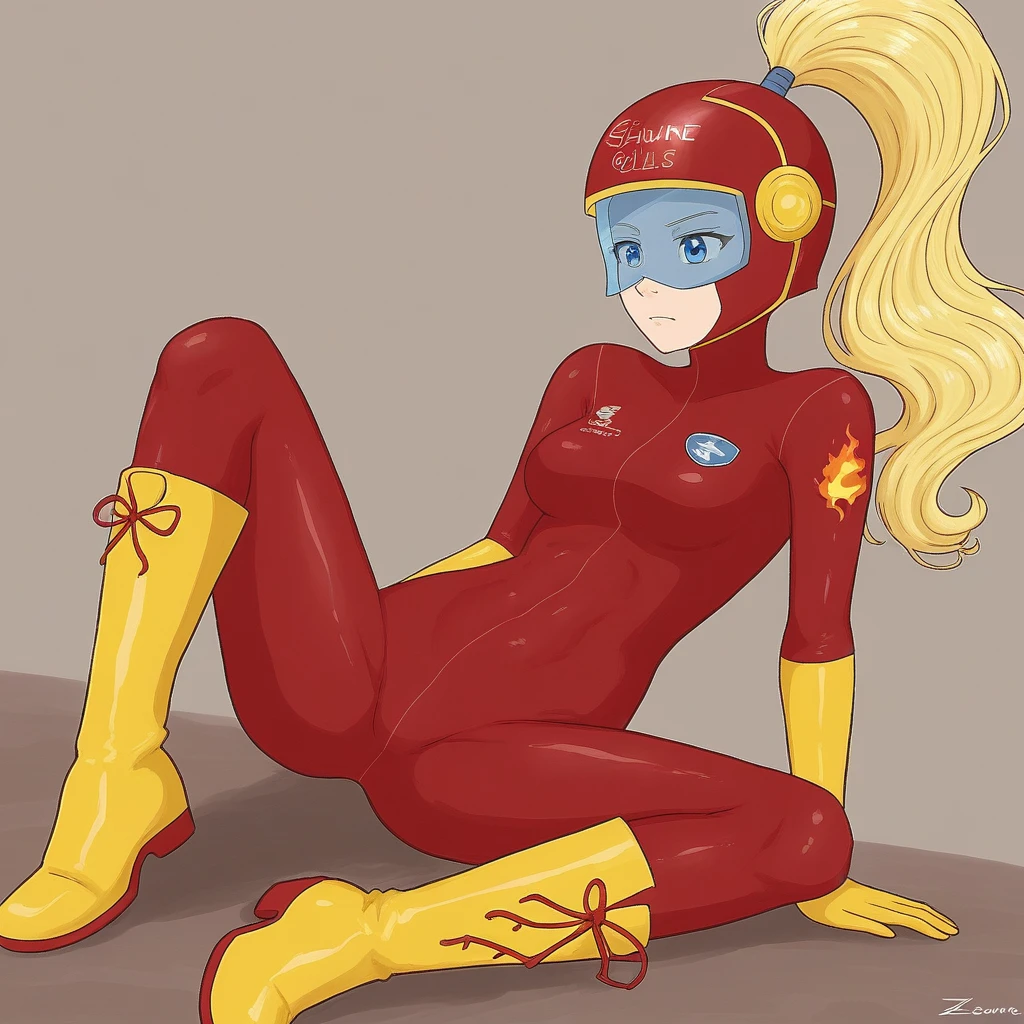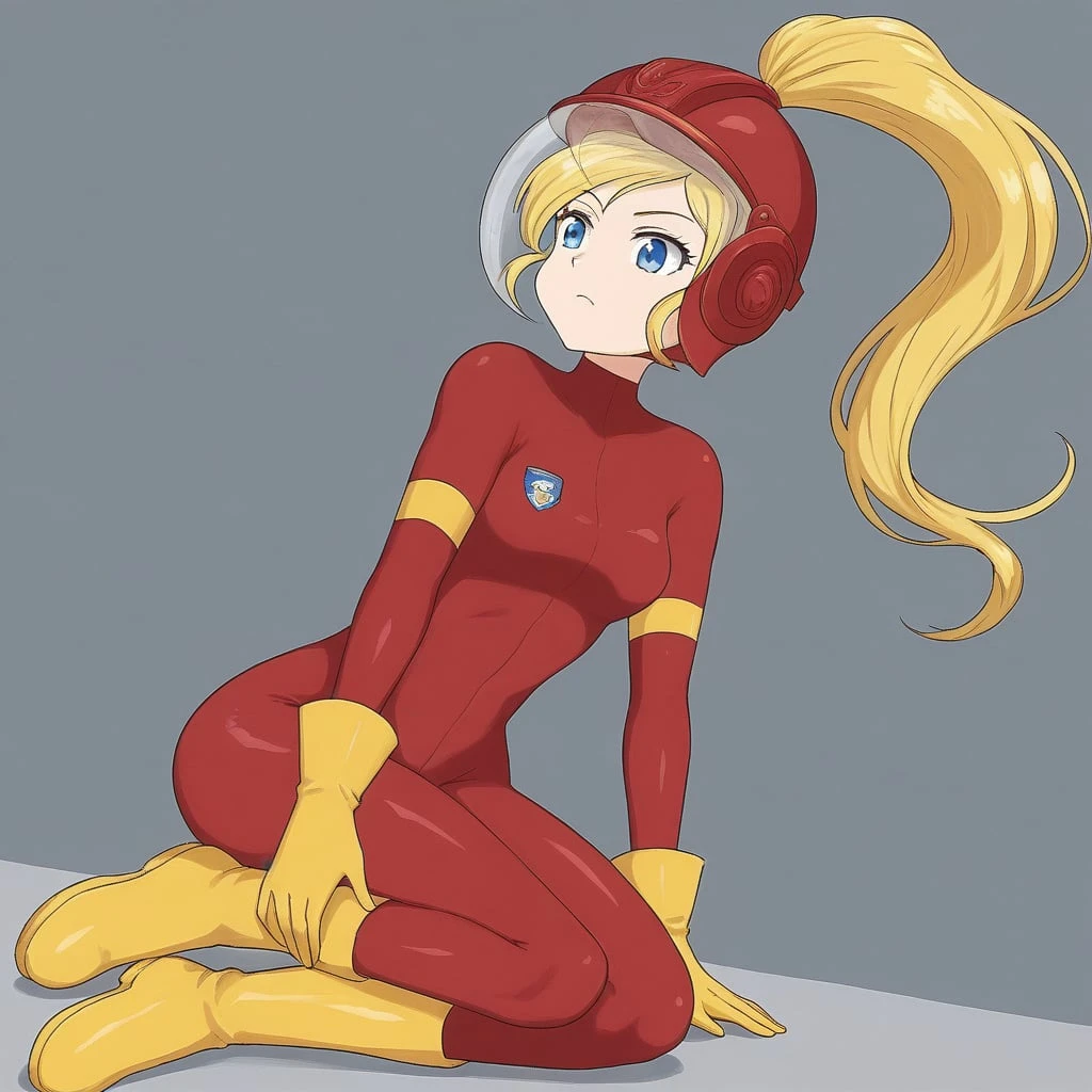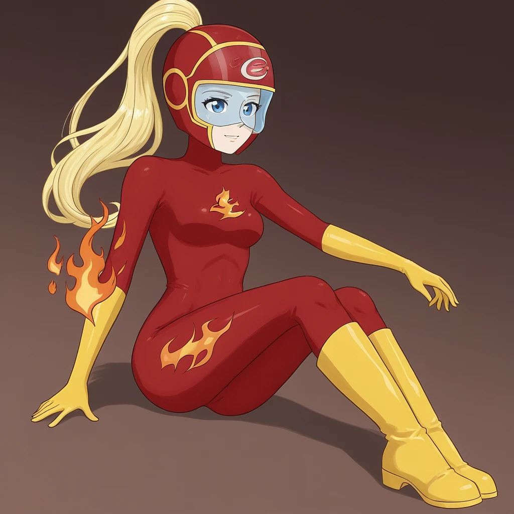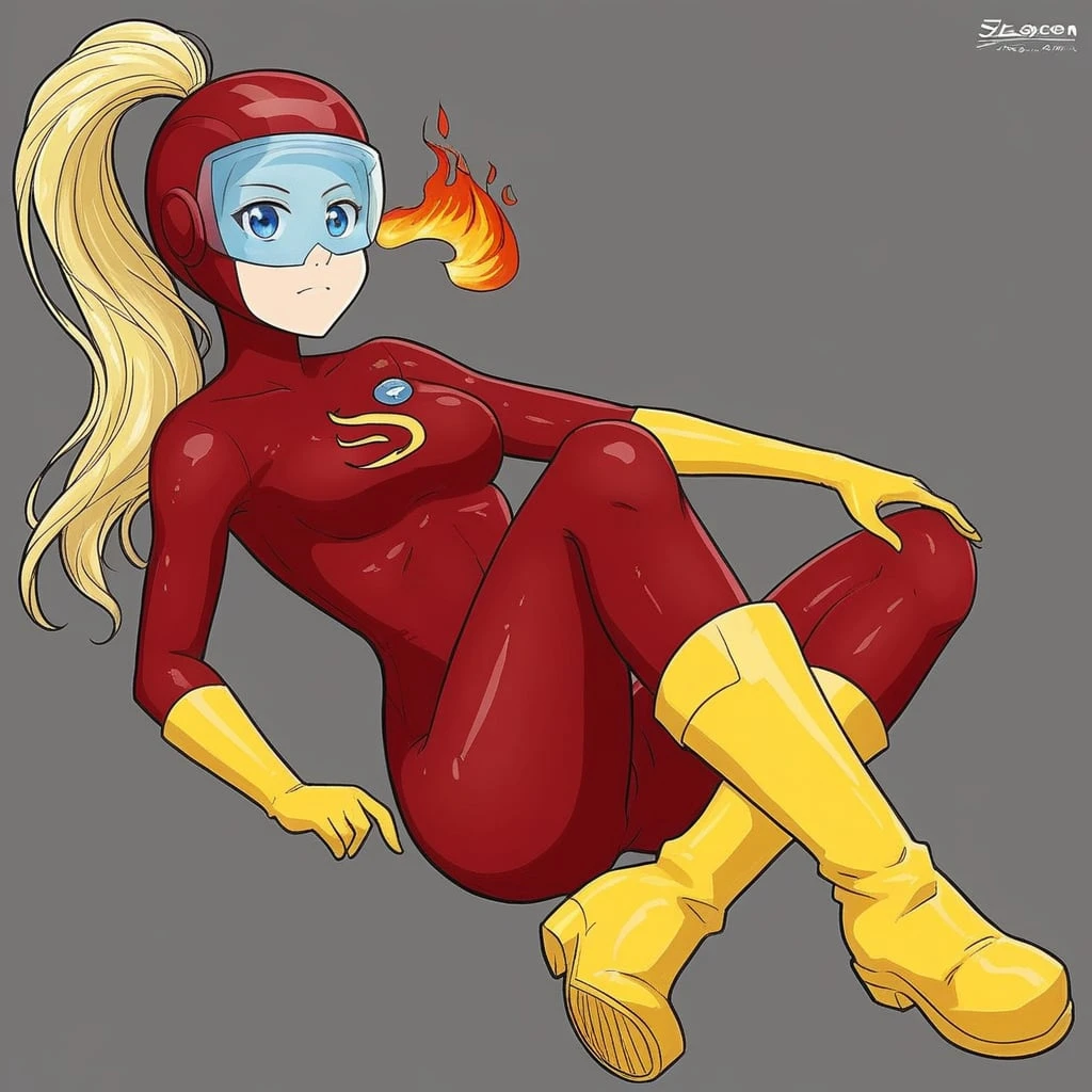 1girl, solo, Blazestone, high ponytail, ponytail, tied hair, blonde hair, blue eyes, red helmet, helmet with visors, dark red bodysuit, tight dark red uniform, yellow elbow gloves, yellow boots, with yellow and orange details, evoking flames,