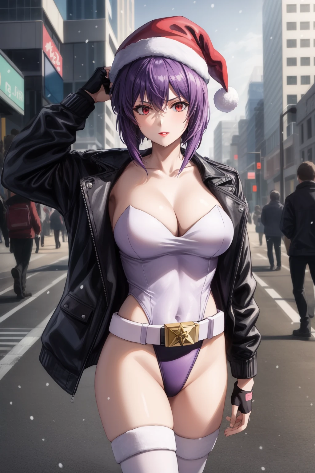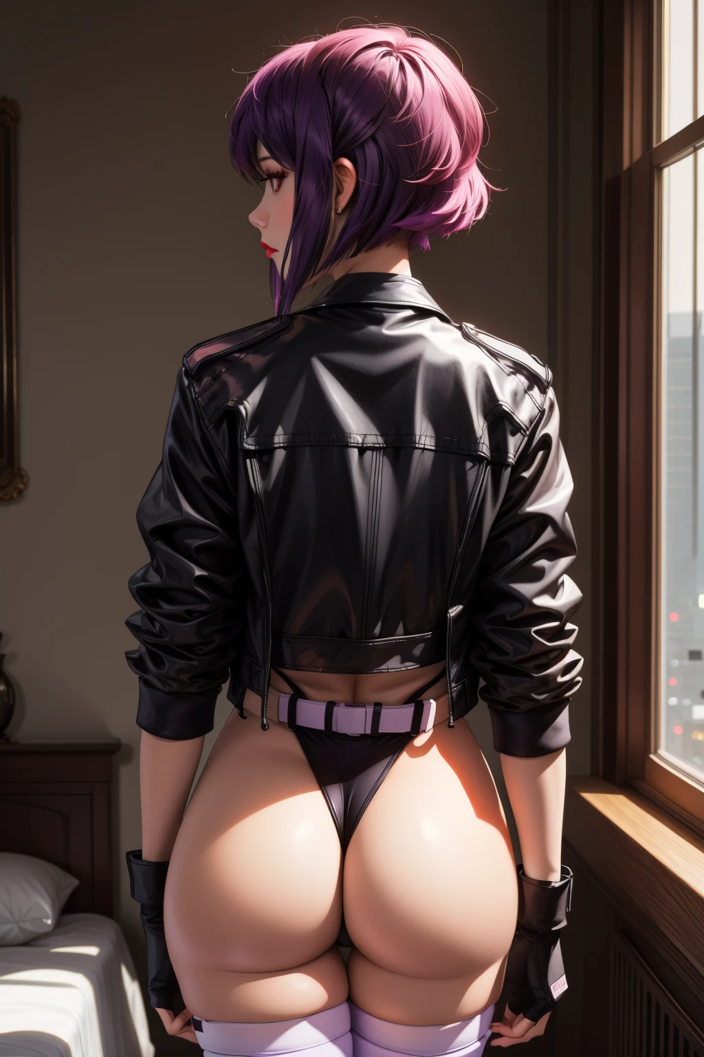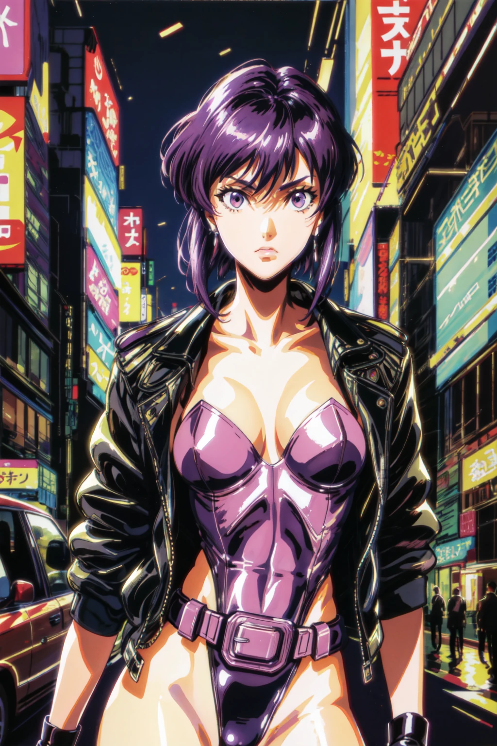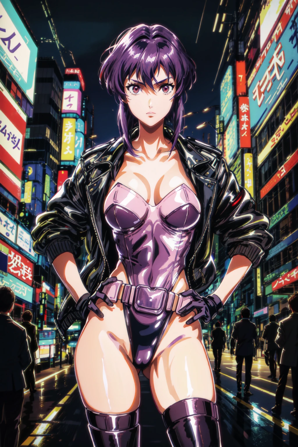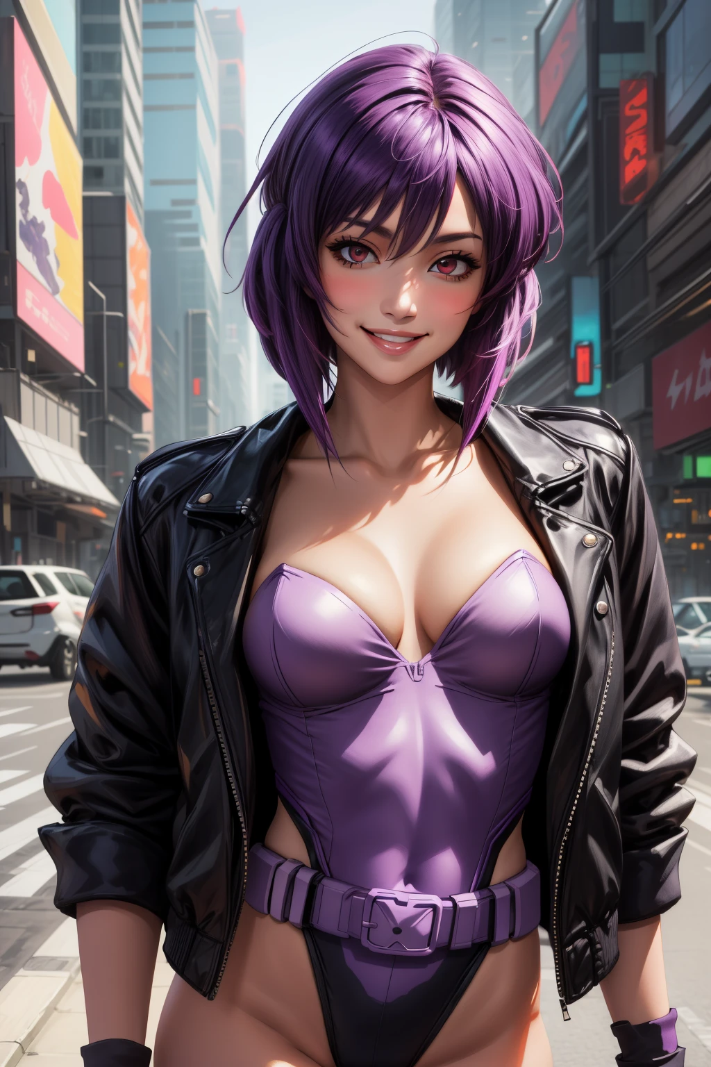 motokoalone,kusanagi motoko, asymmetrical hair, short hair, purple hair,red eyes,lips, black fingerless gloves, purple thighhighs, purple leotard, black jacket, cleavage, highleg leotard, large breasts, belt