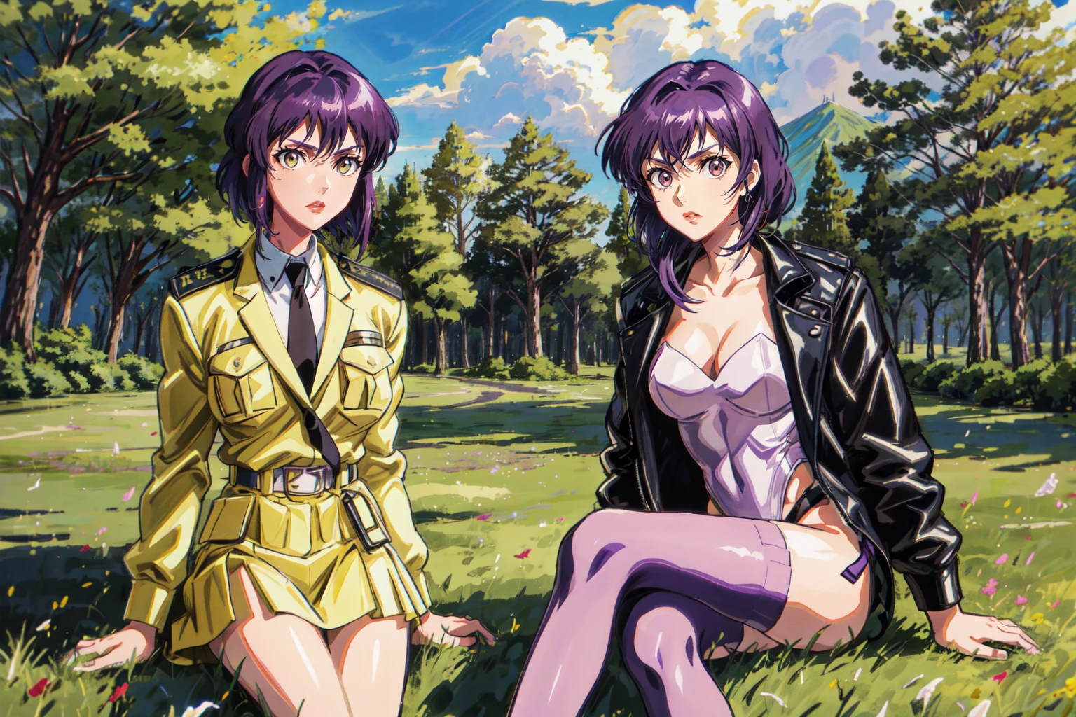 motokoalones, kusanagi motoko, asymmetrical hair, short hair, purple hair, red eyes, lips, yellow uniform, military uniform, pencil skirt, yellow skirt, belt, necktie, long sleeves