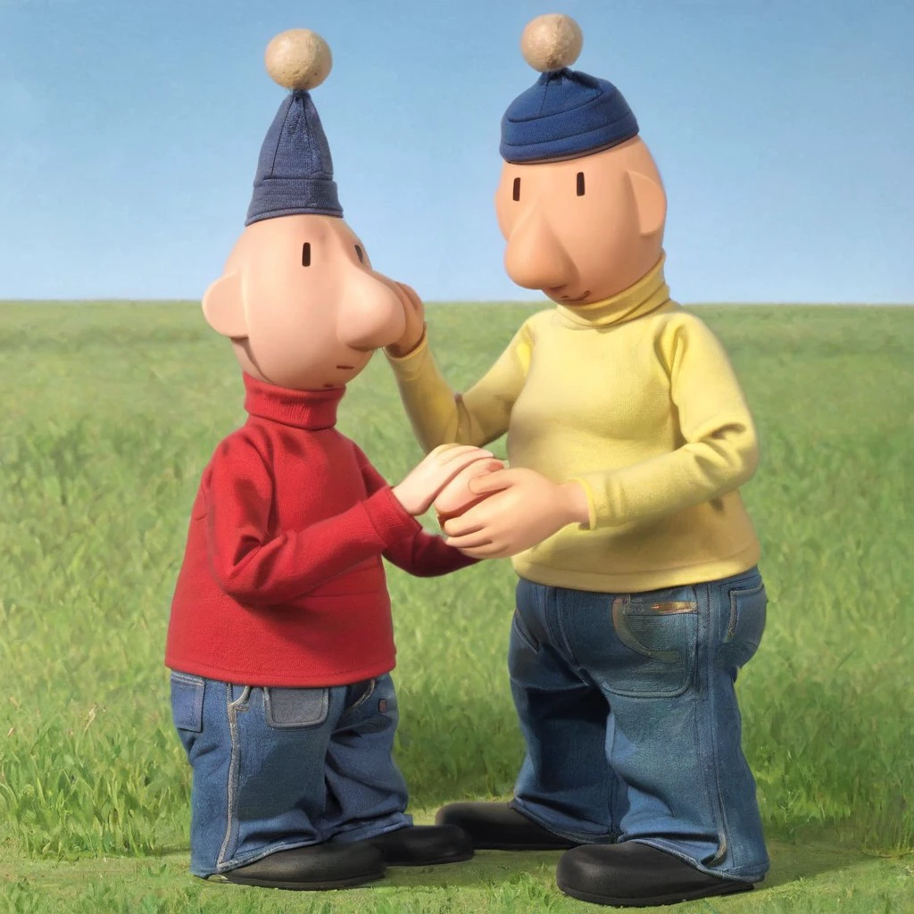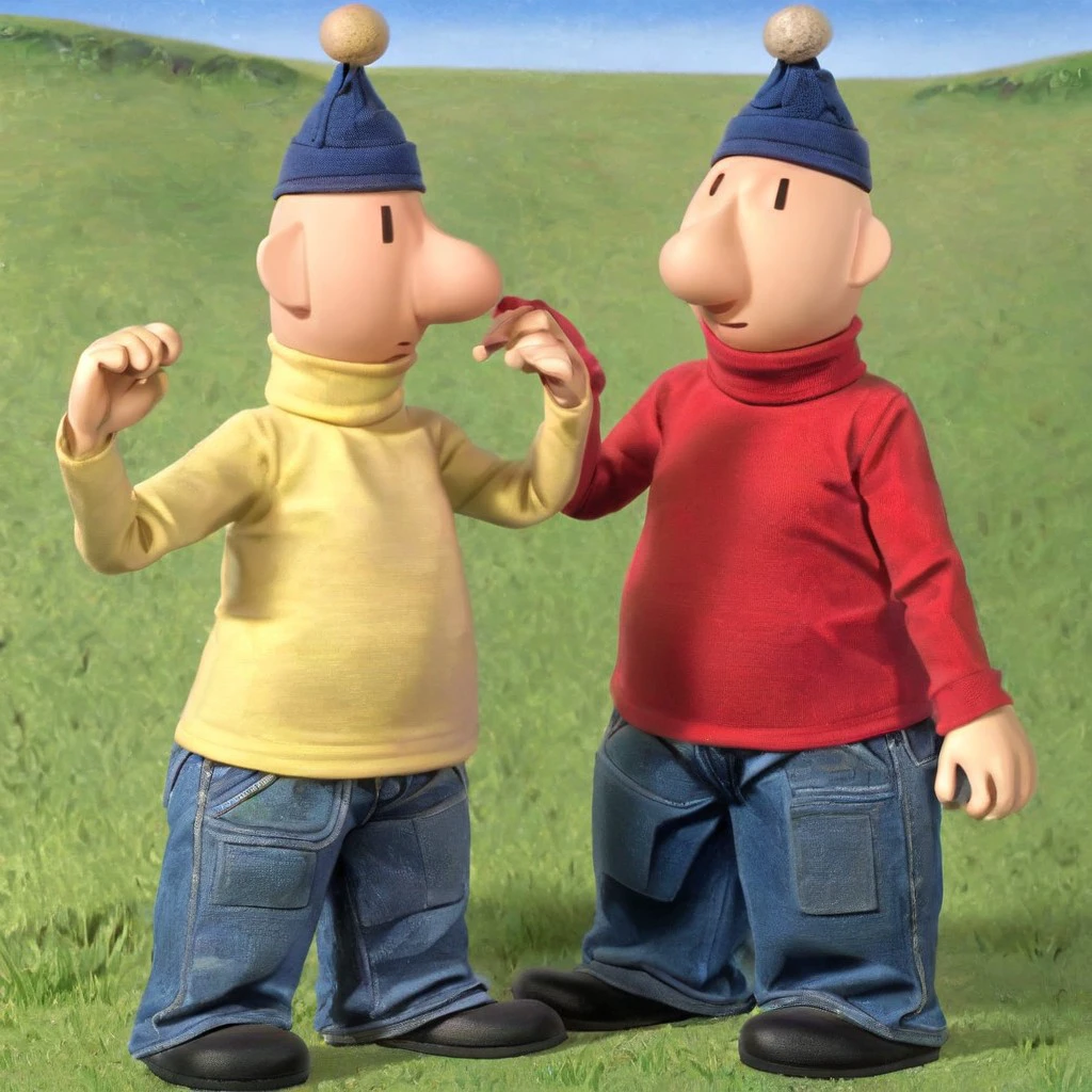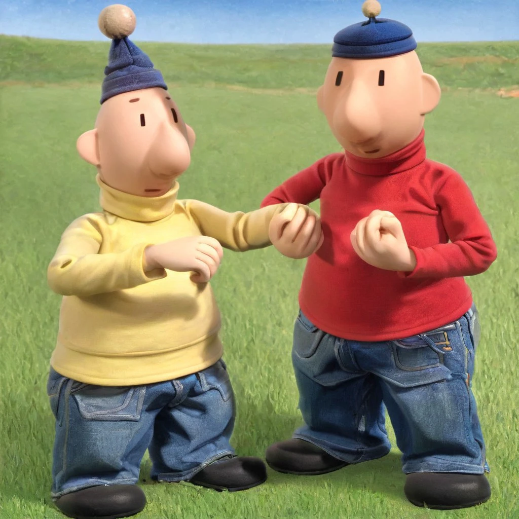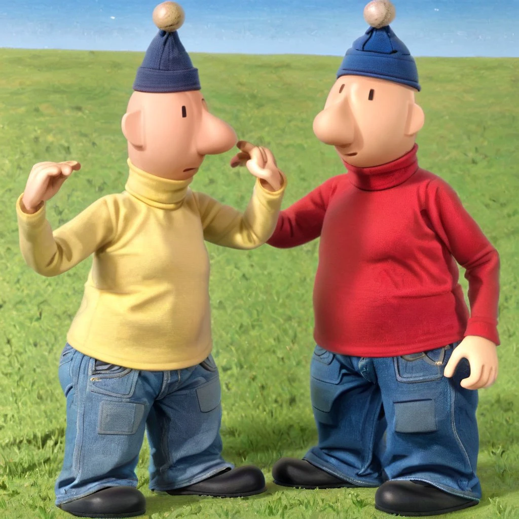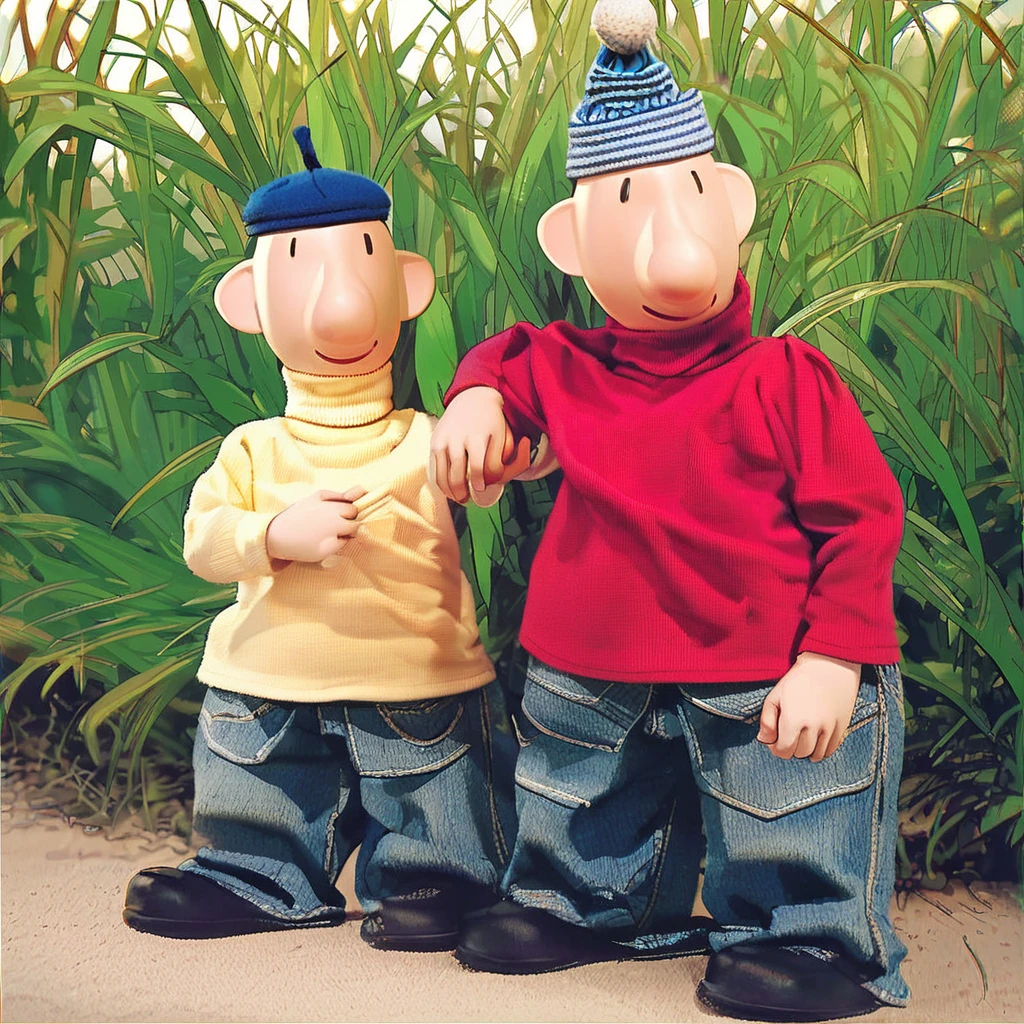 Pat and Mat, pat, mat, black dot eyes, bald head, red turtleneck, yellow turtleneck, denim jeans, black shoes, blue beret, blue beanie, light skin, 2boys, seperate people