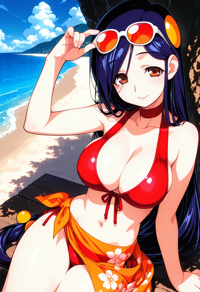 kurenai_kaede, navy hair, long hair, loosely_tucked_bangs, yellow_hair_ornament, tareme, brown eyes, lips,