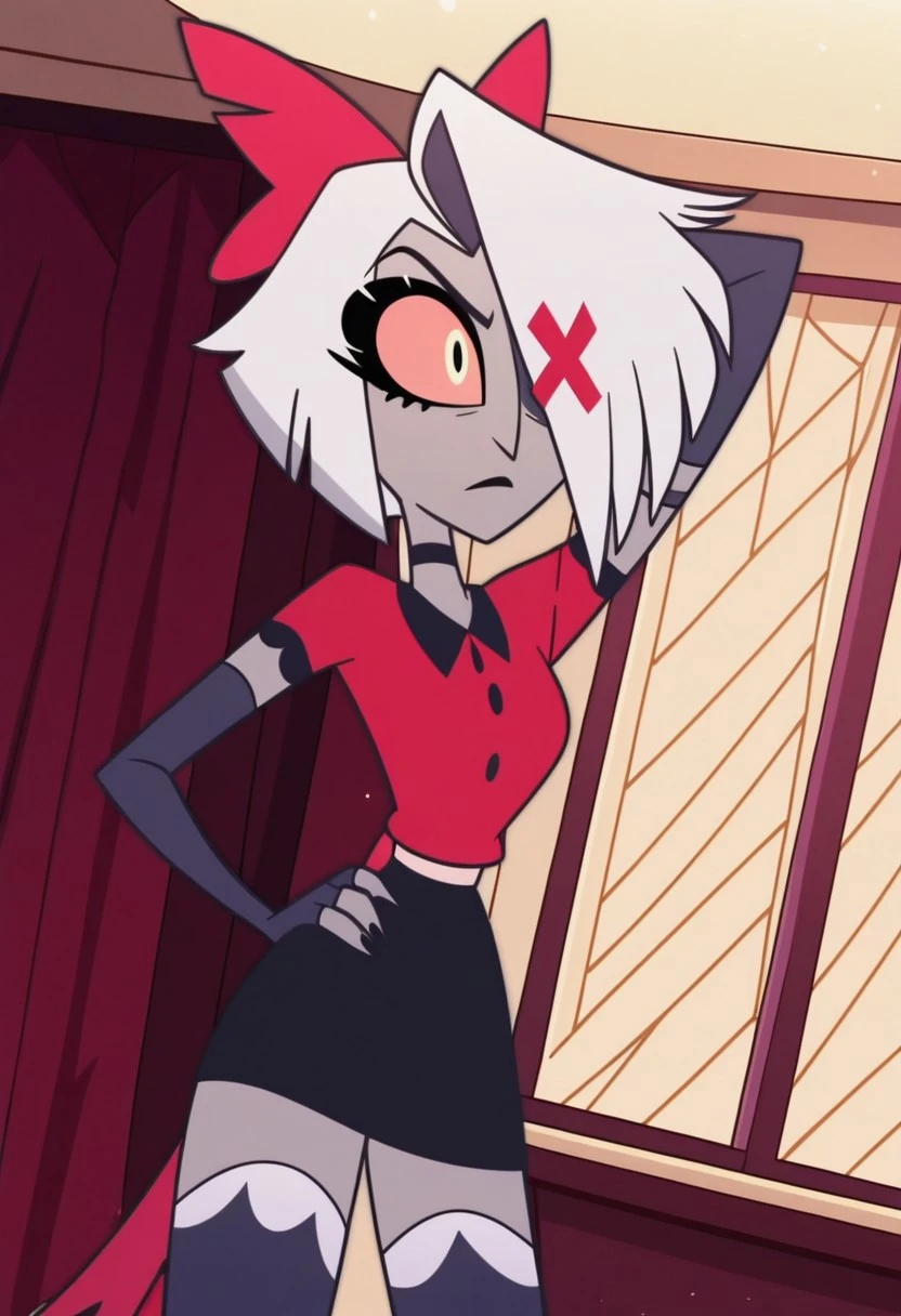 grey skin, hair over one eye, white hair, long hair, colored sclera, hair bow, X-shaped eye patch, choker, red shirt, elbow gloves, white waistband, fingerless gloves, miniskirt, thighhighs, 4 fingers