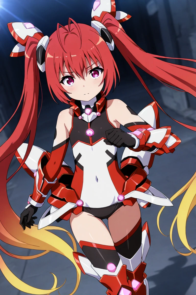 tailred, red hair, gradient hair, long hair, twintails, antenna hair, bangs, hair between eyes, pink eyes, headgear, armor, bare shoulders, black thighhighs, boots, covered navel, elbow gloves, faulds, flat chest, greaves, halterneck, leotard, thighhighs, turtleneck, vambraces