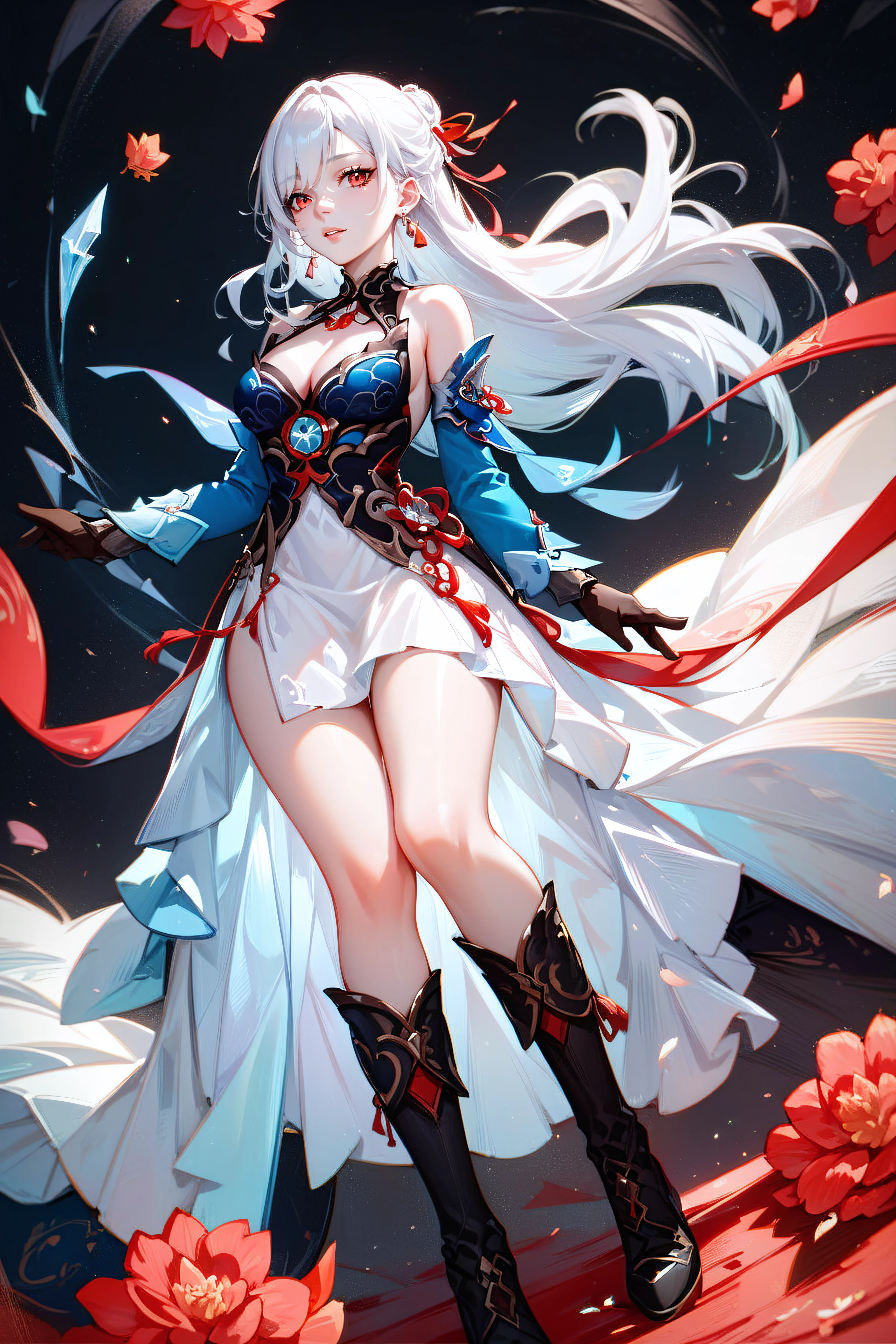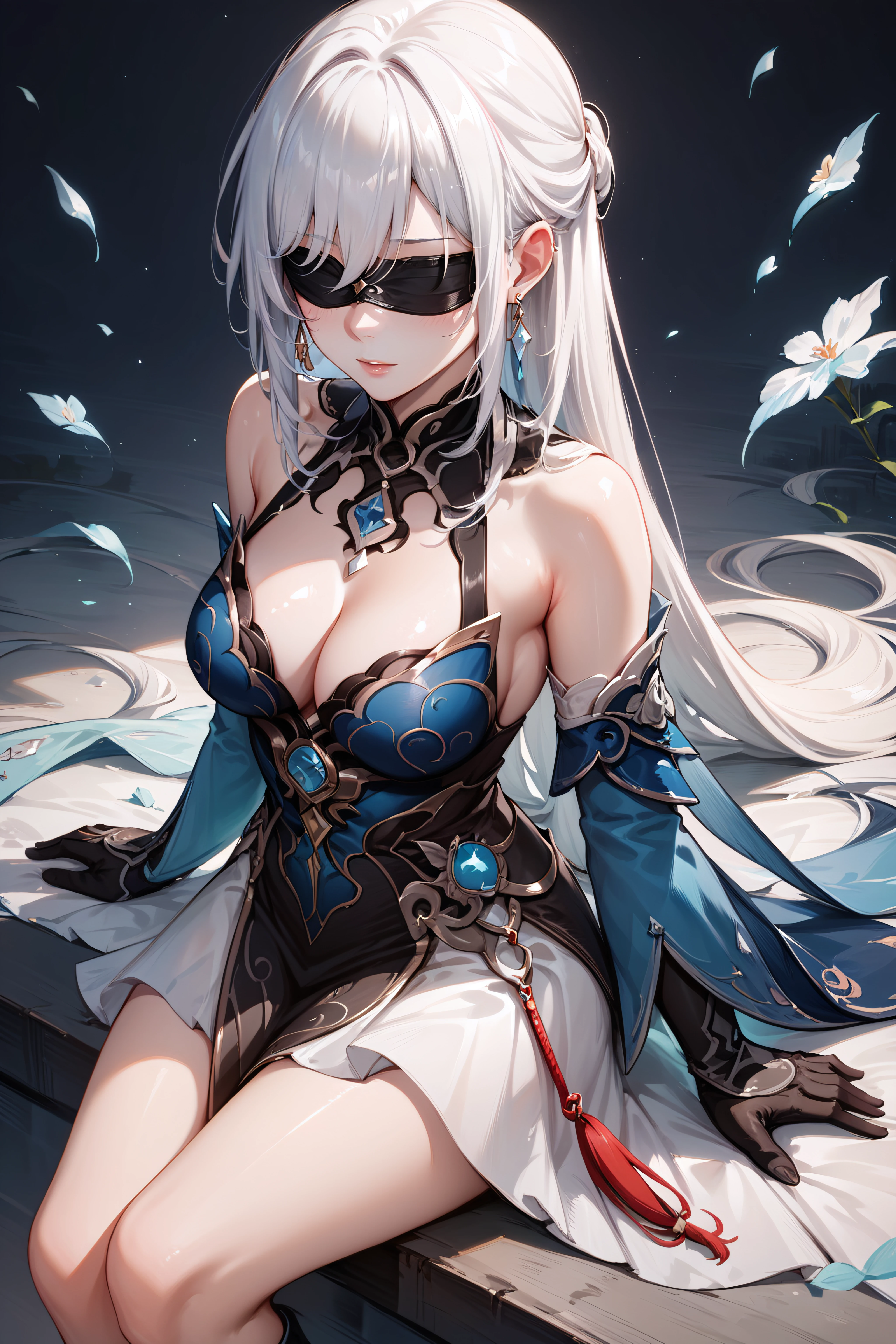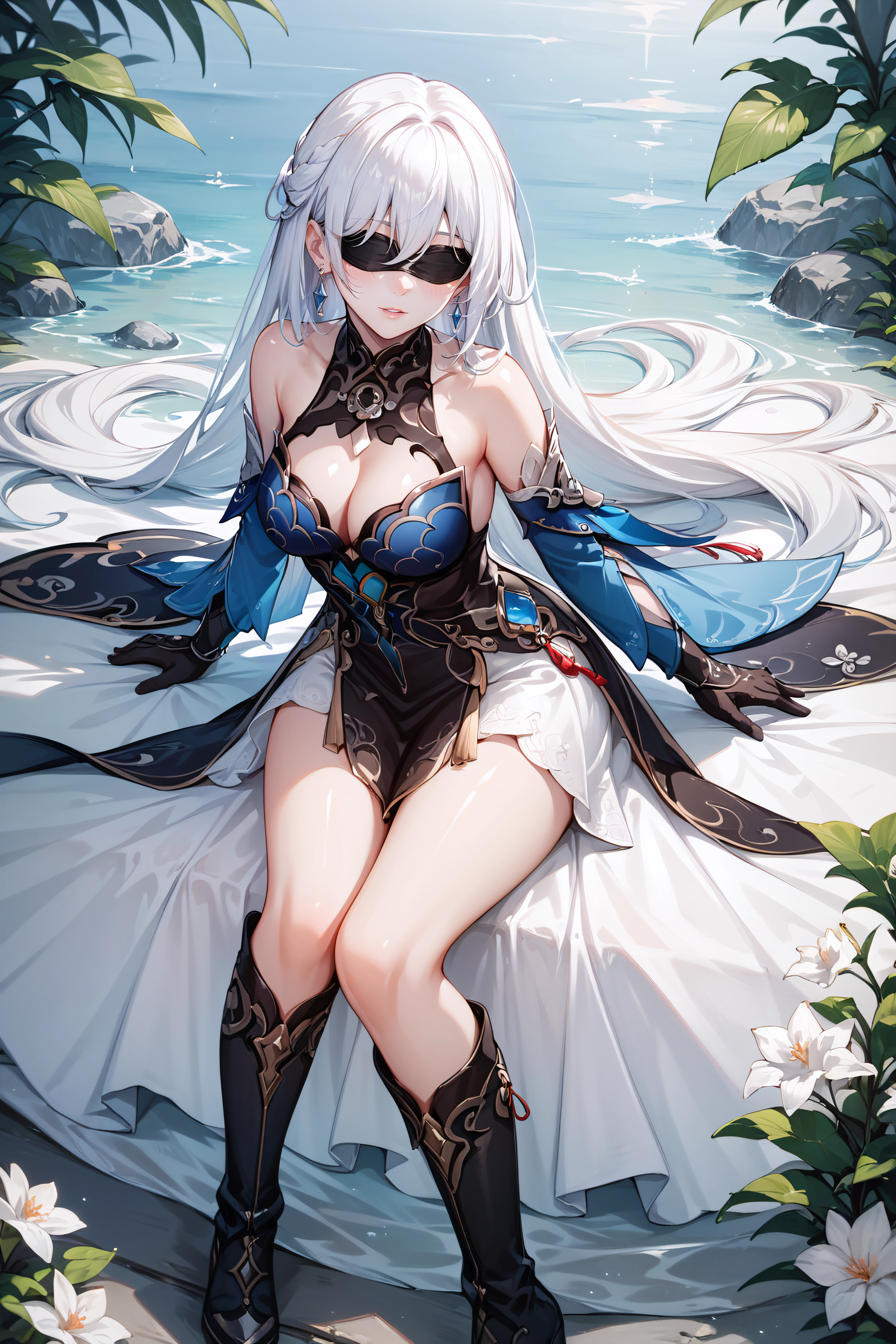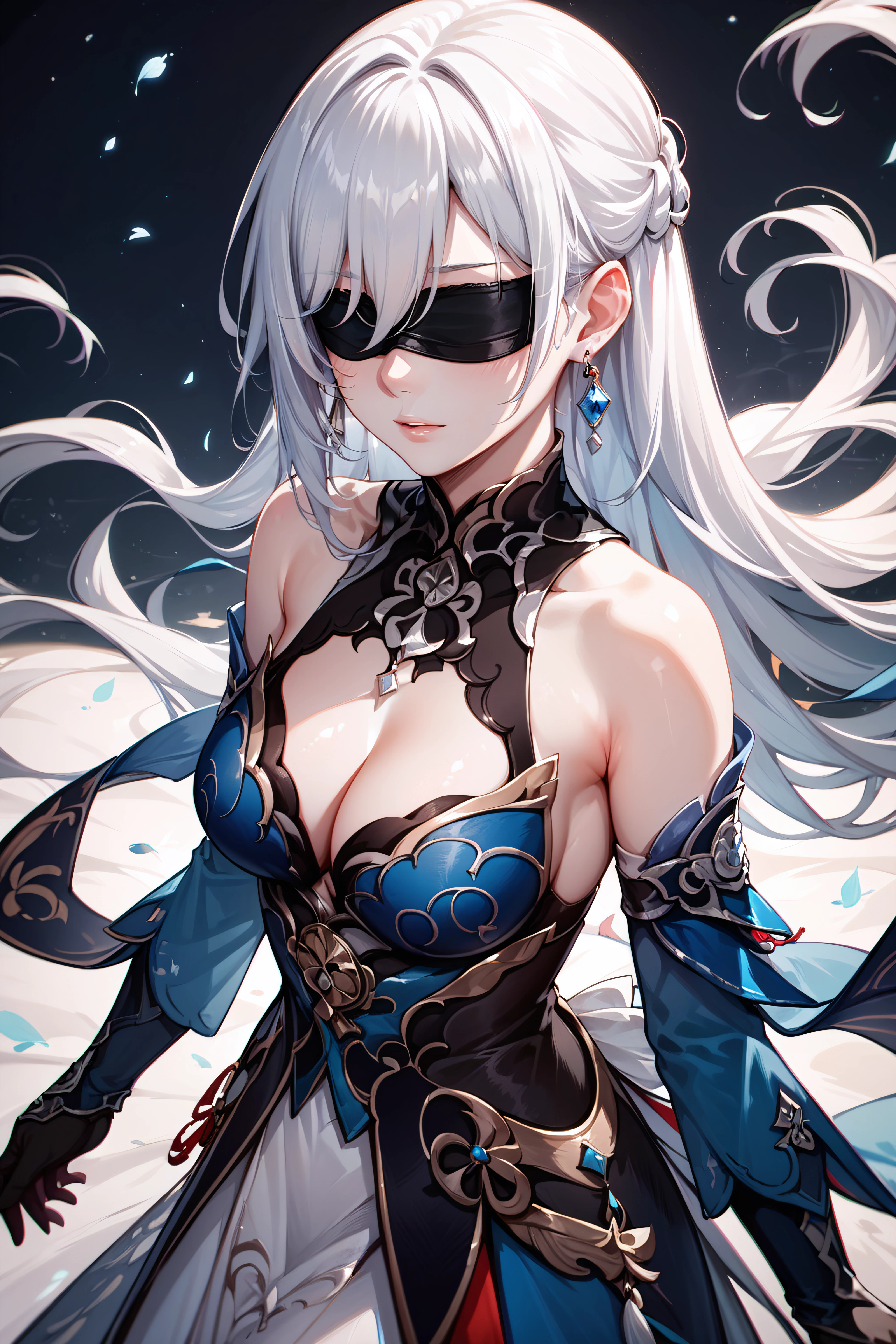 jingliu, black blindfold, white hair, long hair, medium breasts, dress, cleavage, bare shoulders, jewelry, earrings, detached sleeves, gloves, boots,