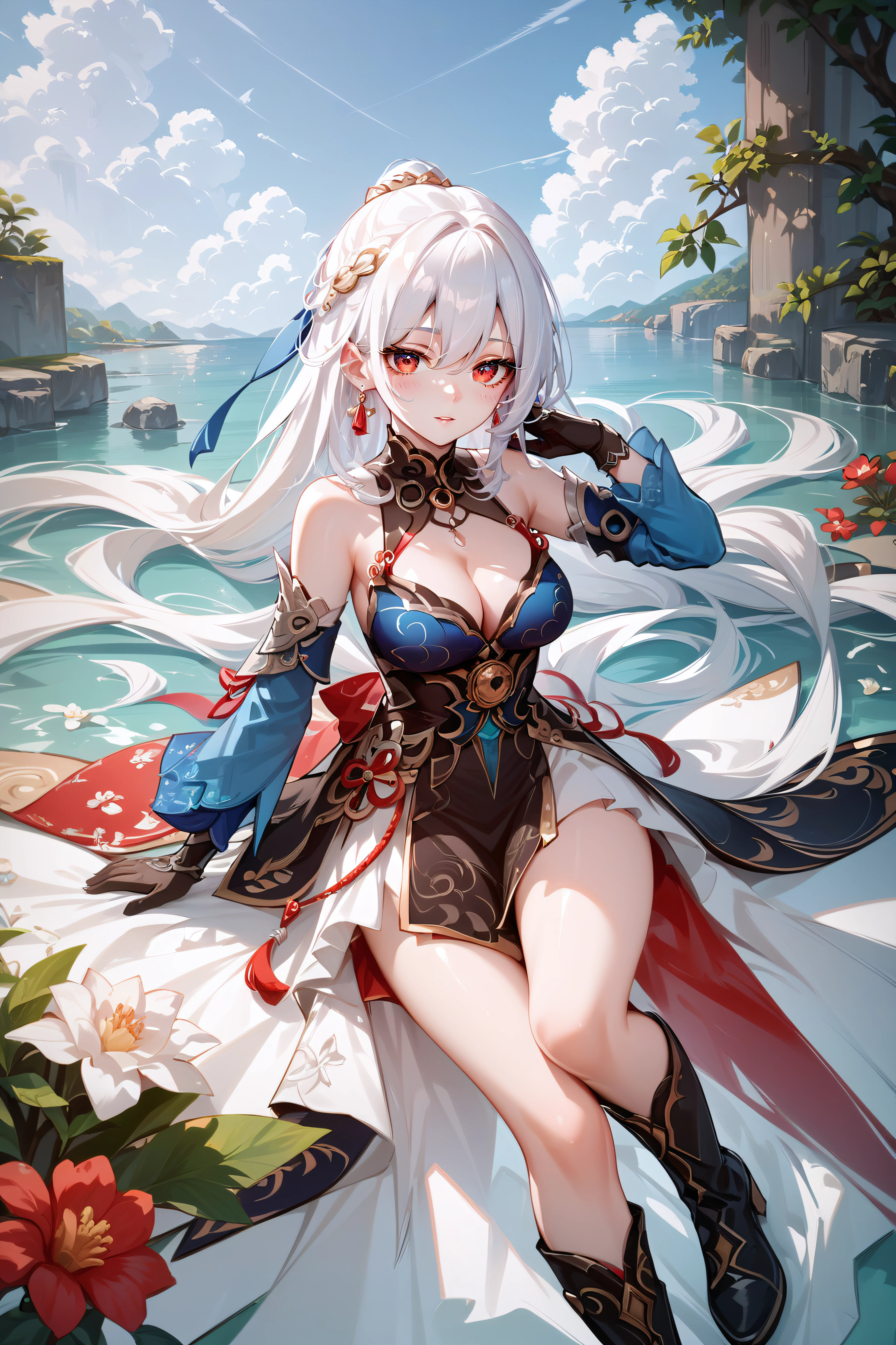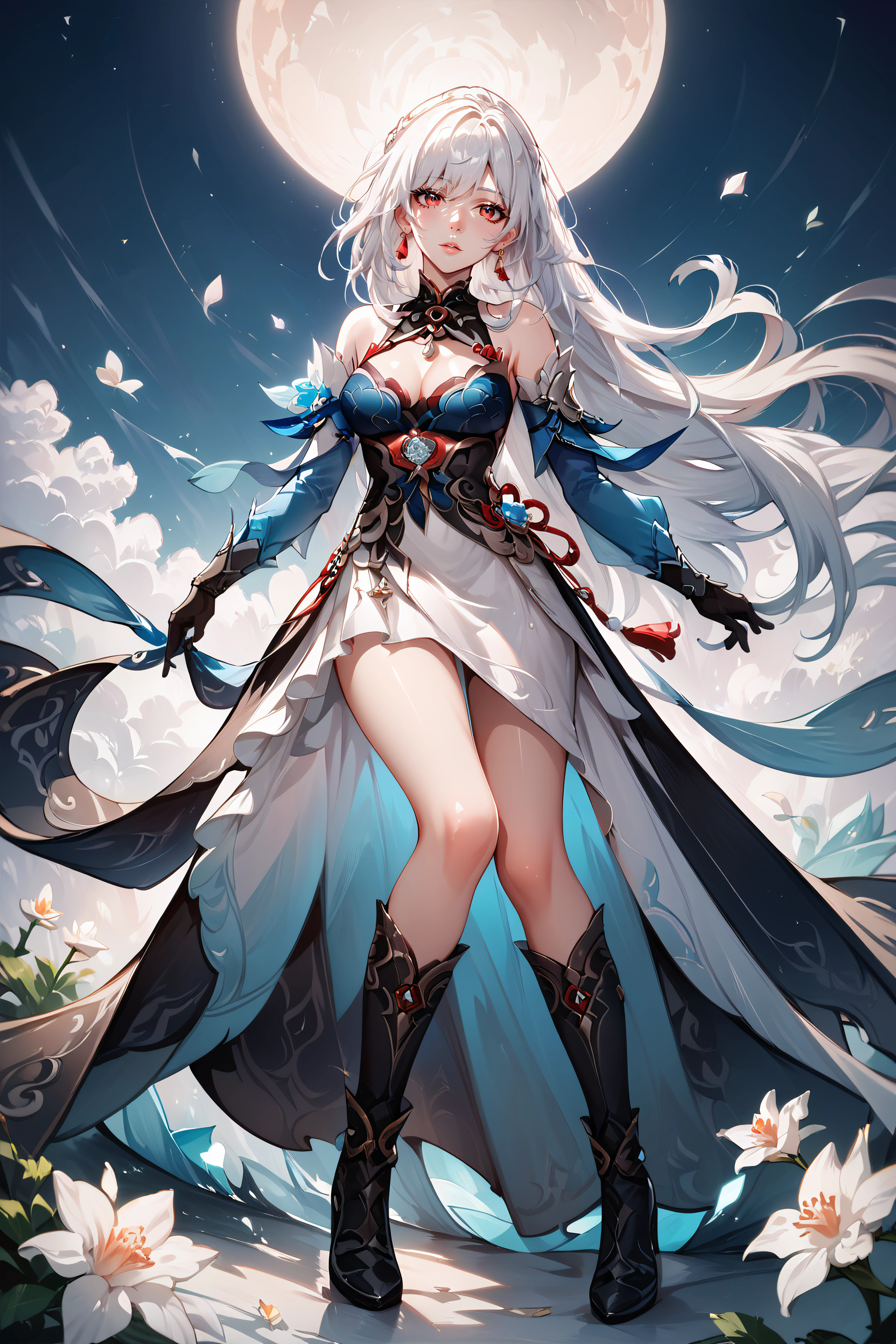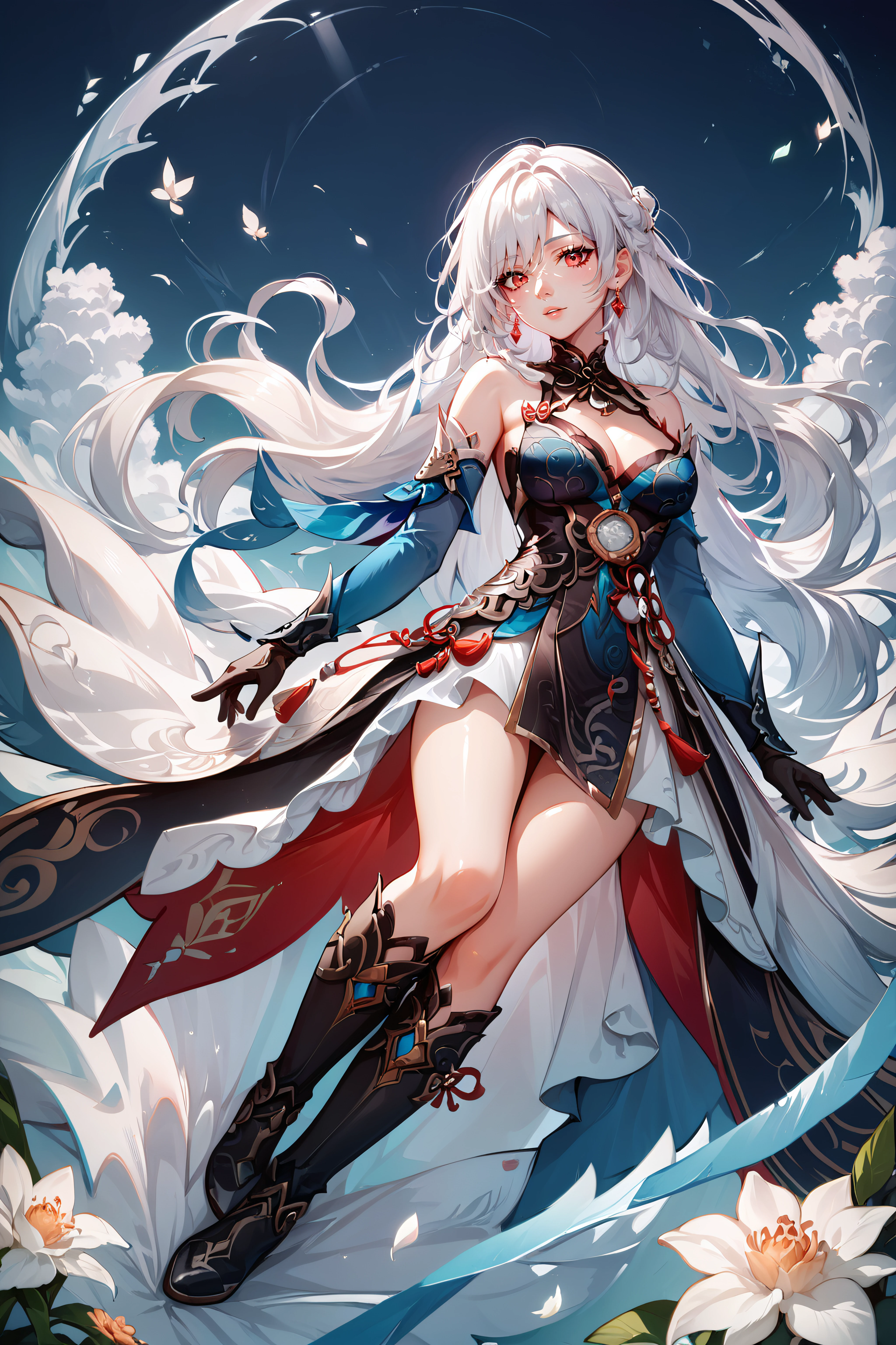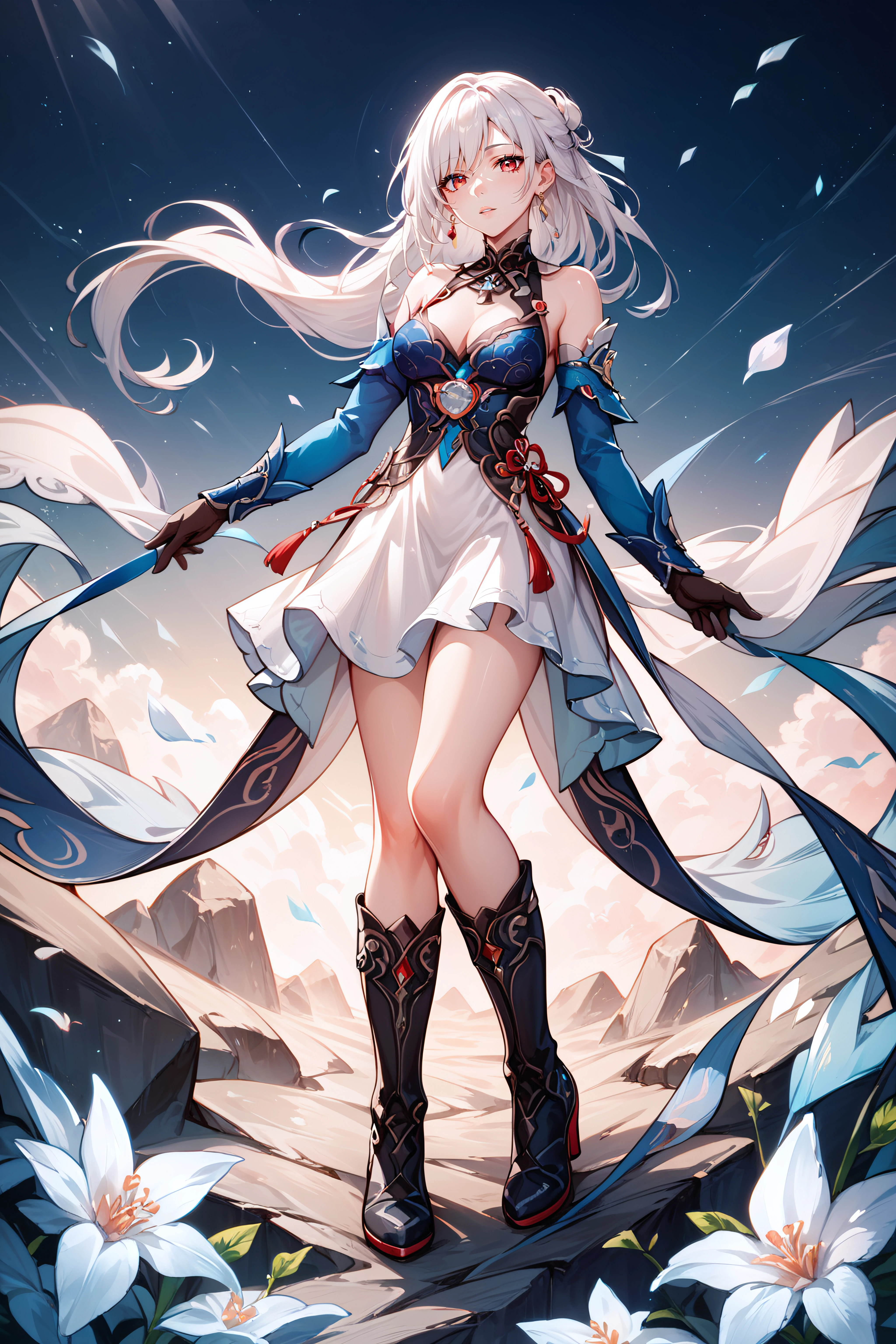 jingliu, black blindfold, white hair, long hair, medium breasts, dress, cleavage, bare shoulders, jewelry, earrings, detached sleeves, gloves, boots,
