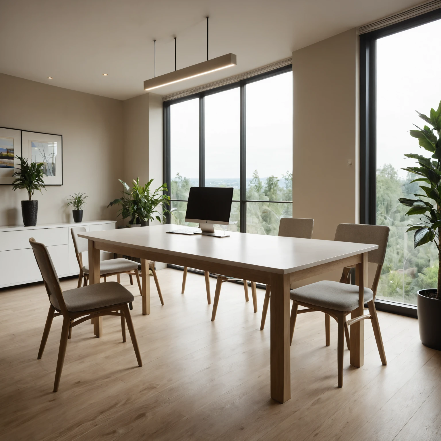 modern_workspace, no humans, scenery, window, indoors, chair, table, plant