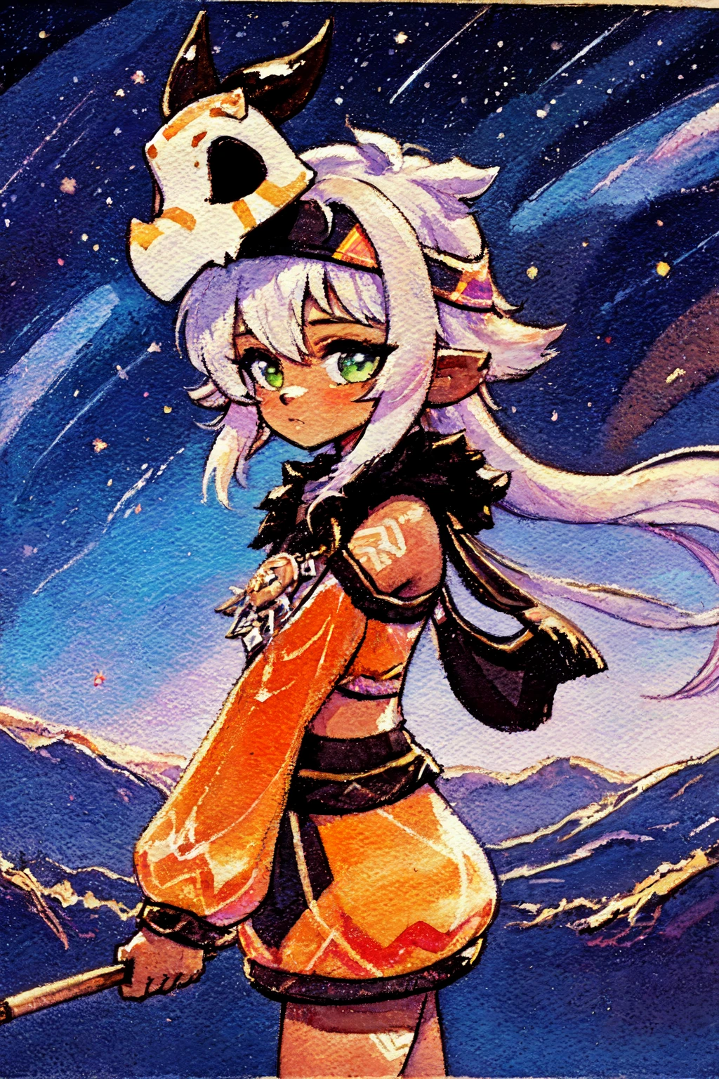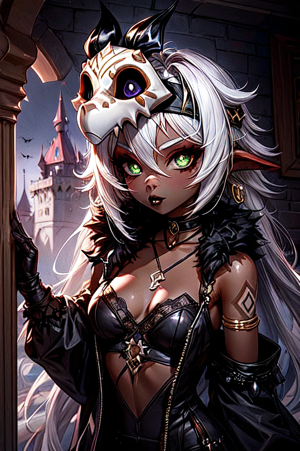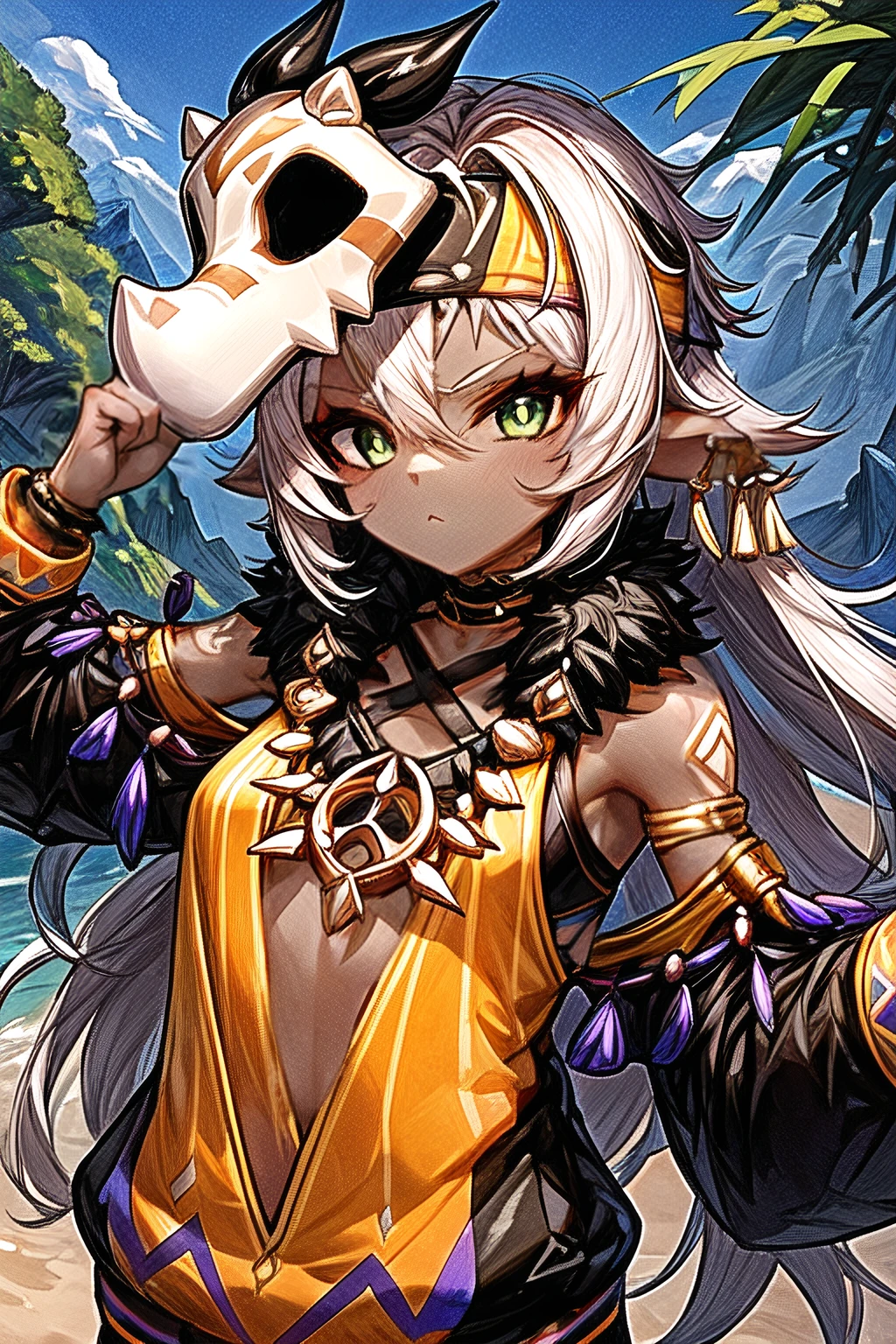 mask on head, earrings, detached sleeves