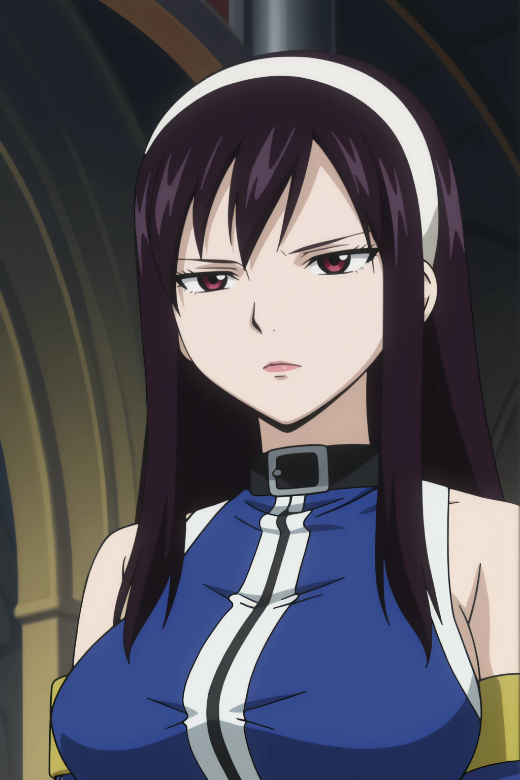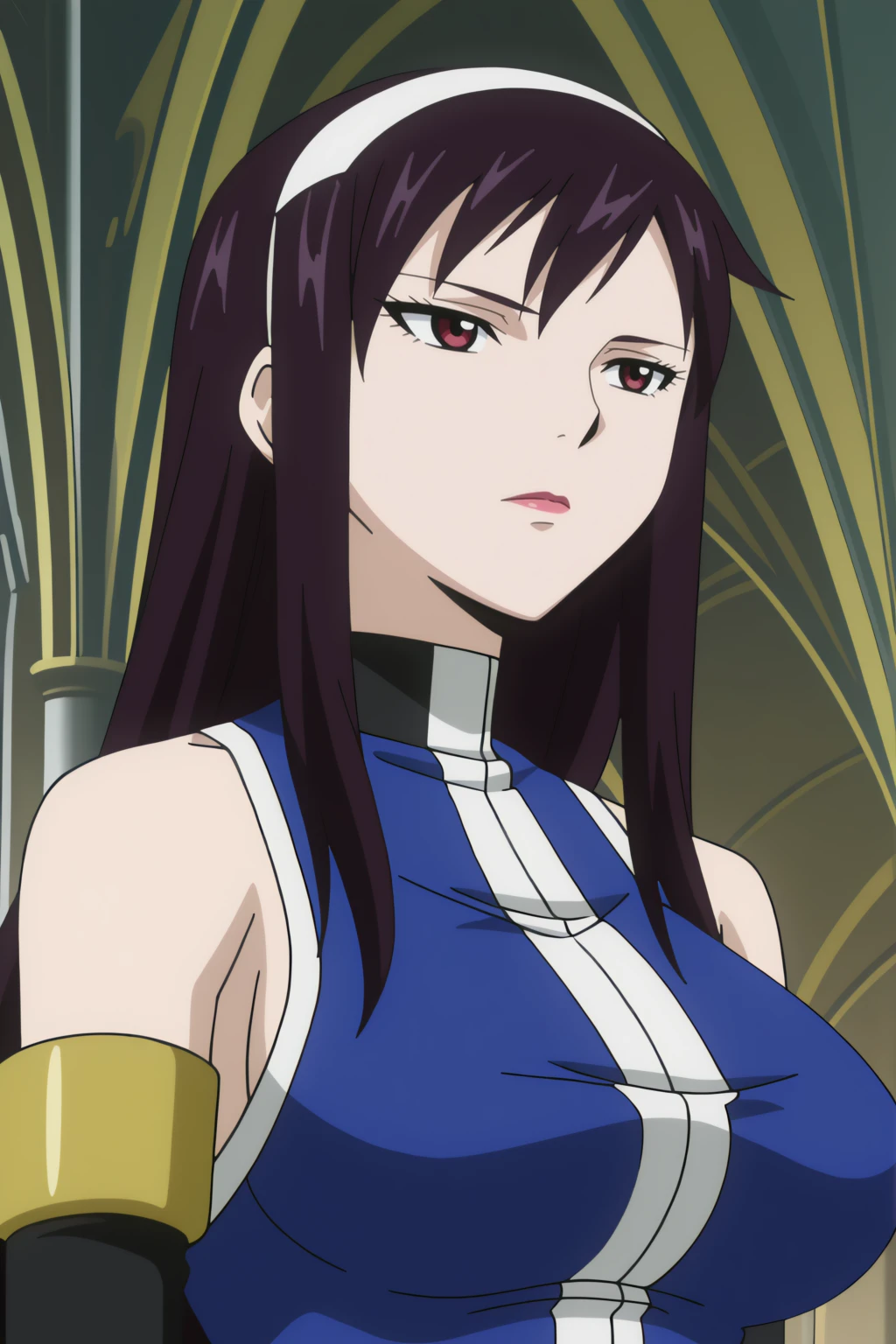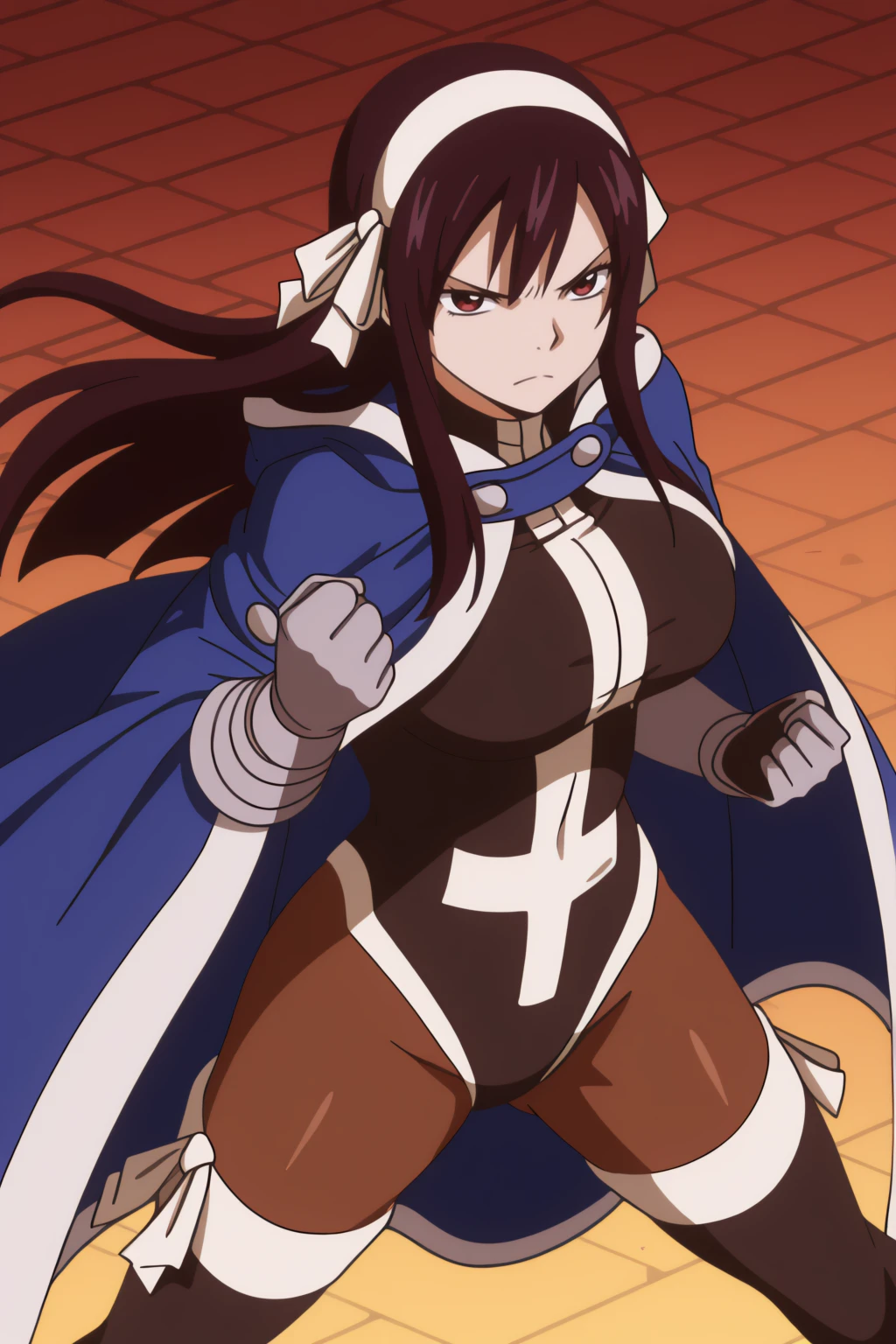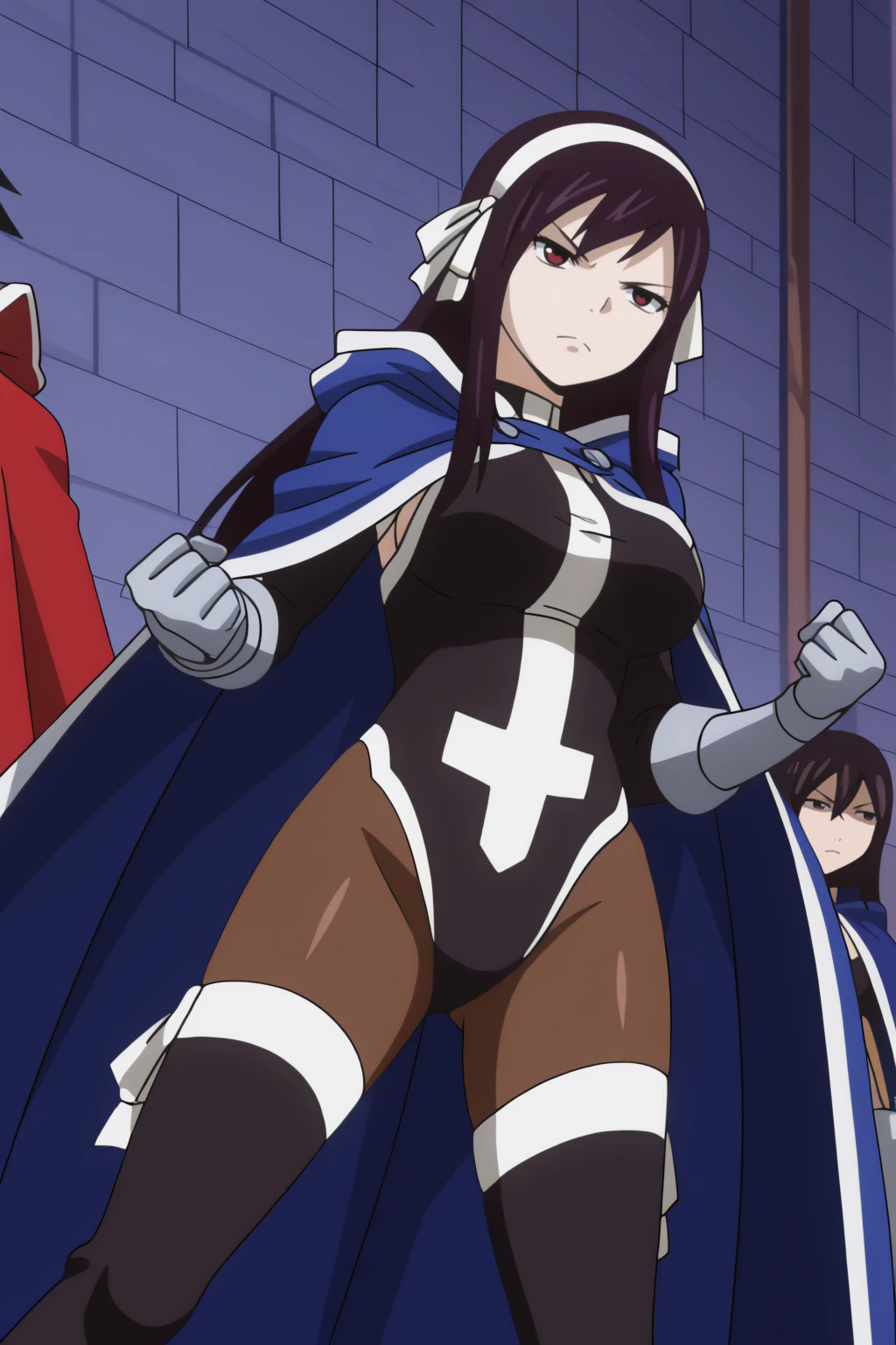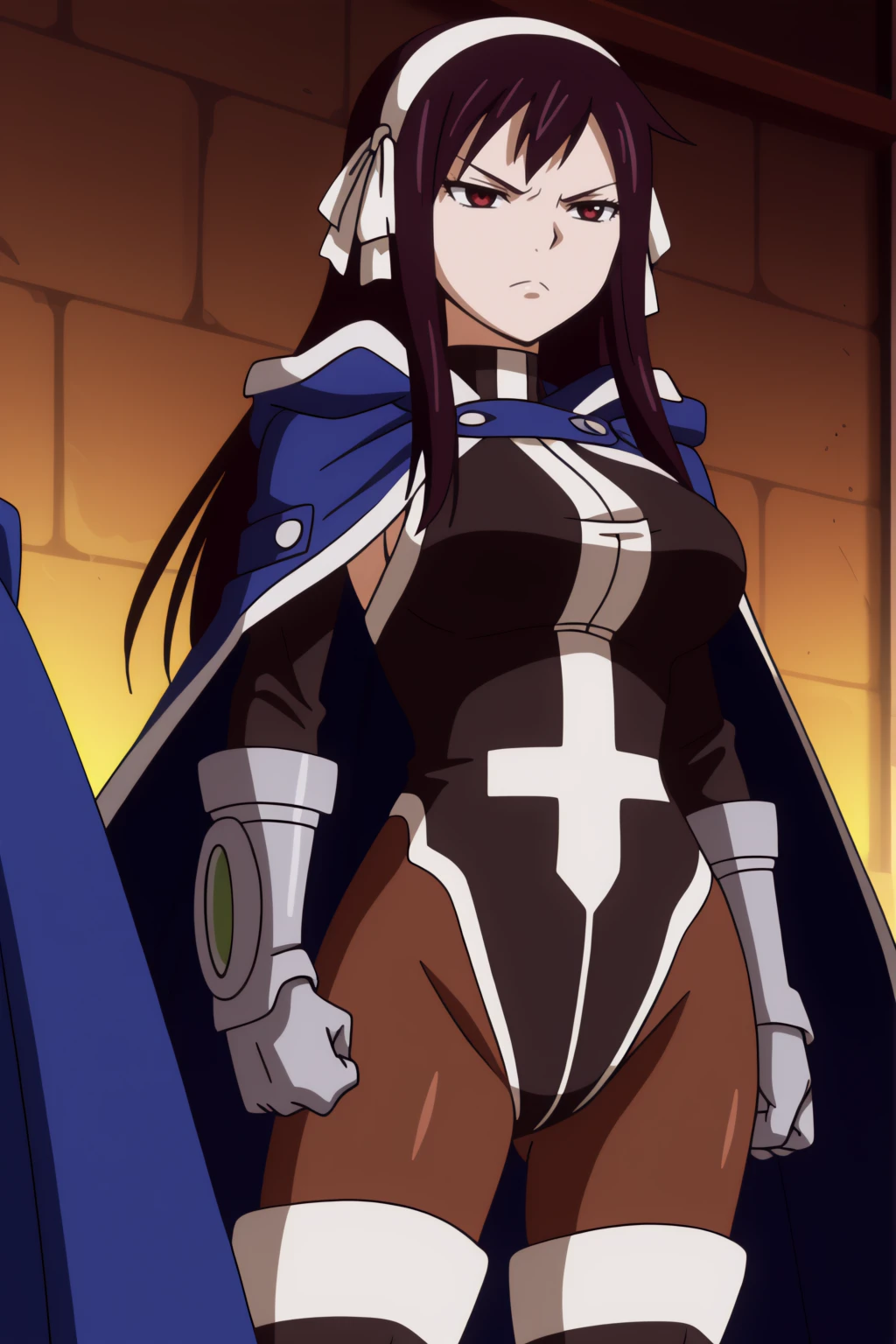 gloves, thighhighs, ribbon, pantyhose, boots, cape, leotard, v-shaped eyebrows, frown, thigh boots, cross, clenched hand, gauntlets, white ribbon, cloak, clenched hands, white hairband, blue cape, thighhighs over pantyhose