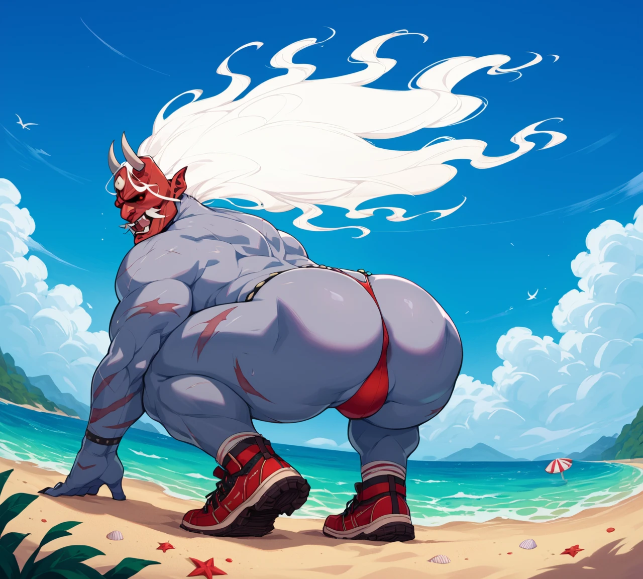 TheOniDBD, Dead By Daylight, oni, demon, humanoid, red mask, long white hair, grey body, male, muscular, barazoku