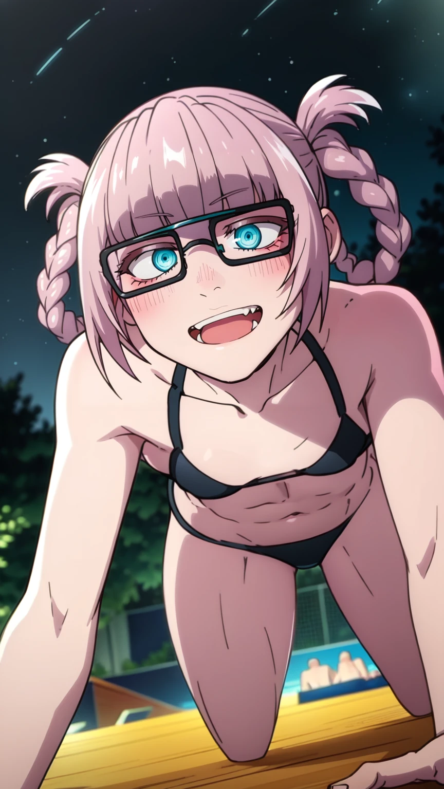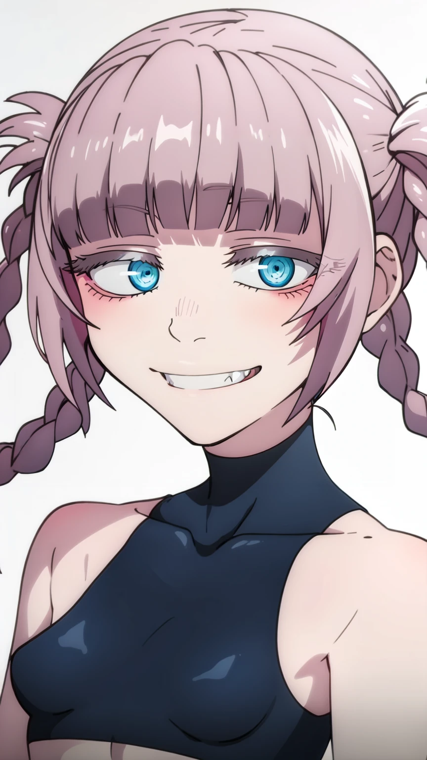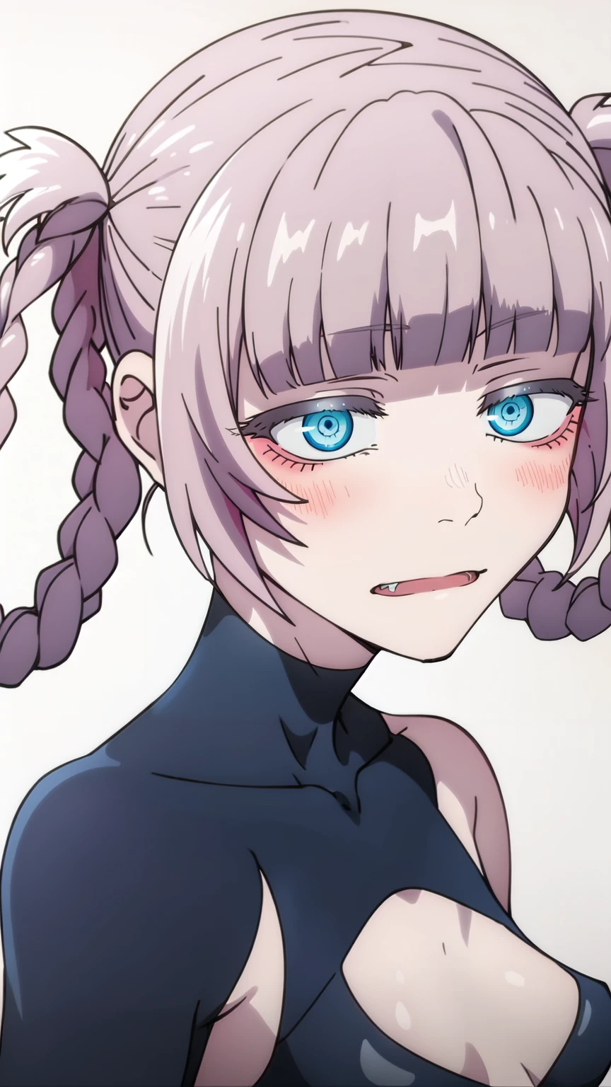 ( cyan eyes_pink hair_braids_twin braid tails_hair bangs_blunt bangs_((hair loops_sidelocks)))_(small breasts:1.2)fangs