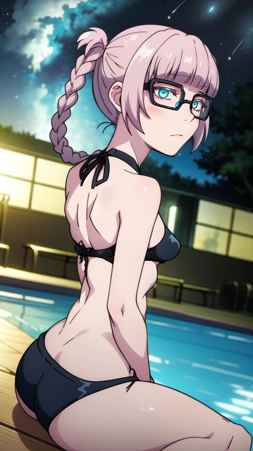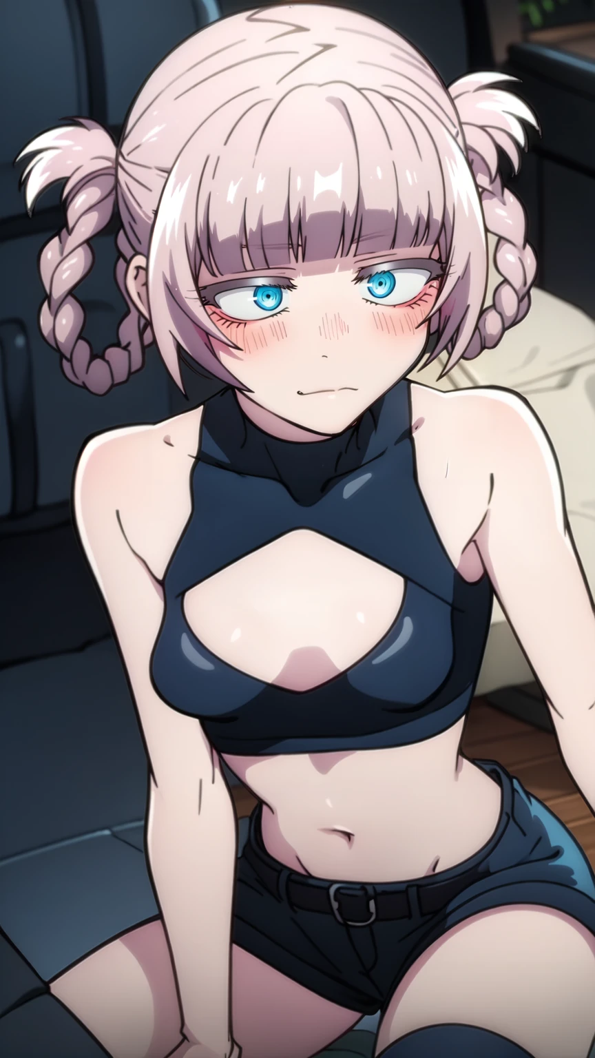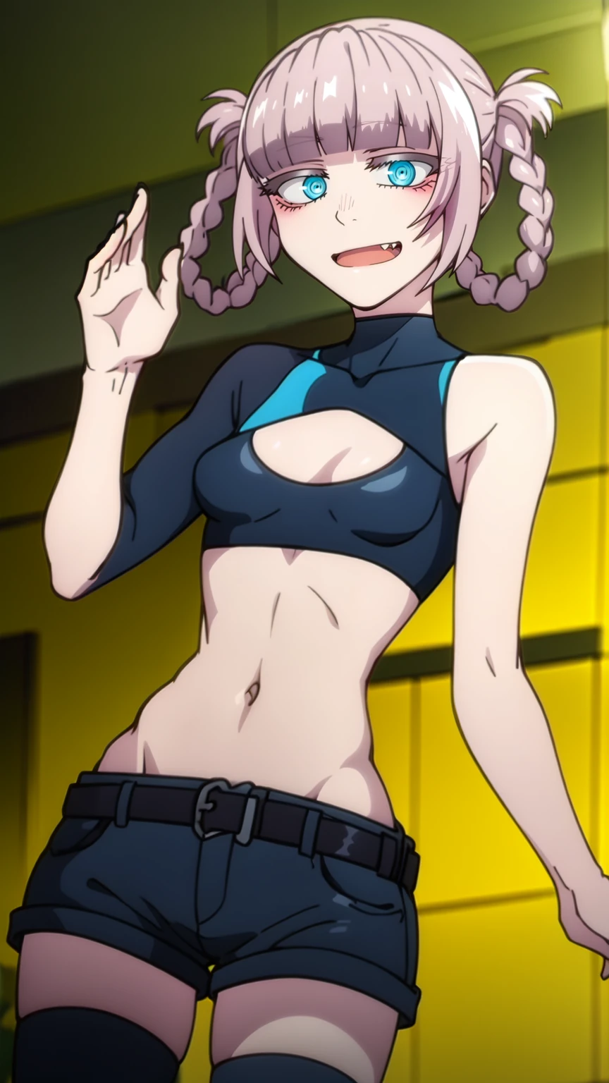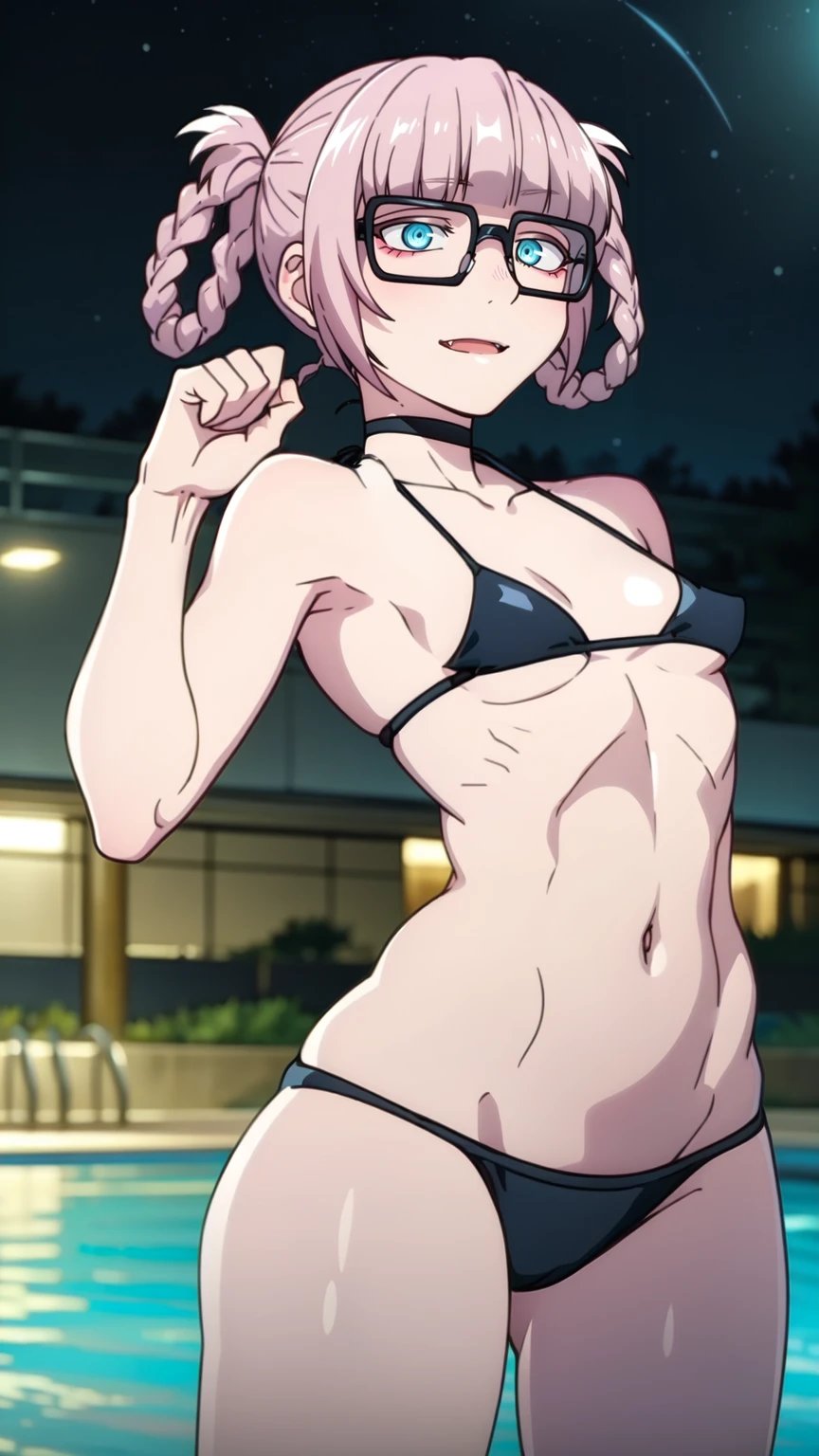 ( cyan eyes_pink hair_braids_twin braid tails_hair bangs_blunt bangs_((hair loops_sidelocks)))_(small breasts:1.2)fangs