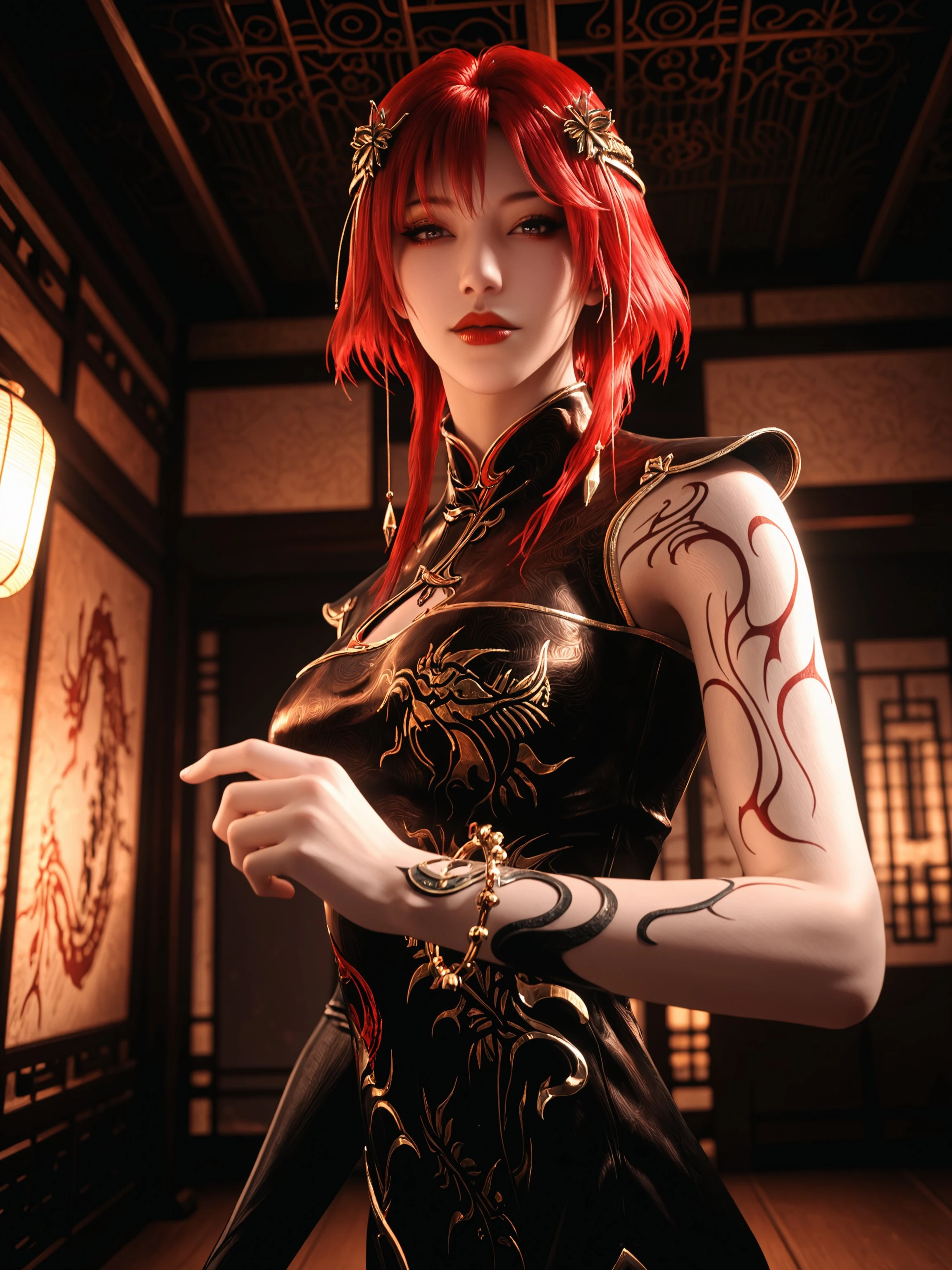 1girl, chinese clothes, red hair, solo, dress, china dress, tattoo, hair ornament, gold trim, short hair, black dress, short dress, lips, jewelry, red lips, arm tattoo,