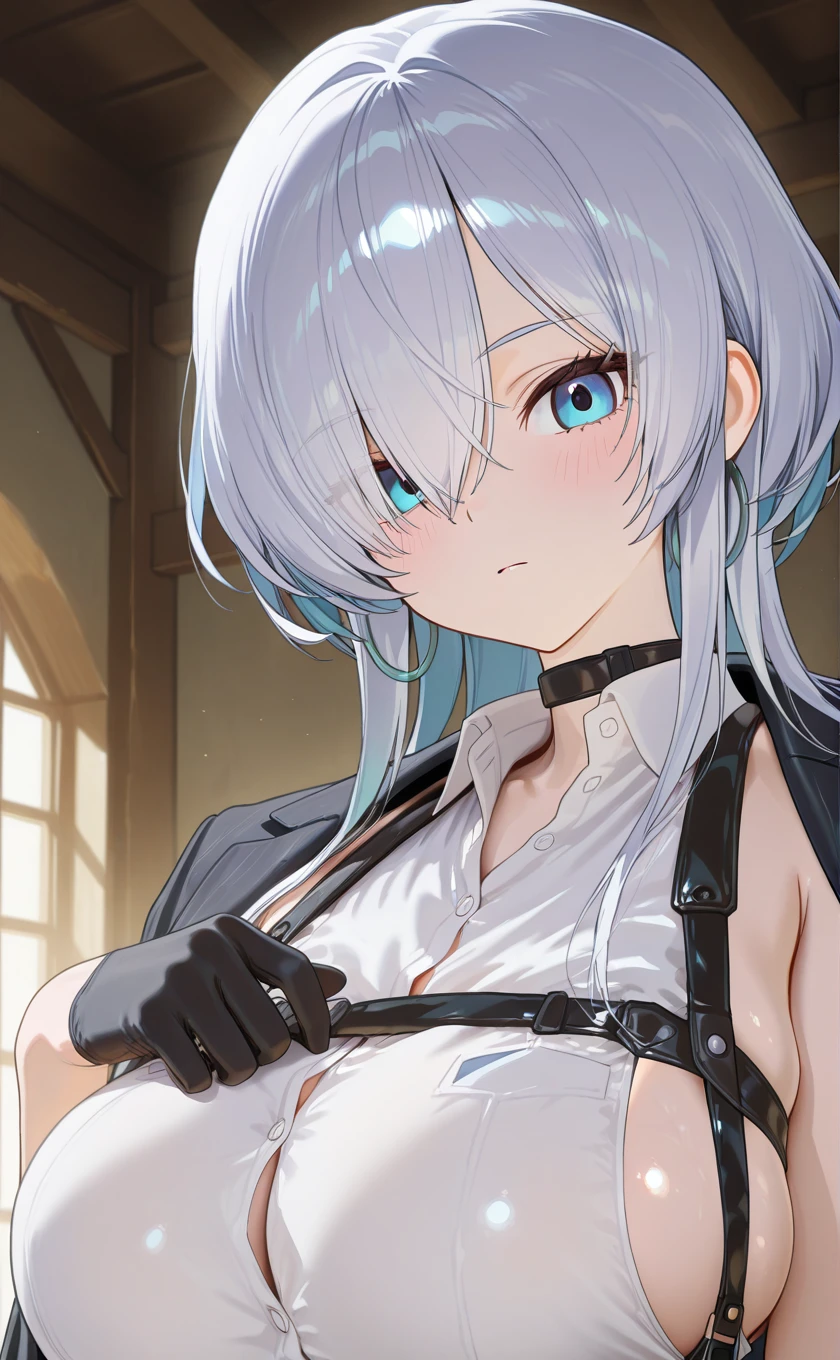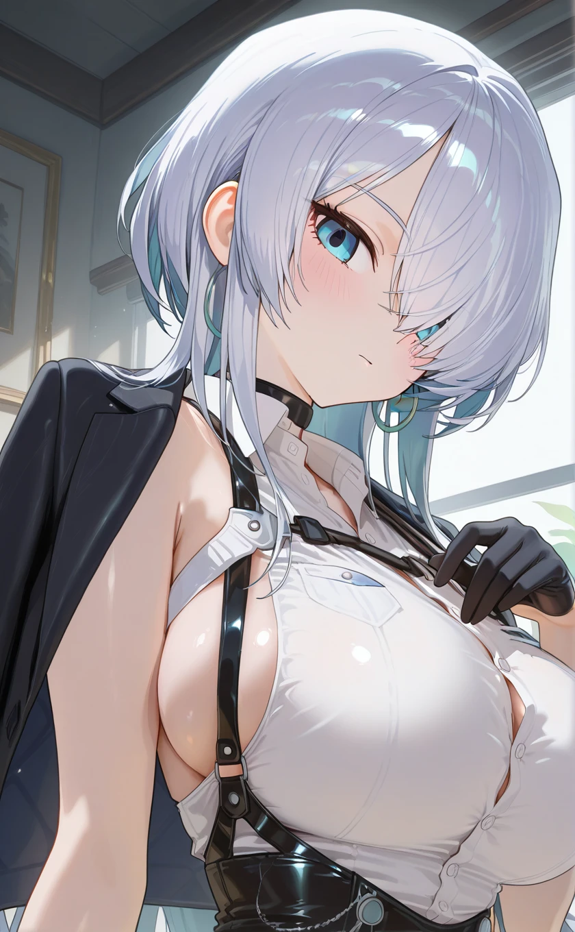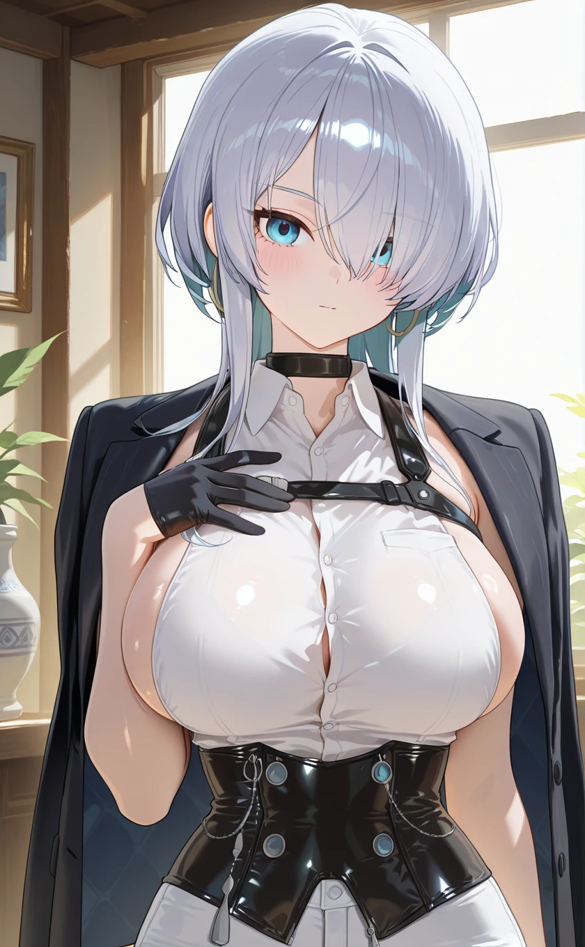 black choker,black jacket,jacket on shoulders,white shirt,collared shirt,sleeveless shirt,half gloves,black gloves,large breasts,sideboob,black corset,white pants,thigh strap,high heel boots,white footwear