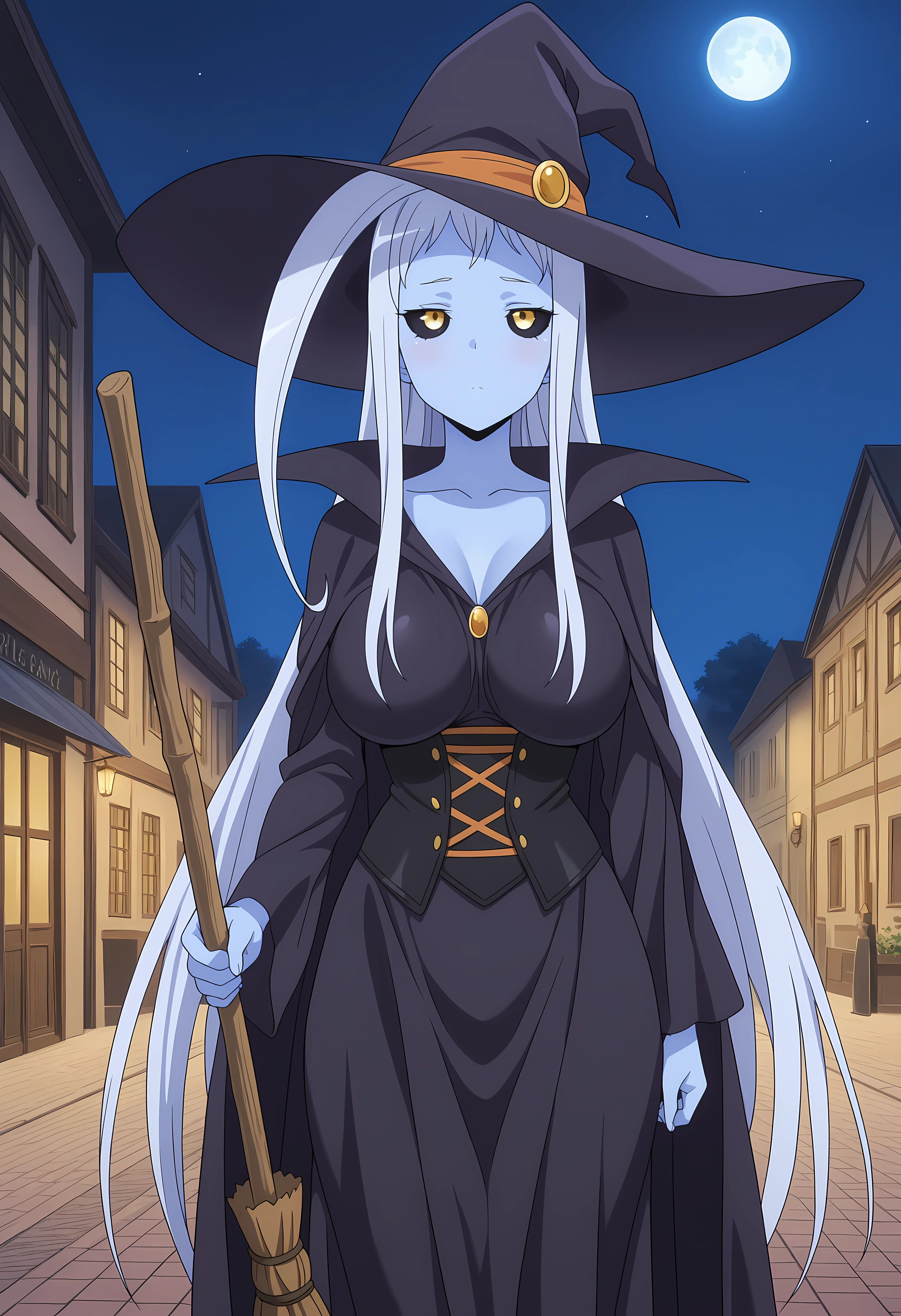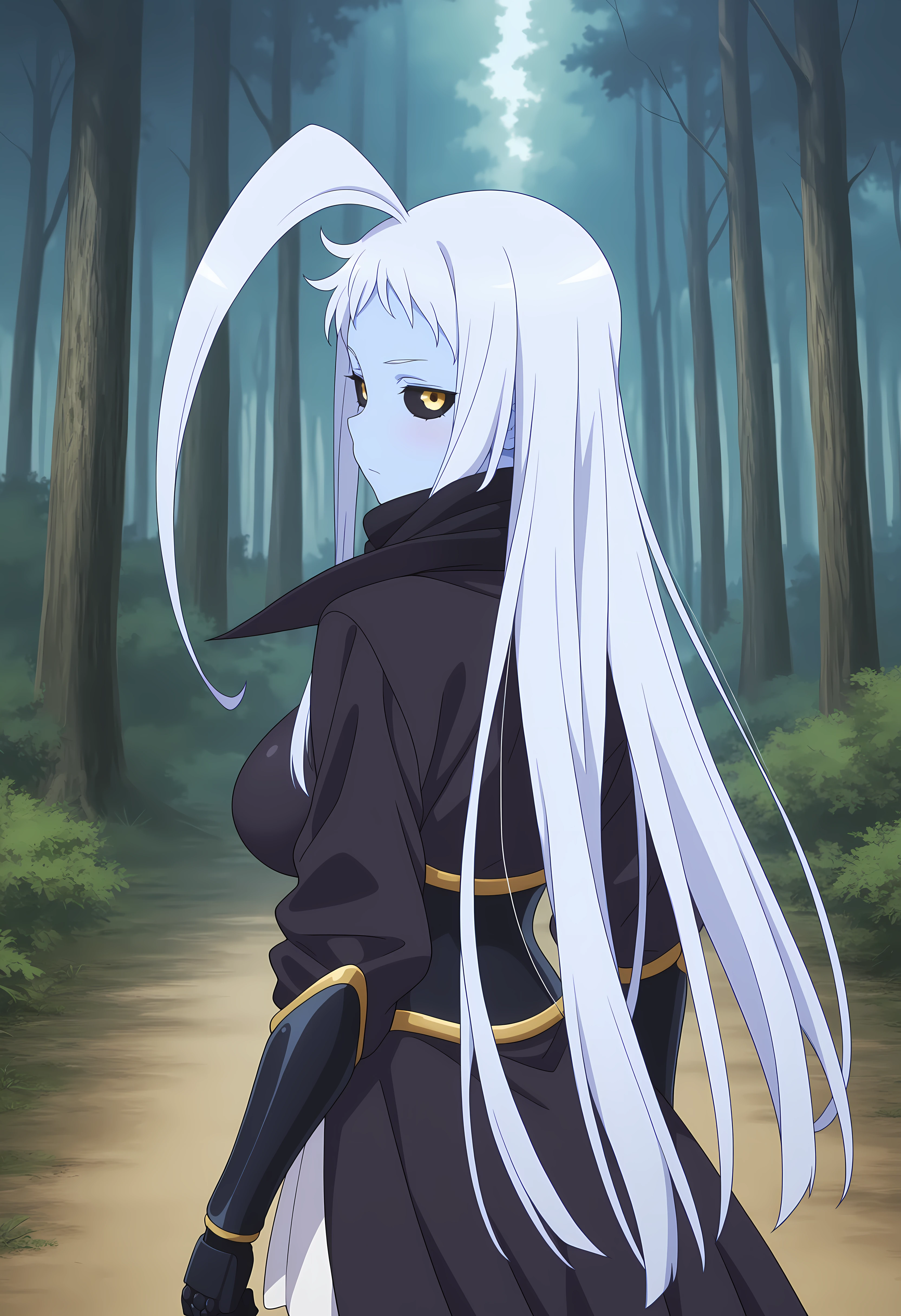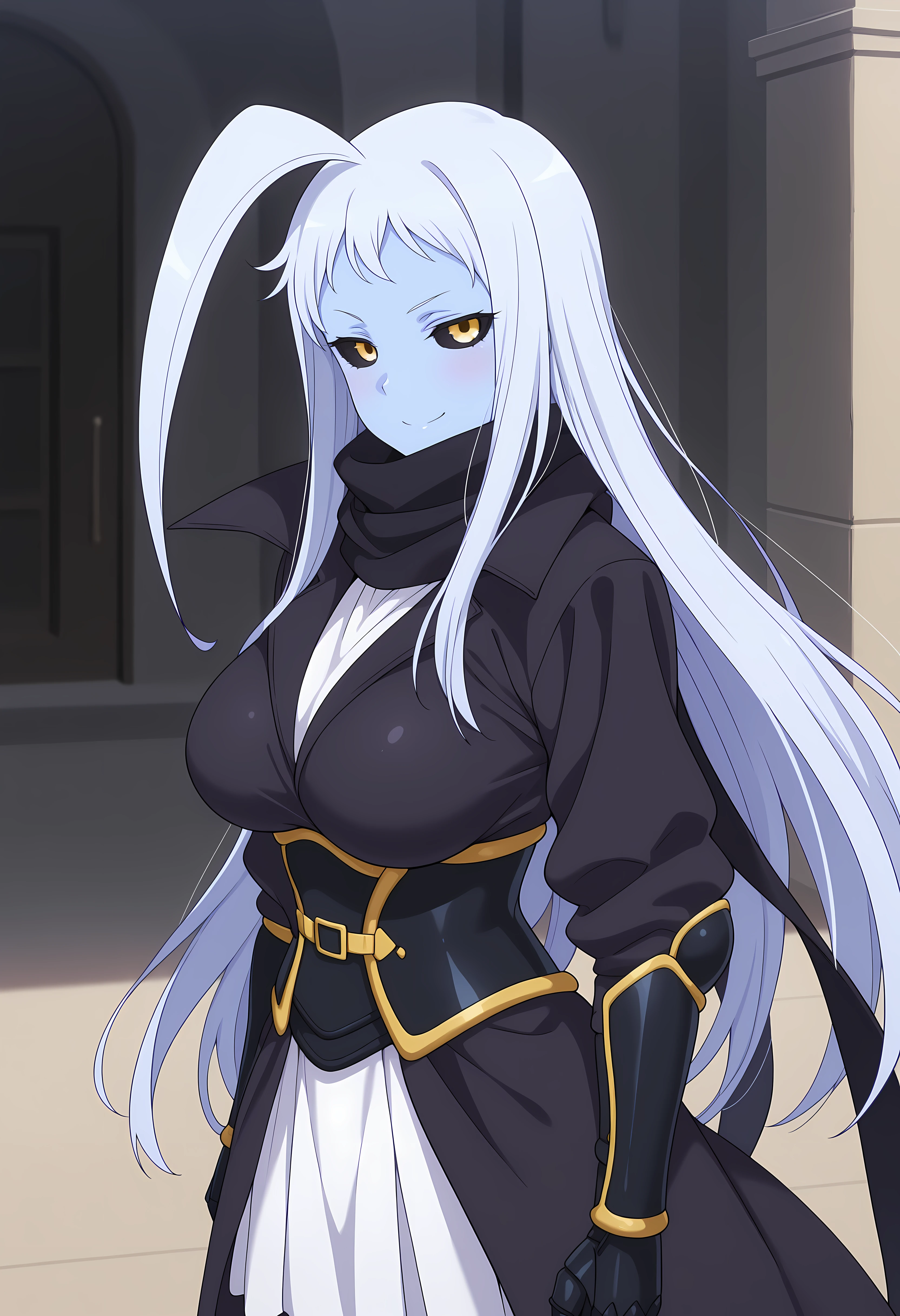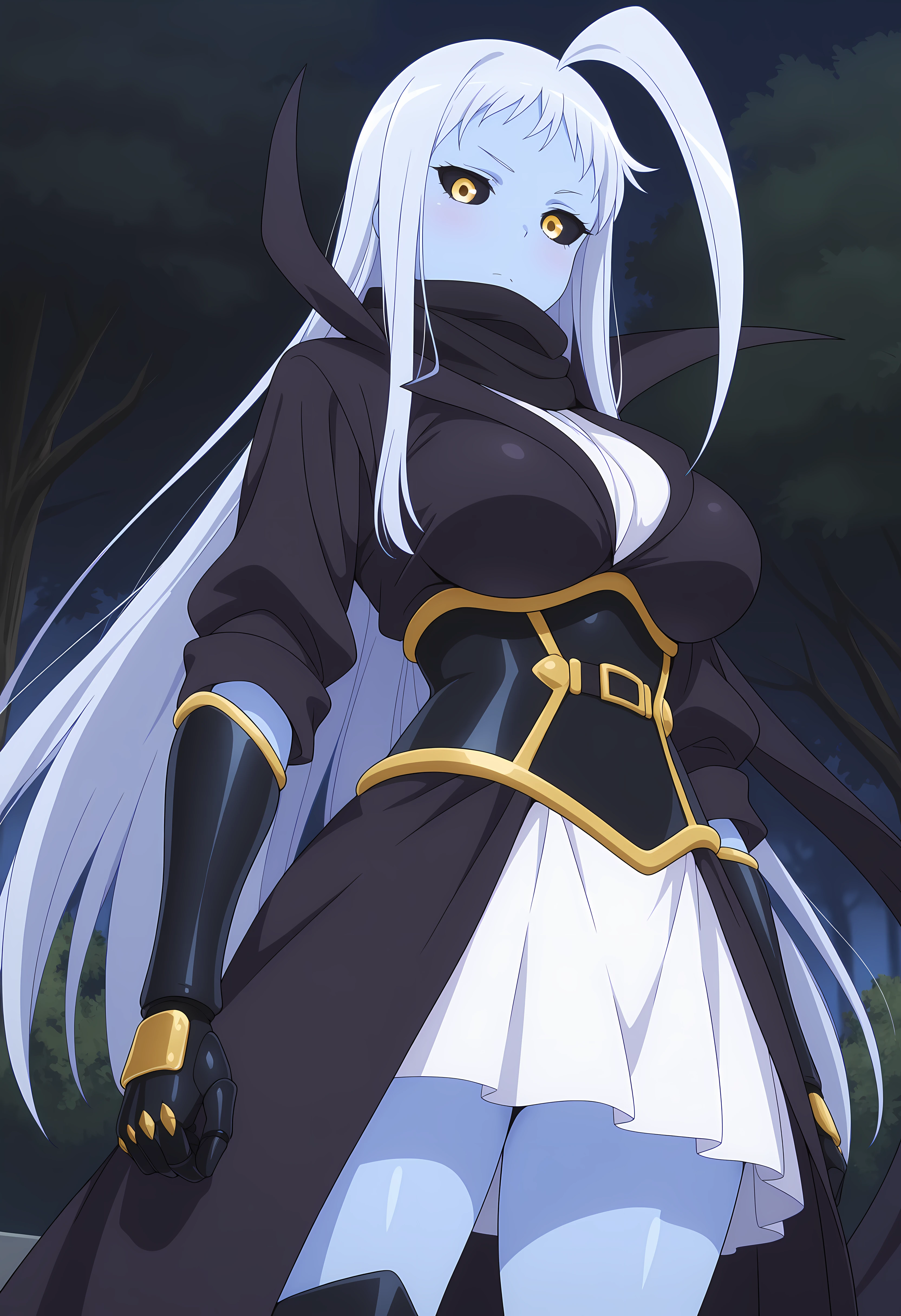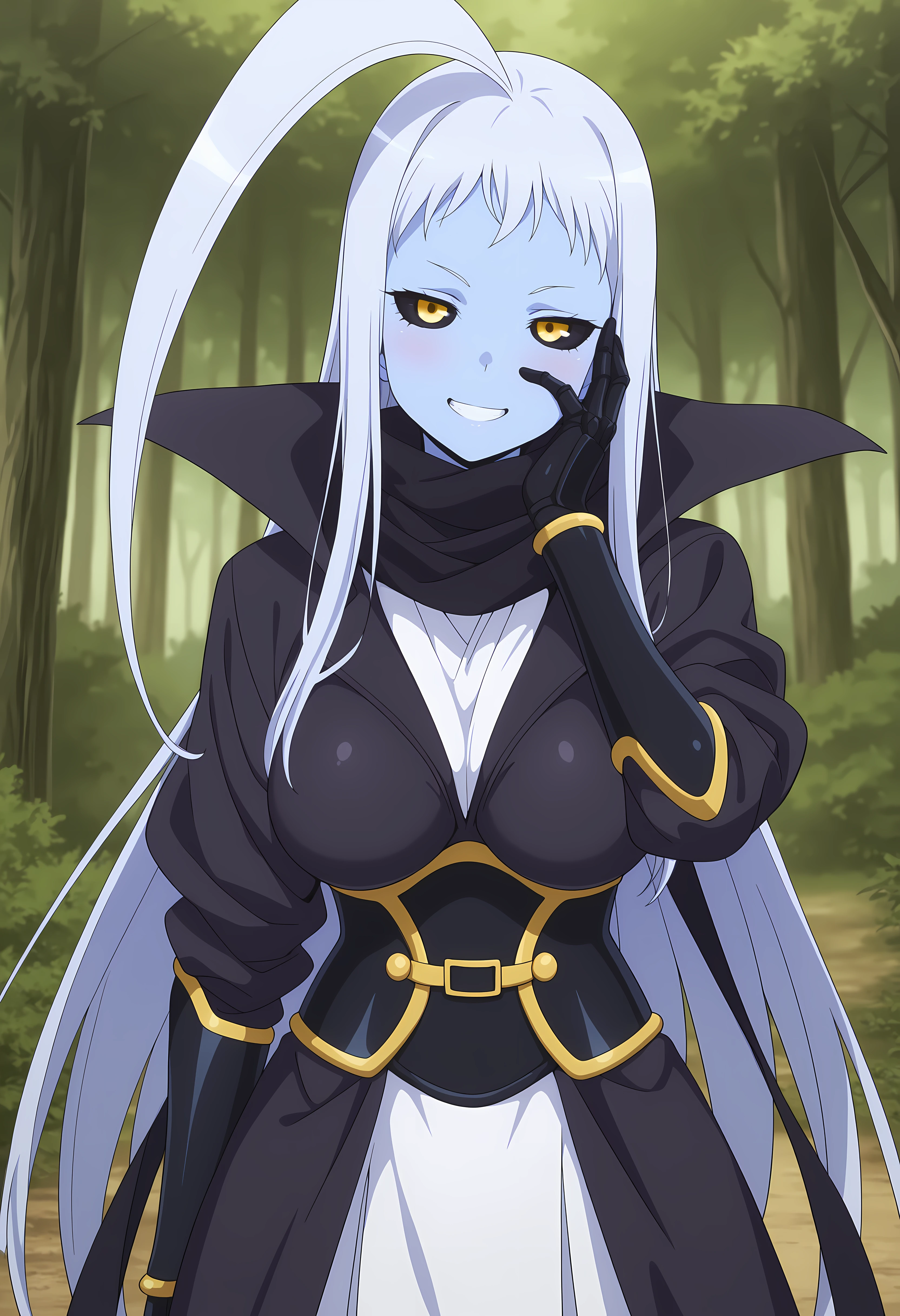 LalaMM, 1girl, blue skin, white hair, long hair, black-yellow eyes, black sclera,