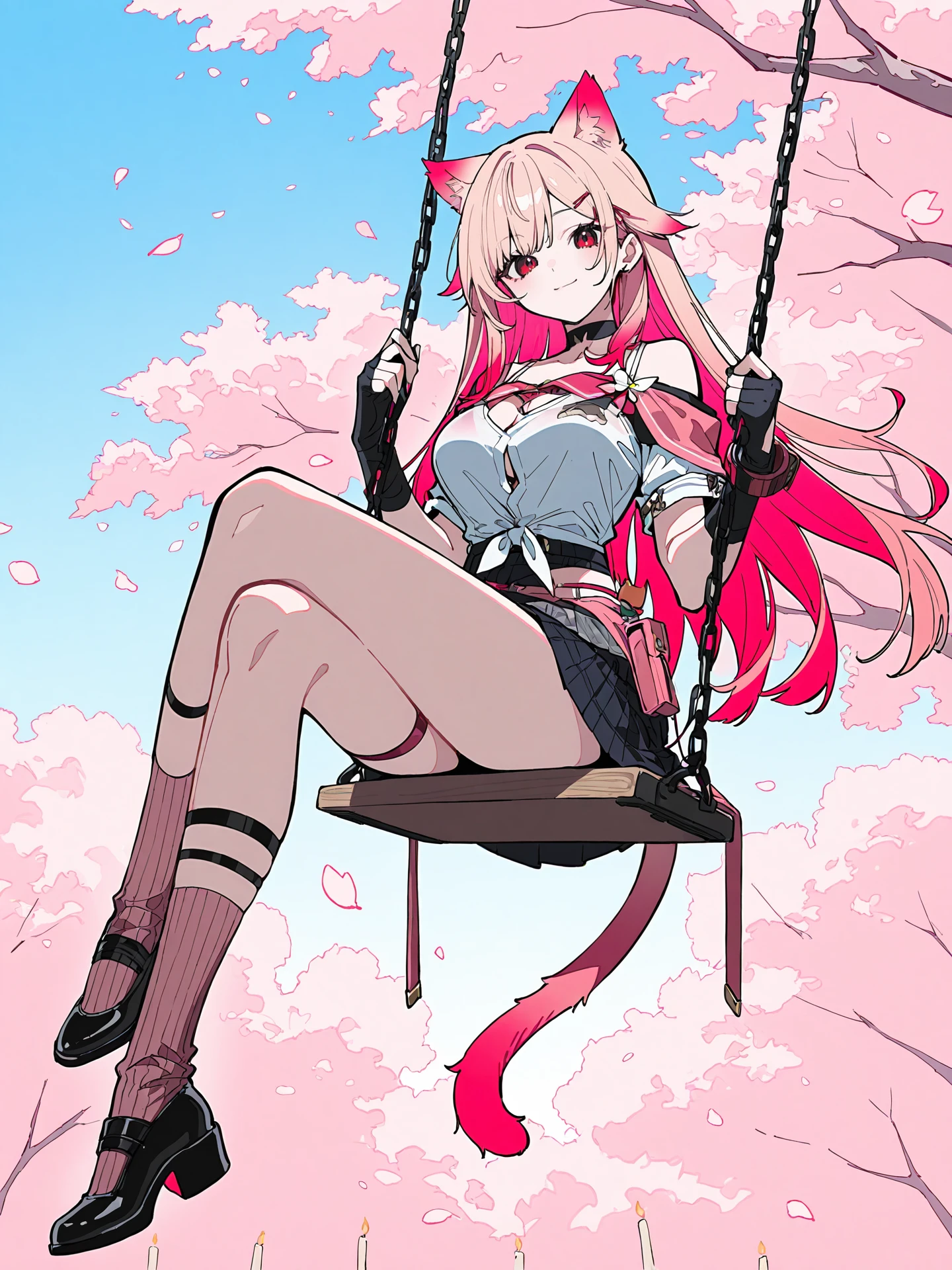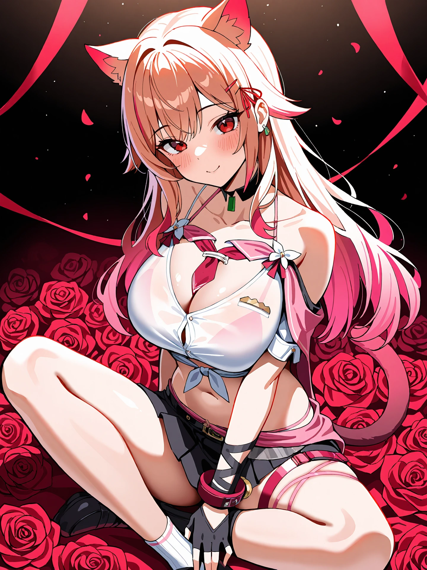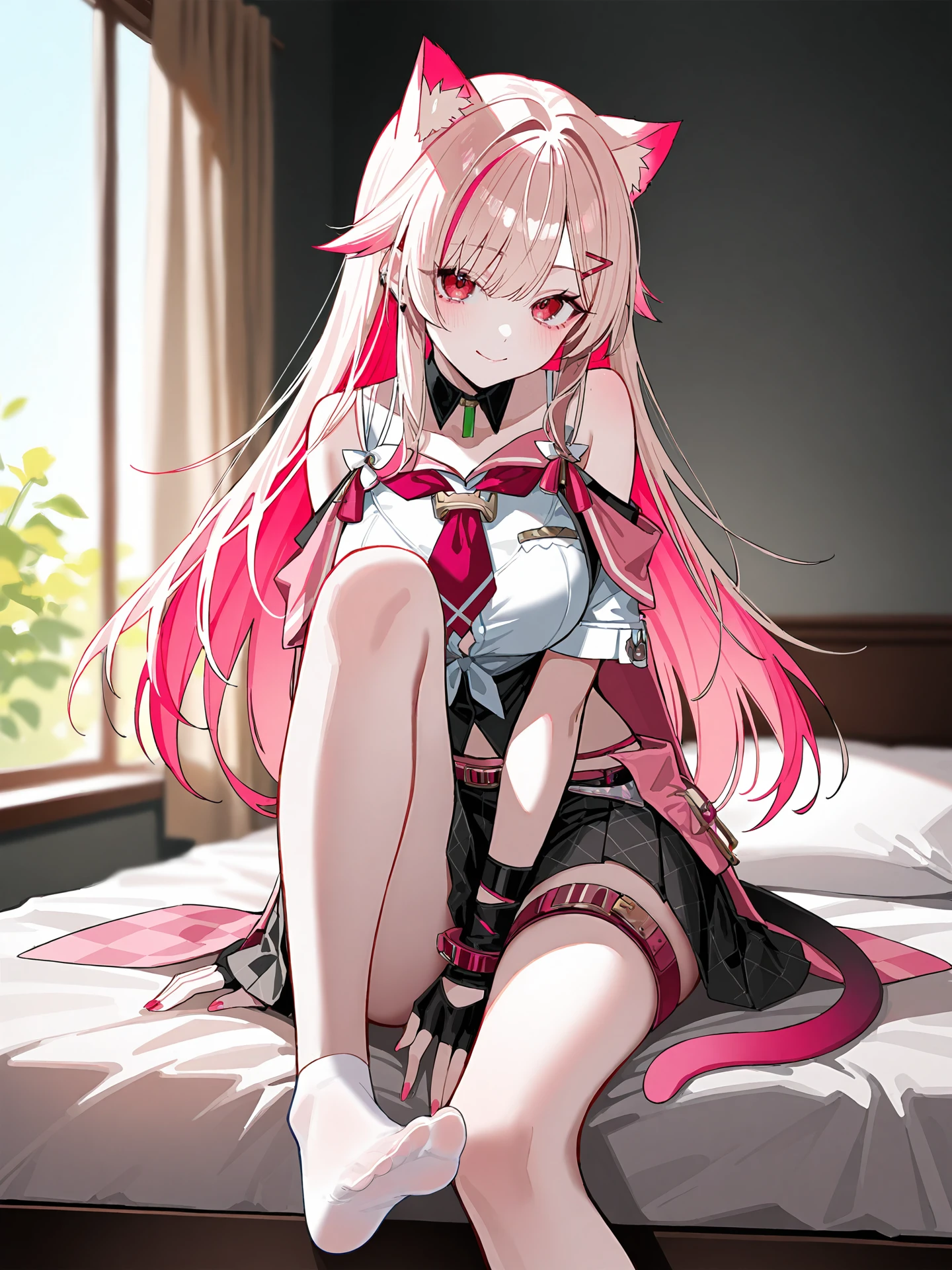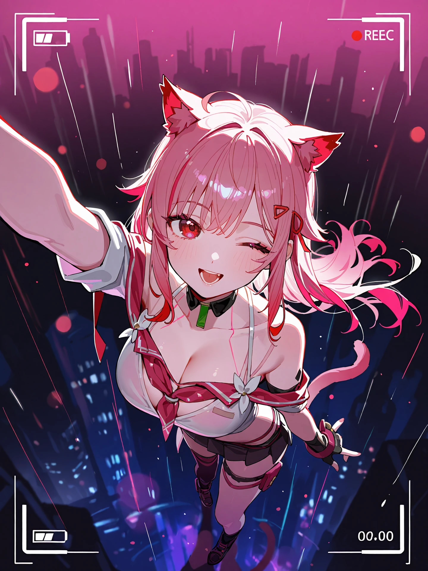 提示词:Mia, Mia-Starchaser, multicolored hair, pink hair, light bloden hair, red eyes, cat ears, hair ornament, tail,
