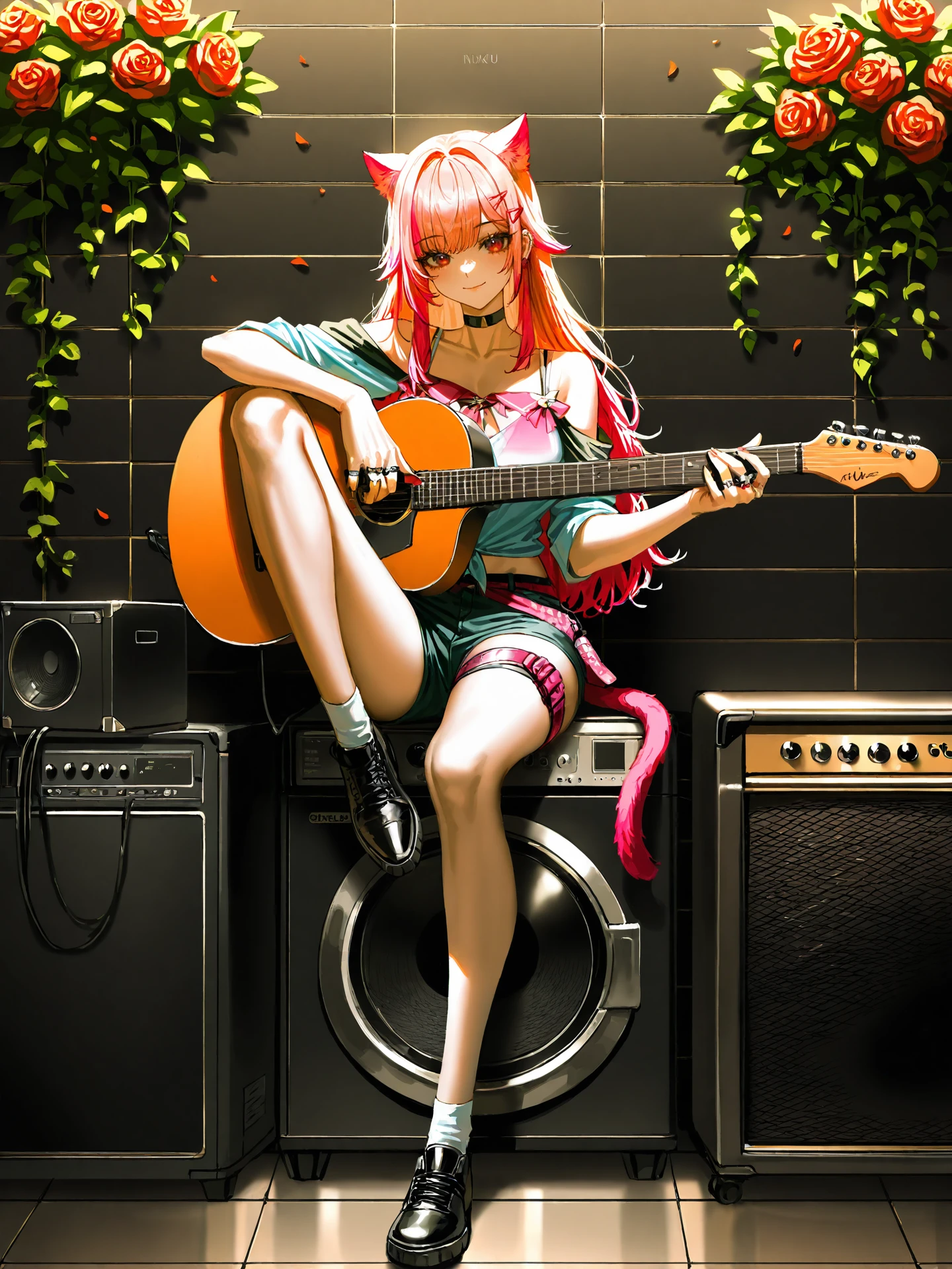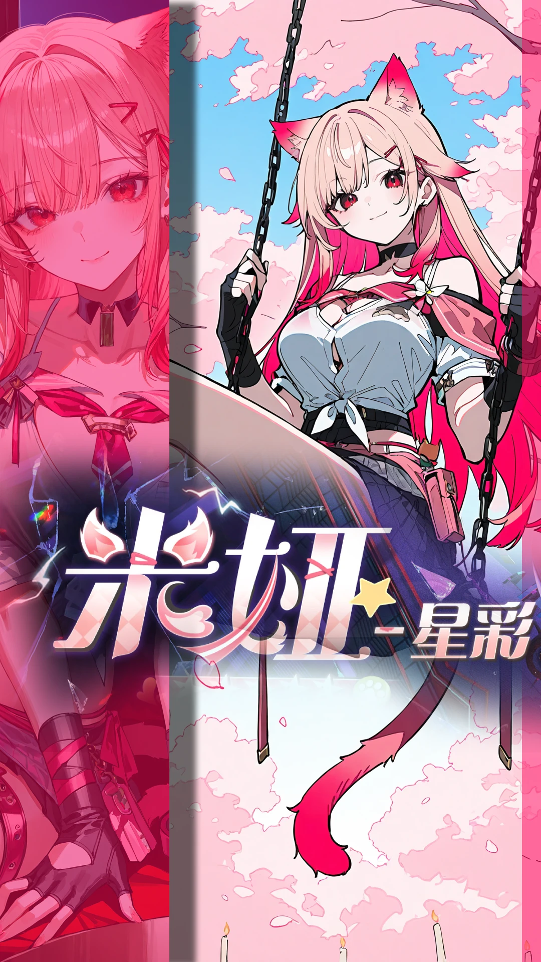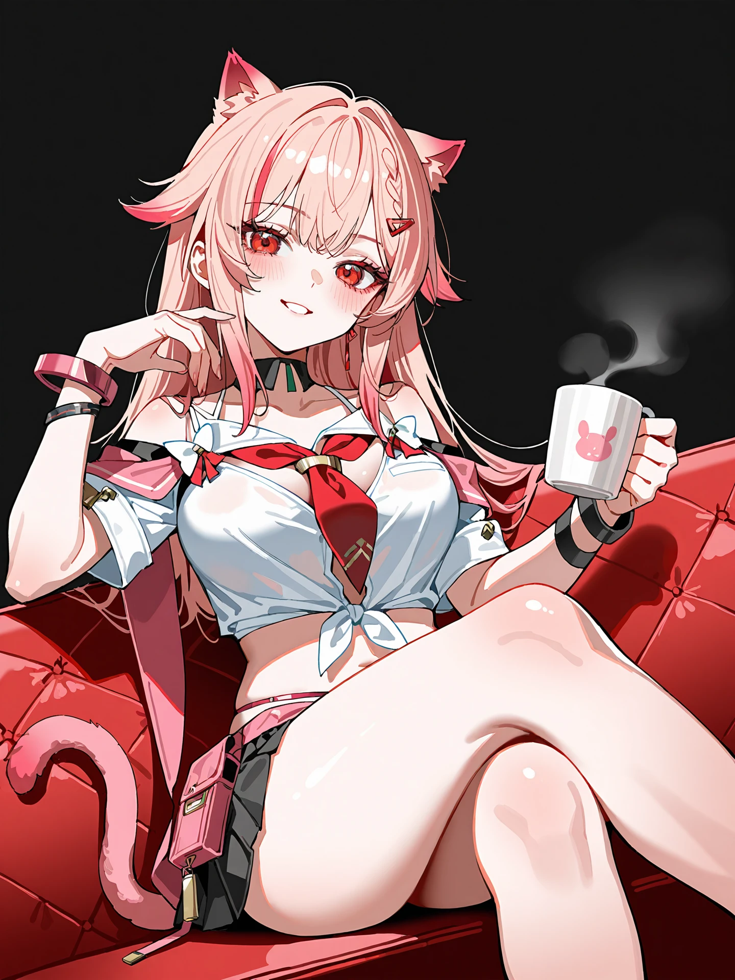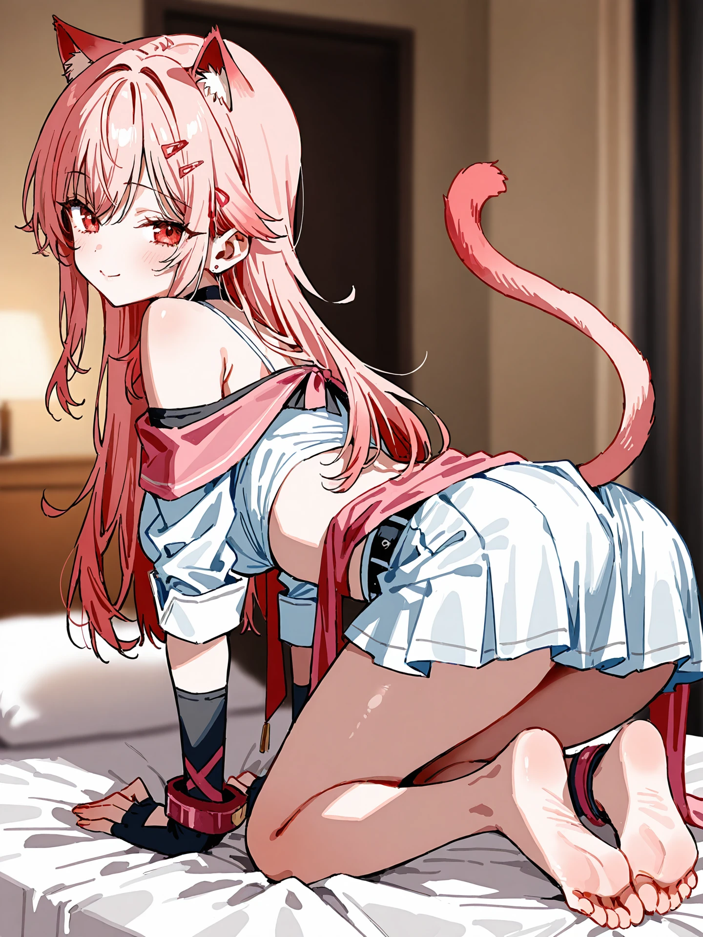 提示词:Mia, Mia-Starchaser, multicolored hair, pink hair, light bloden hair, red eyes, cat ears, hair ornament, tail,