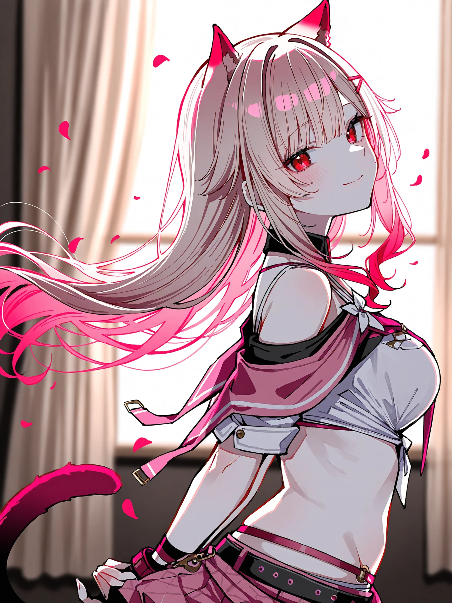 Prompt Words: Mia, Mia-Starchaser, multicolored hair, pink hair, light bloden hair, red eyes, cat ears, hair ornament, tail,