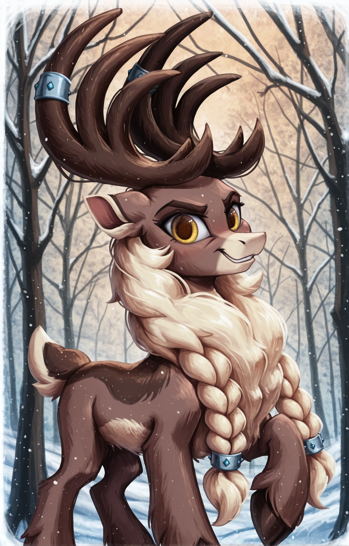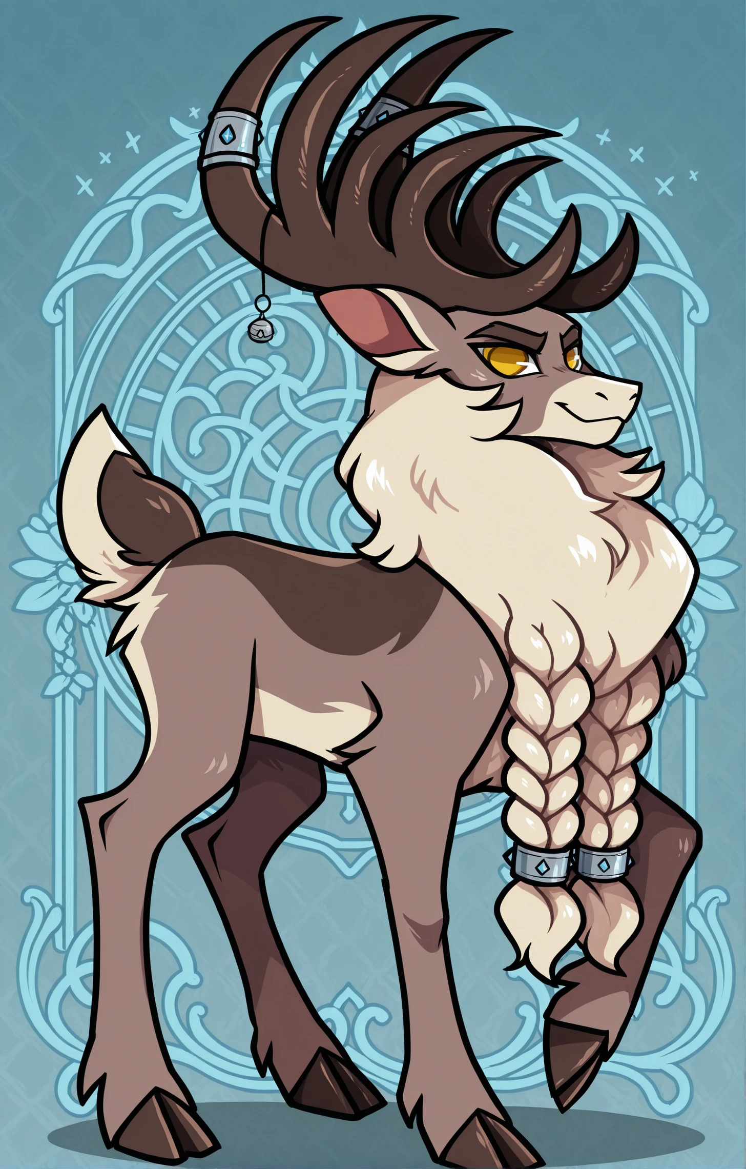 large build, with a thick, light-colored mane braided into braids. Large, branched antlers are adorned with blue decorative elements. His eyes are bright yellow, his body color is dark and light brown, with a cream-colored mane and lower muzzle. Stronghoof TFH, male reindeer, large deer, tail