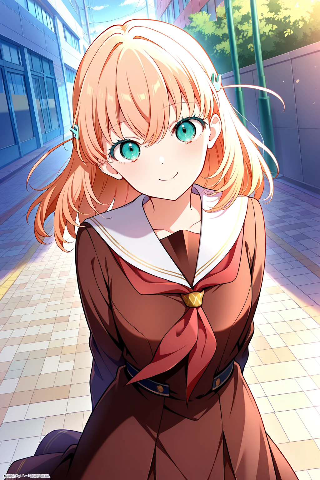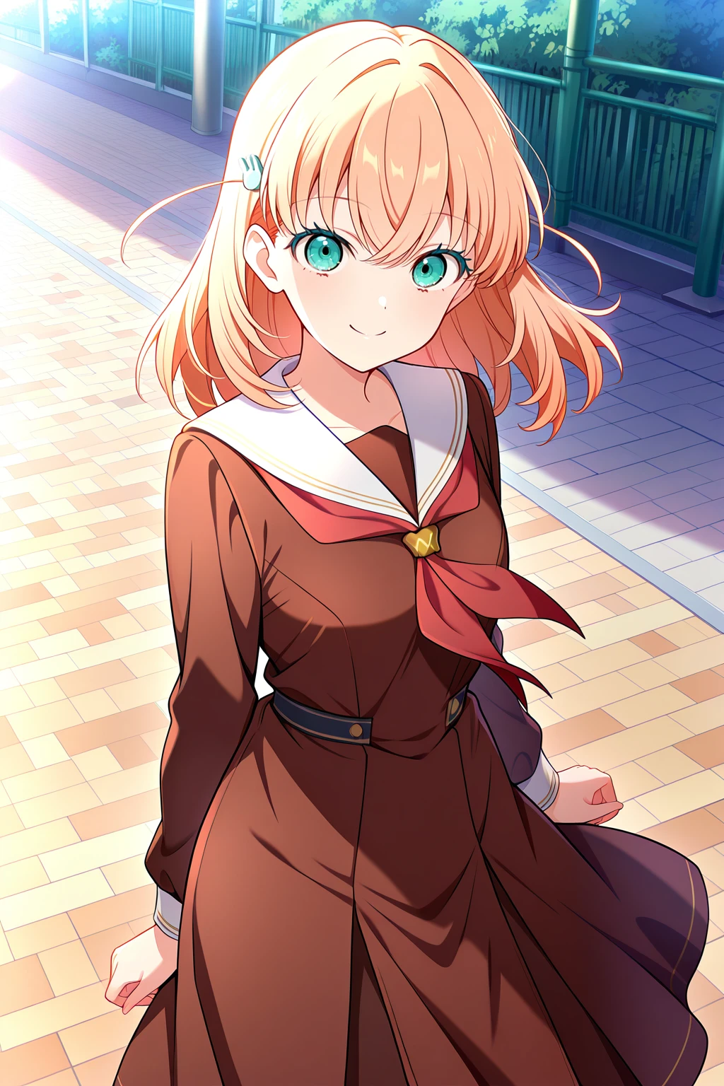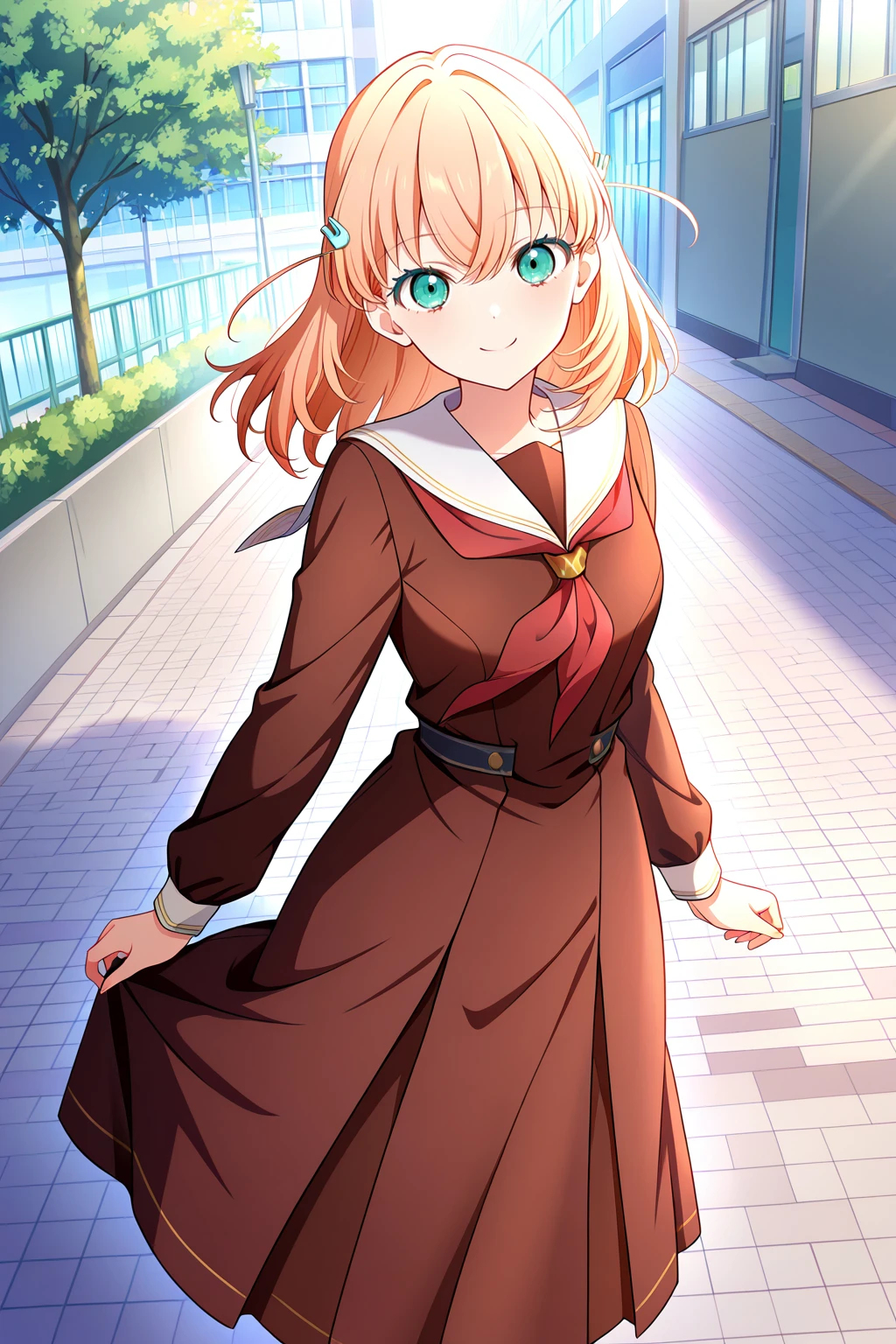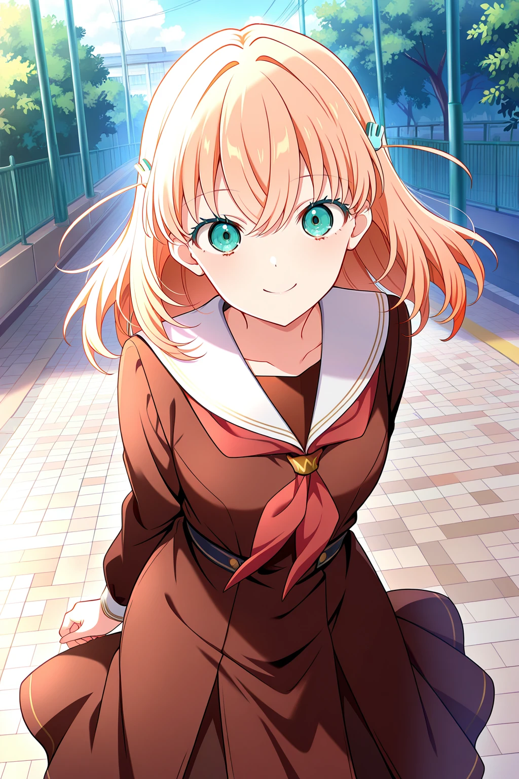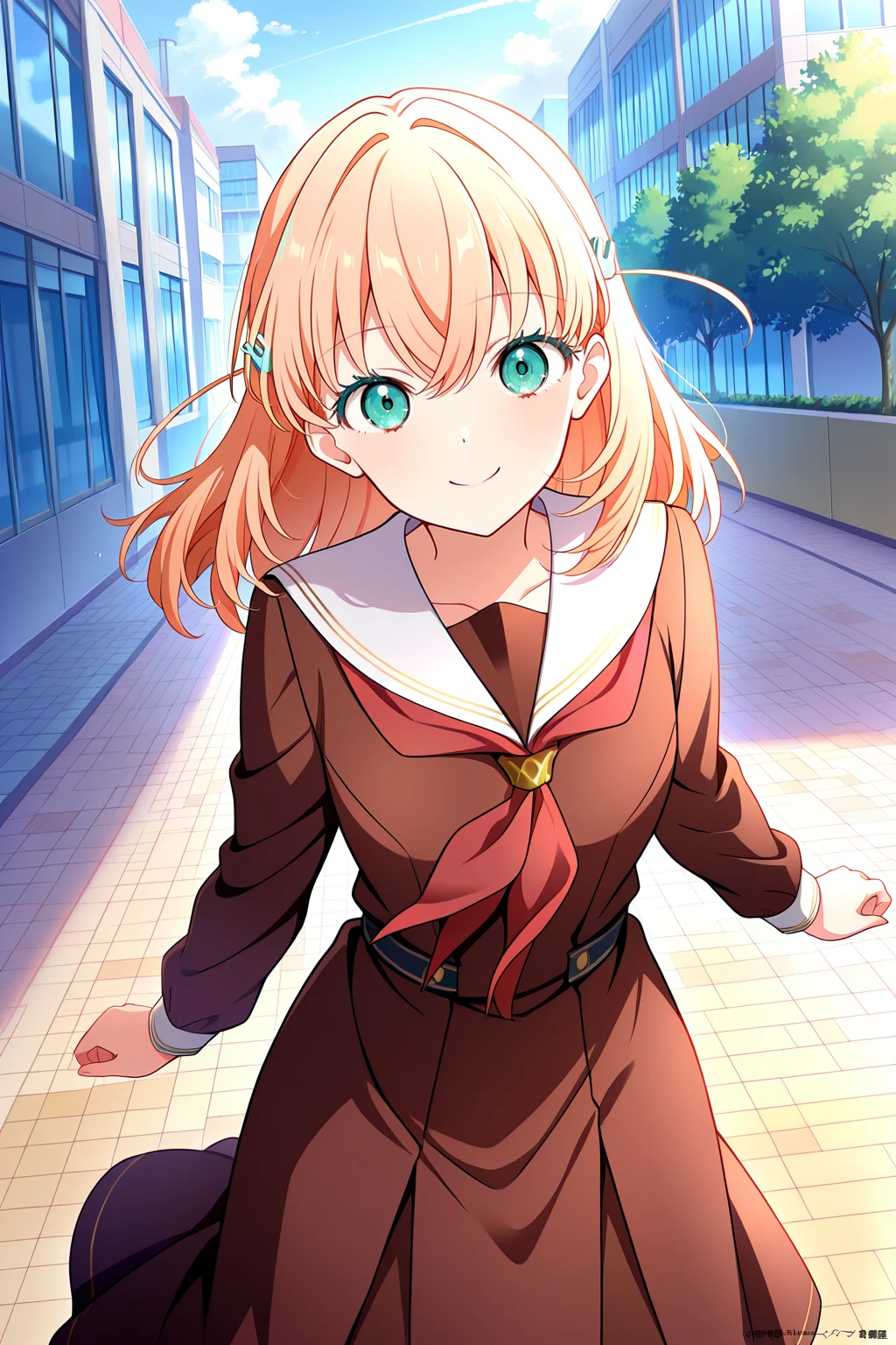 hinoshita kaho, aqua eyes, green eyes, crossed bangs, hair ornament, medium hair, rabbit hair ornament, two side up, brown dress, dress, hasu no sora school uniform, long sleeves, neckerchief, pleated dress, red neckerchief, sailor collar, sailor dress, school uniform, white sailor collar, winter uniform,