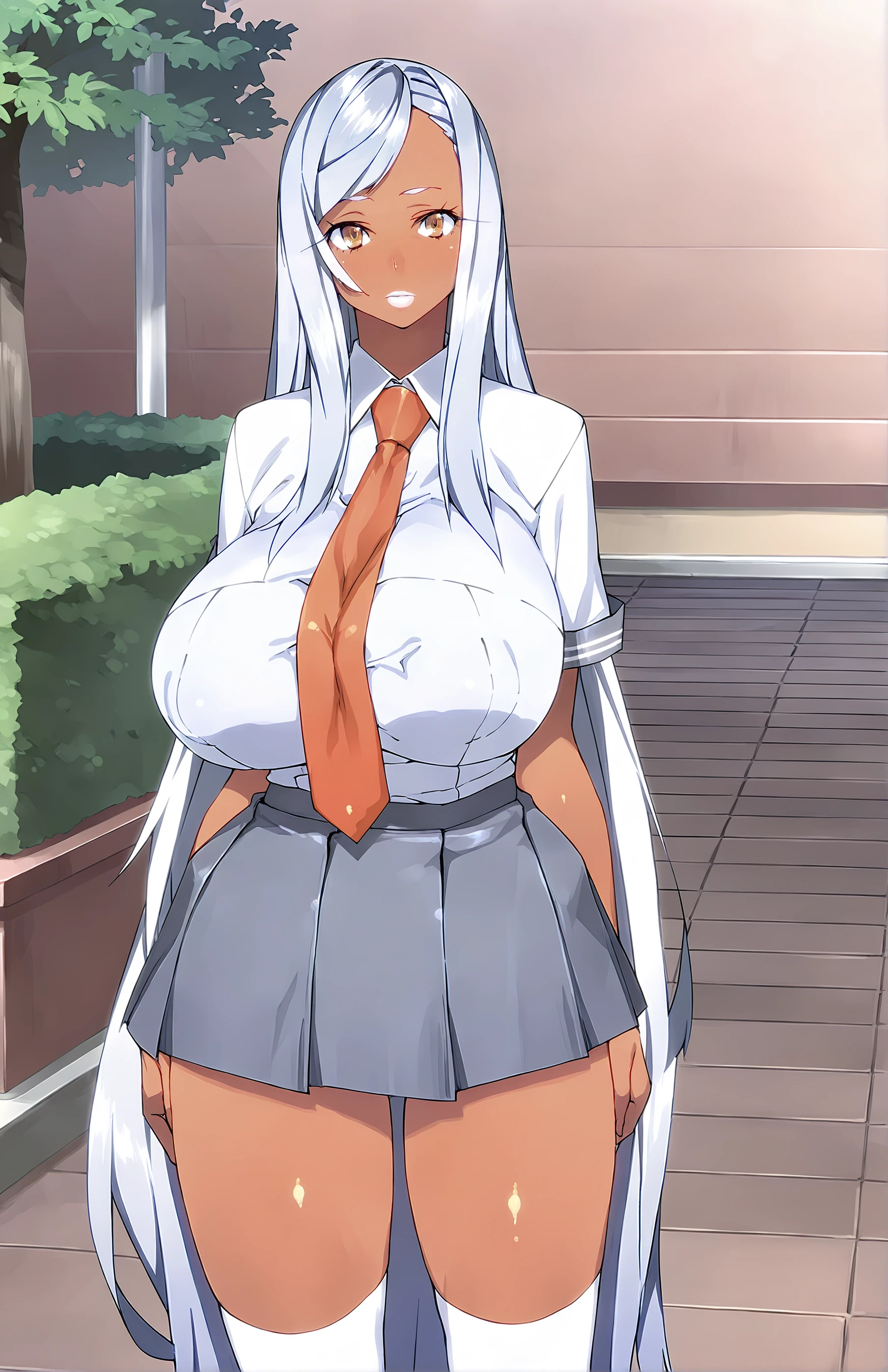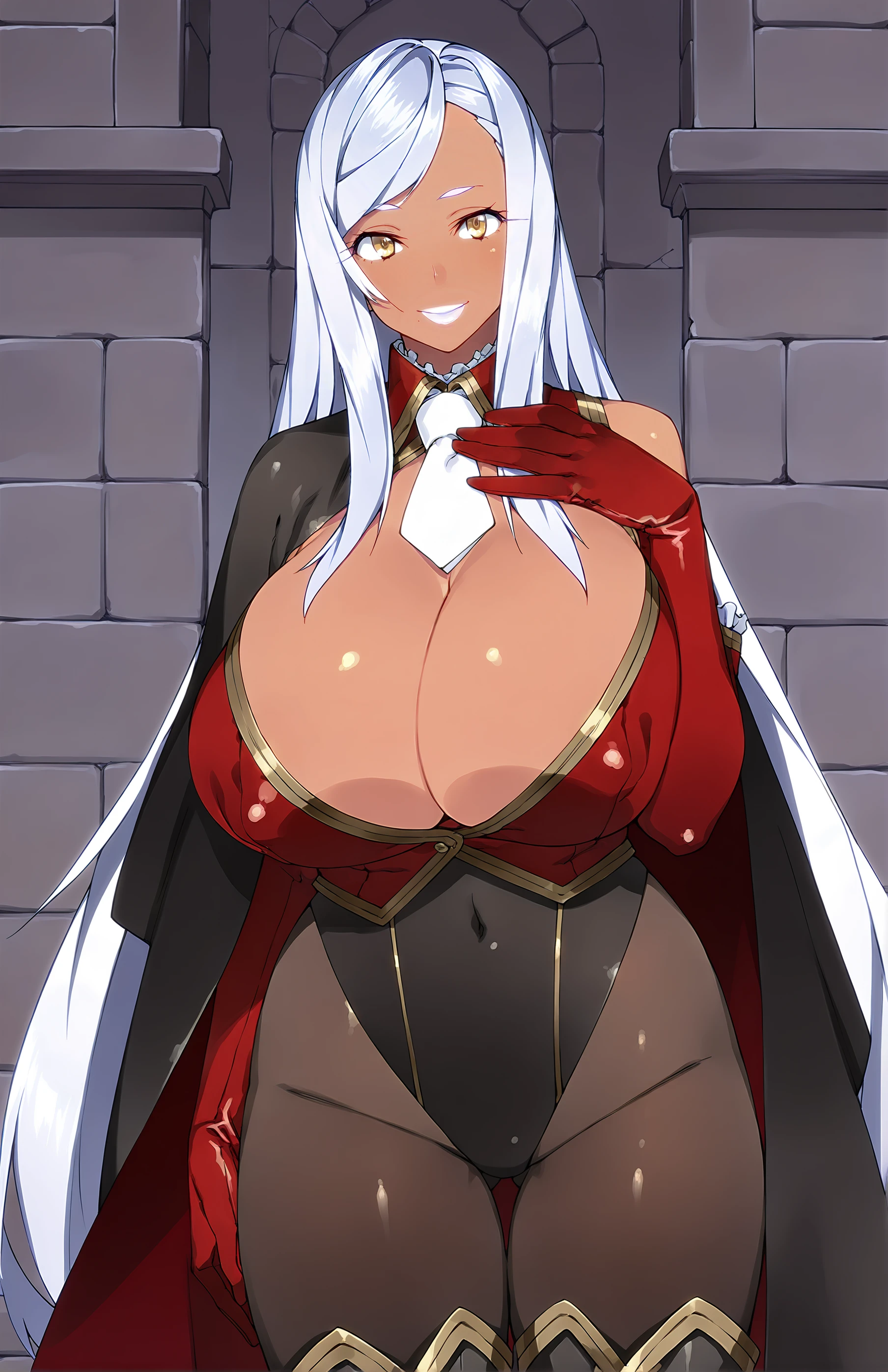 MitsukoSujata, long hair, breasts, large breasts, very long hair, yellow eyes, white hair, dark skin, huge breasts, dark-skinned female, white lips