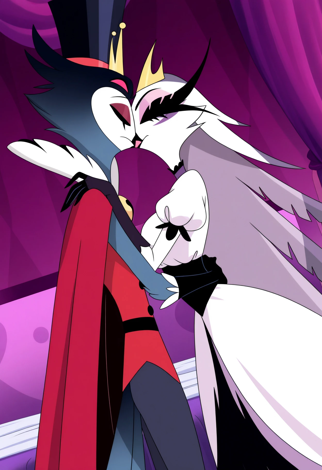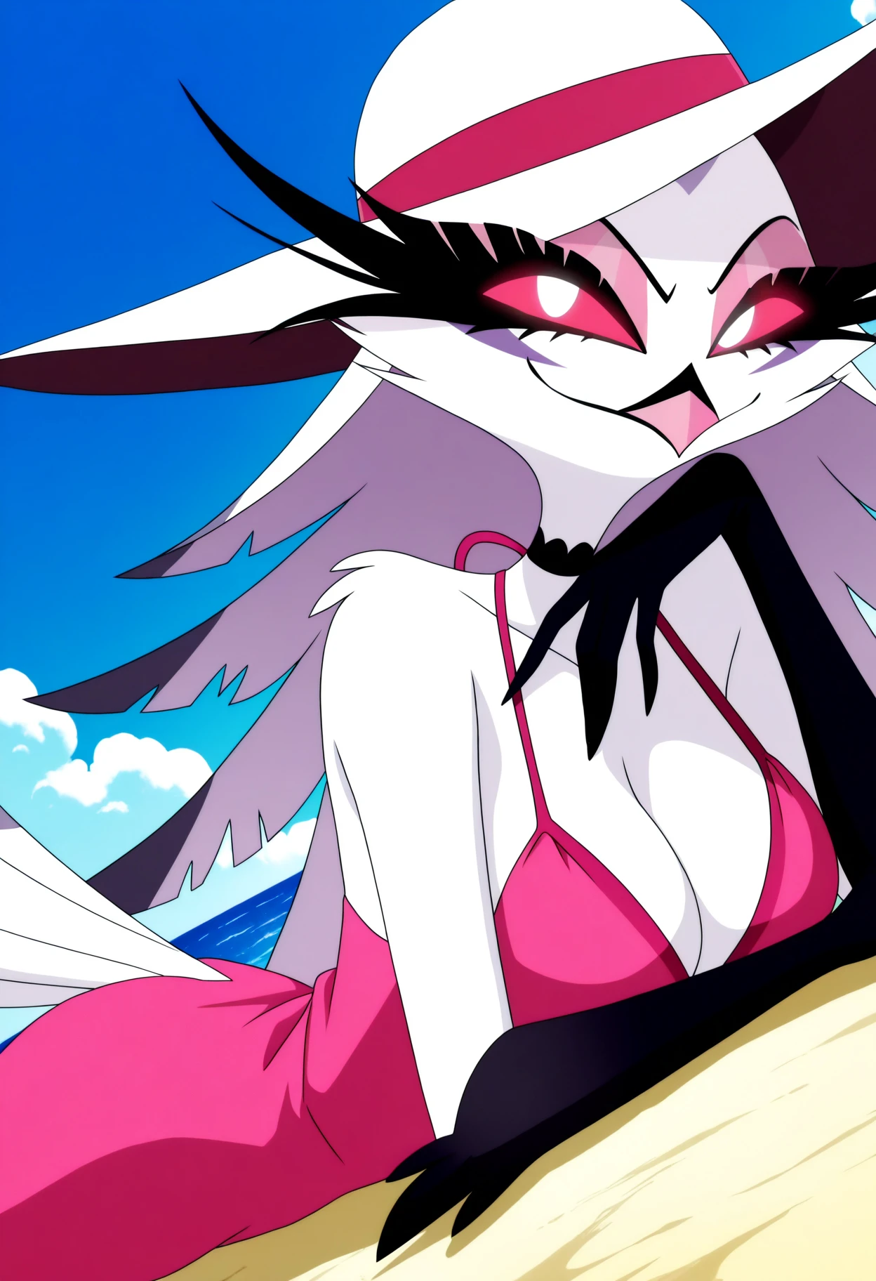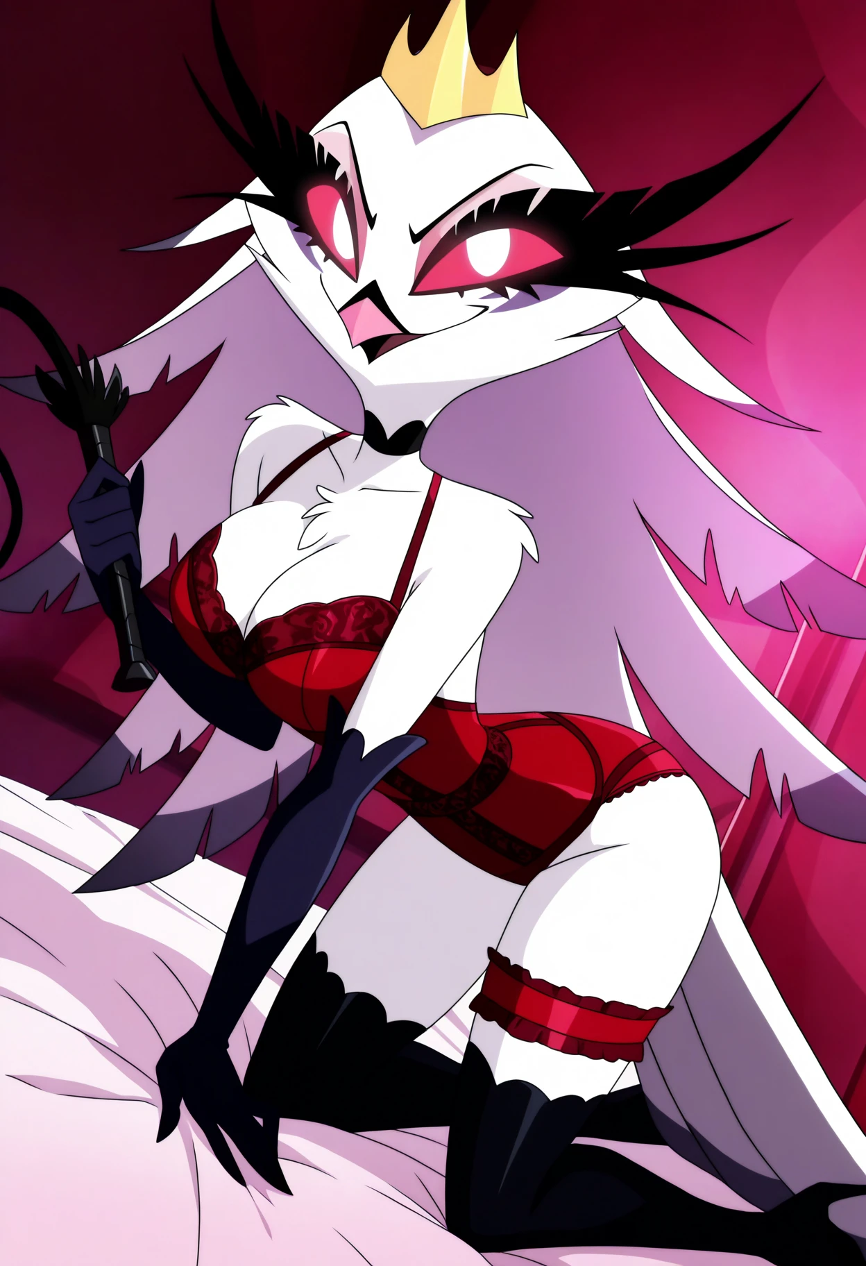 stella \(helluva boss\), stella,furry female, owl, demon owl, red eyes, white pupils, long eyelashes, white body, white feathers, feather hair, long hair, eyeshadow, beak, pink beak, bird tail, tail feathers