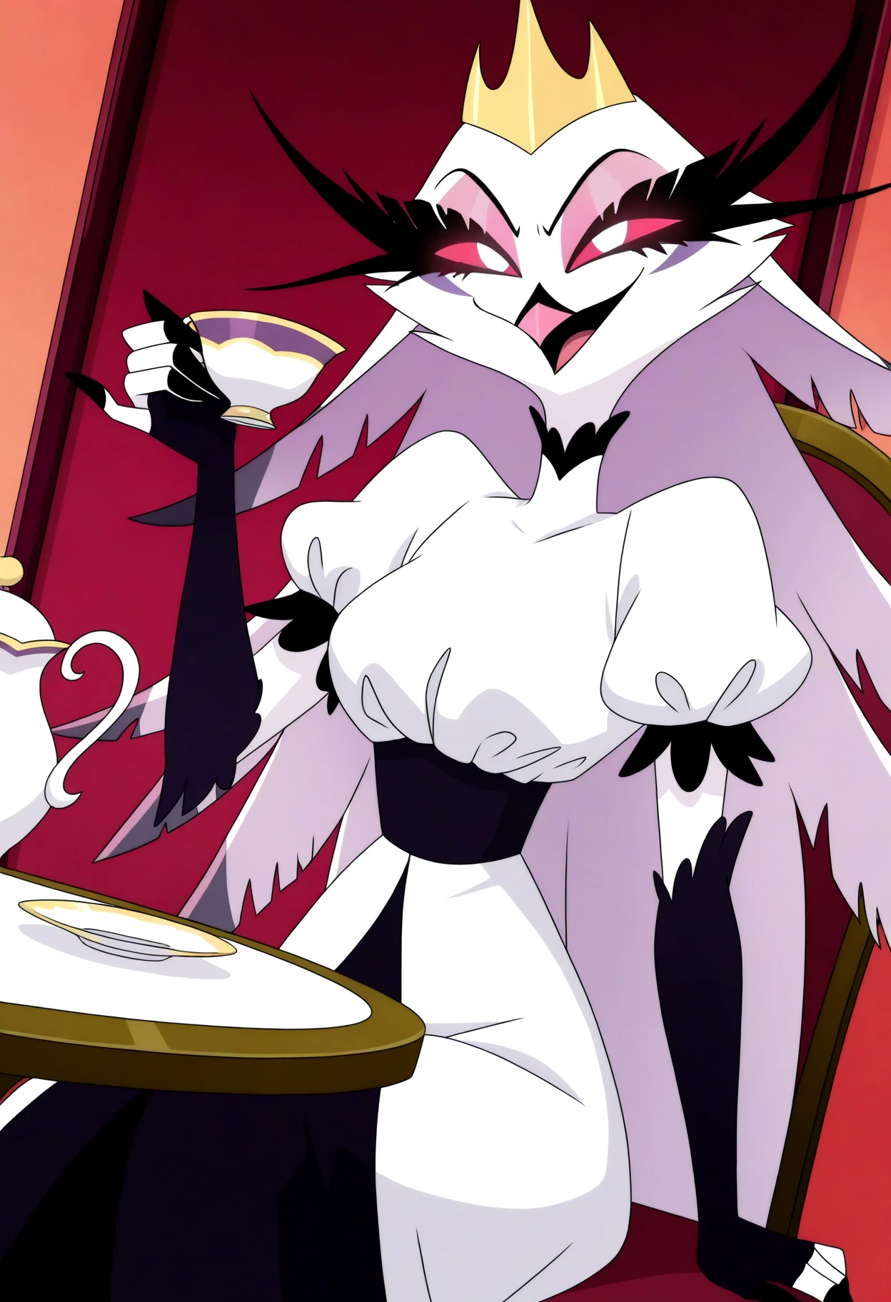 stella \(helluva boss\), stella,furry female, owl, demon owl, red eyes, white pupils, long eyelashes, white body, white feathers, feather hair, long hair, eyeshadow, beak, pink beak, bird tail, tail feathers, white dress