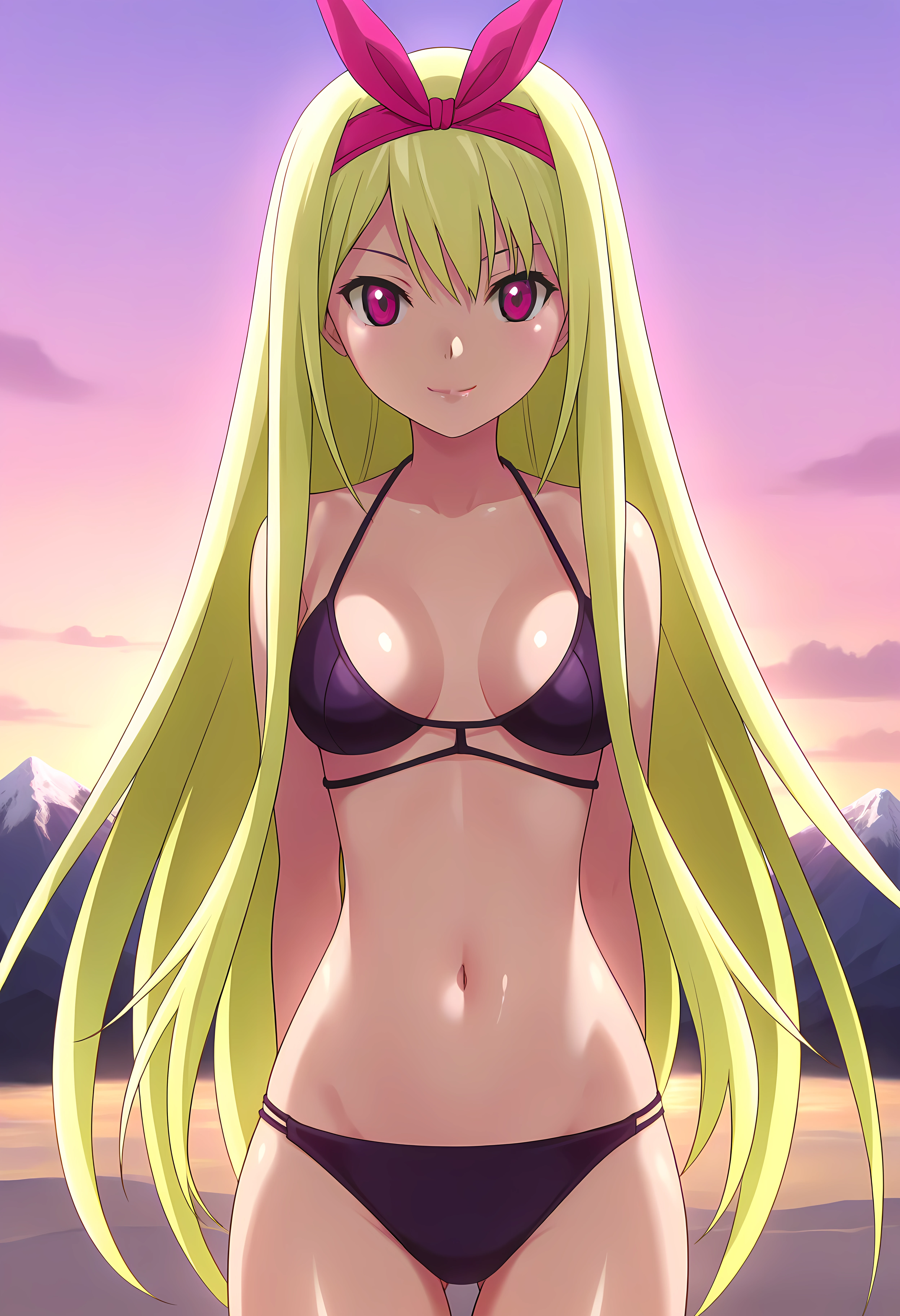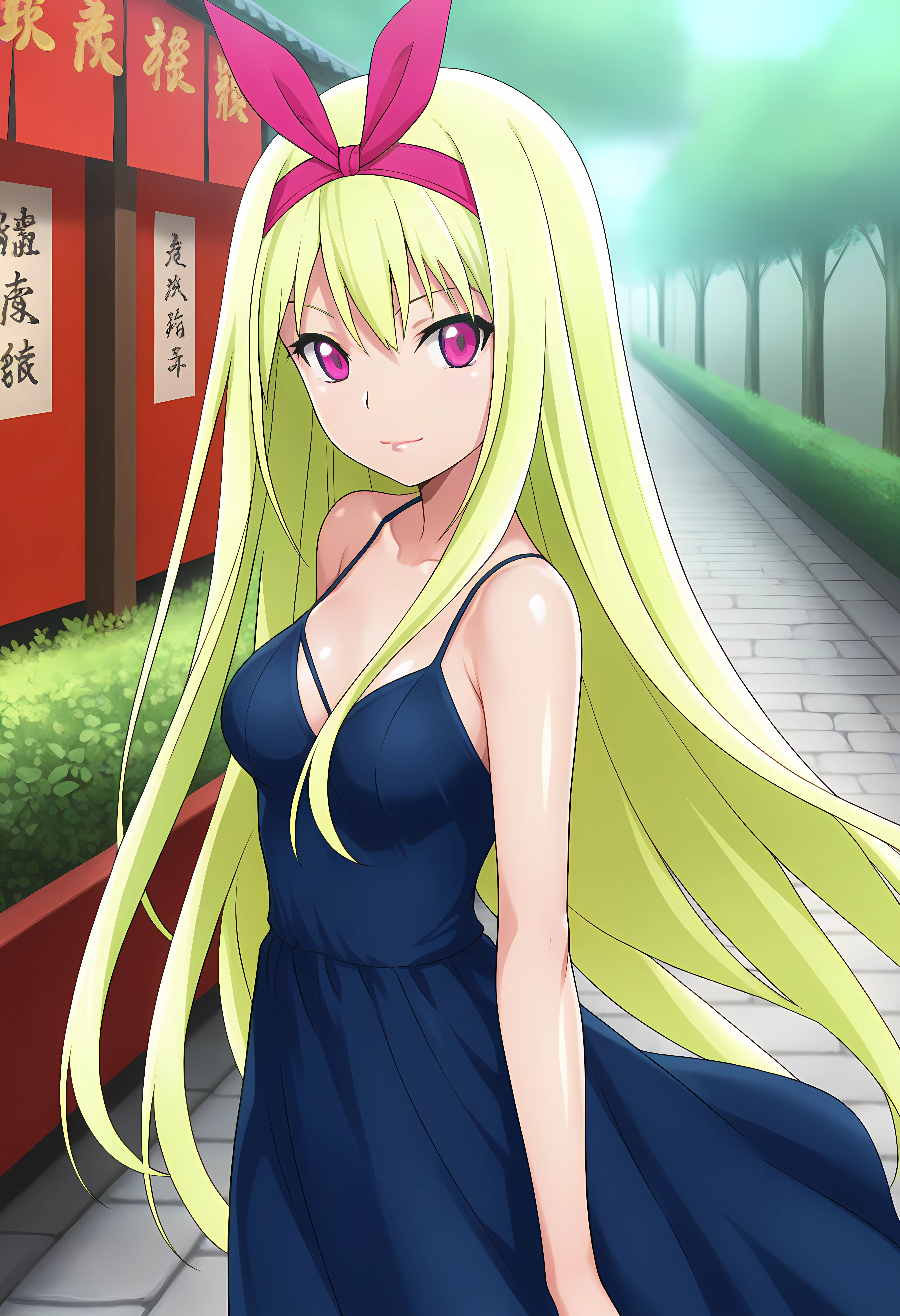 Appearance → ohwx, blonde_hair, long_hair, 1girl, hairband, ribbon, breasts, very_long_hair, hair_ribbon, red_eyes, pink_eyes, large_breasts, medium_breasts, pink_hairband, short_hair, hair_between_eyes, hair_bow, red_hairband,